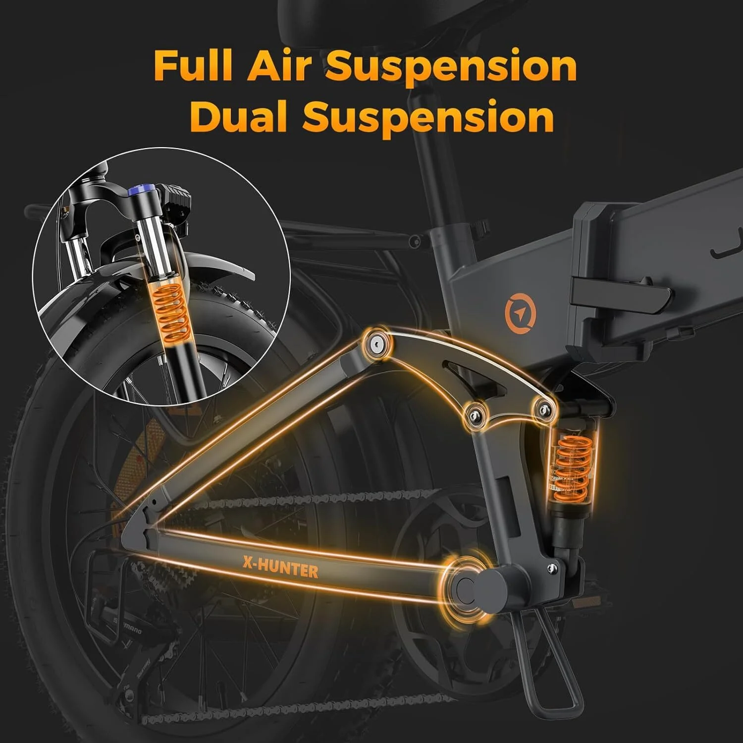 X-Hunter employs a front fork with manually adjustable shock absorption and a four-link mechanism to achieve a high-intensity suspension effect for the entire bike. The multi-link suspension configuration enables integrated dissipation of forces, allowing X-Hunter to bear a load capacity of up to 480 pounds. Whether navigating snowy terrain, rough surfaces, or mountain trails, it provides a stable and comfortable riding experience.