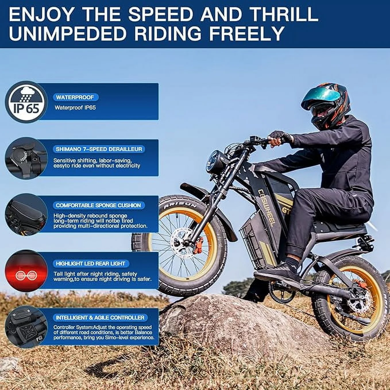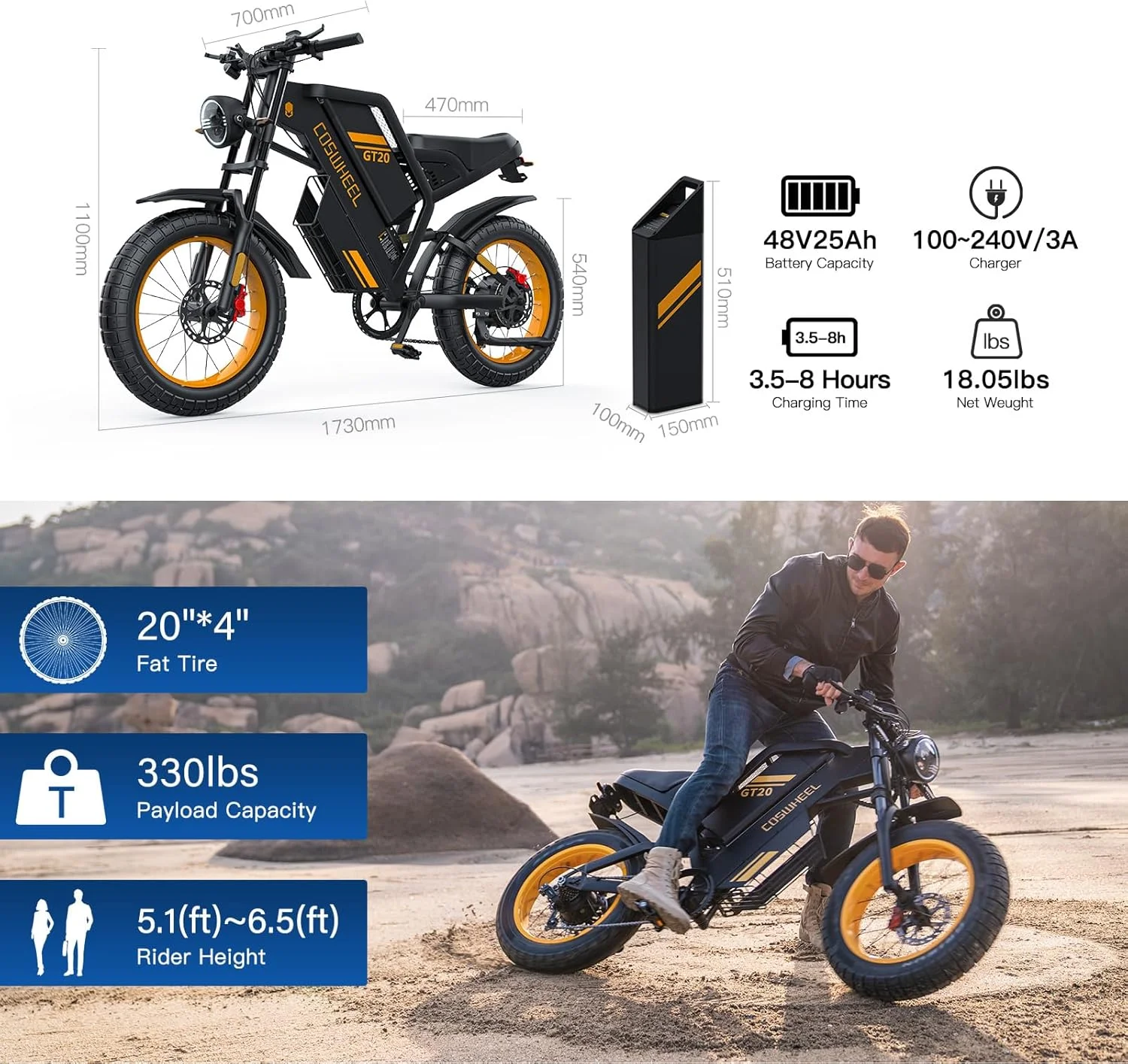 COSWHE GT20 Electric Bike for Adults, Electric Dirt Bike with 1500W Motor 48V/25ah Removable Battery, up to 31MPH & 93 Miles, Electric Motorcycle with 7 - Speed, 20" x 4.0 Fat Tire Ebikes for Adults