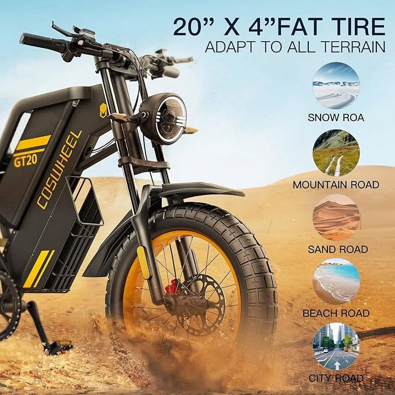 - ��High-Capacity Removable Battery��COSWHEEL GT20 long range E-Bike with 48V/25Ah battery with UL-certified and BMS system which its output stable and strong , high and low tem-perature adaptability, high discharge without fear of high load, to greatly improve the safety factor. It allows the fat tire electric bike to reach a range of 83-93 Miles per full charge for 3.5-8 hours so that it can meet riding or daily commute needs.