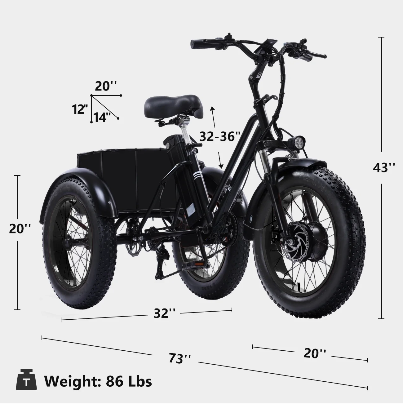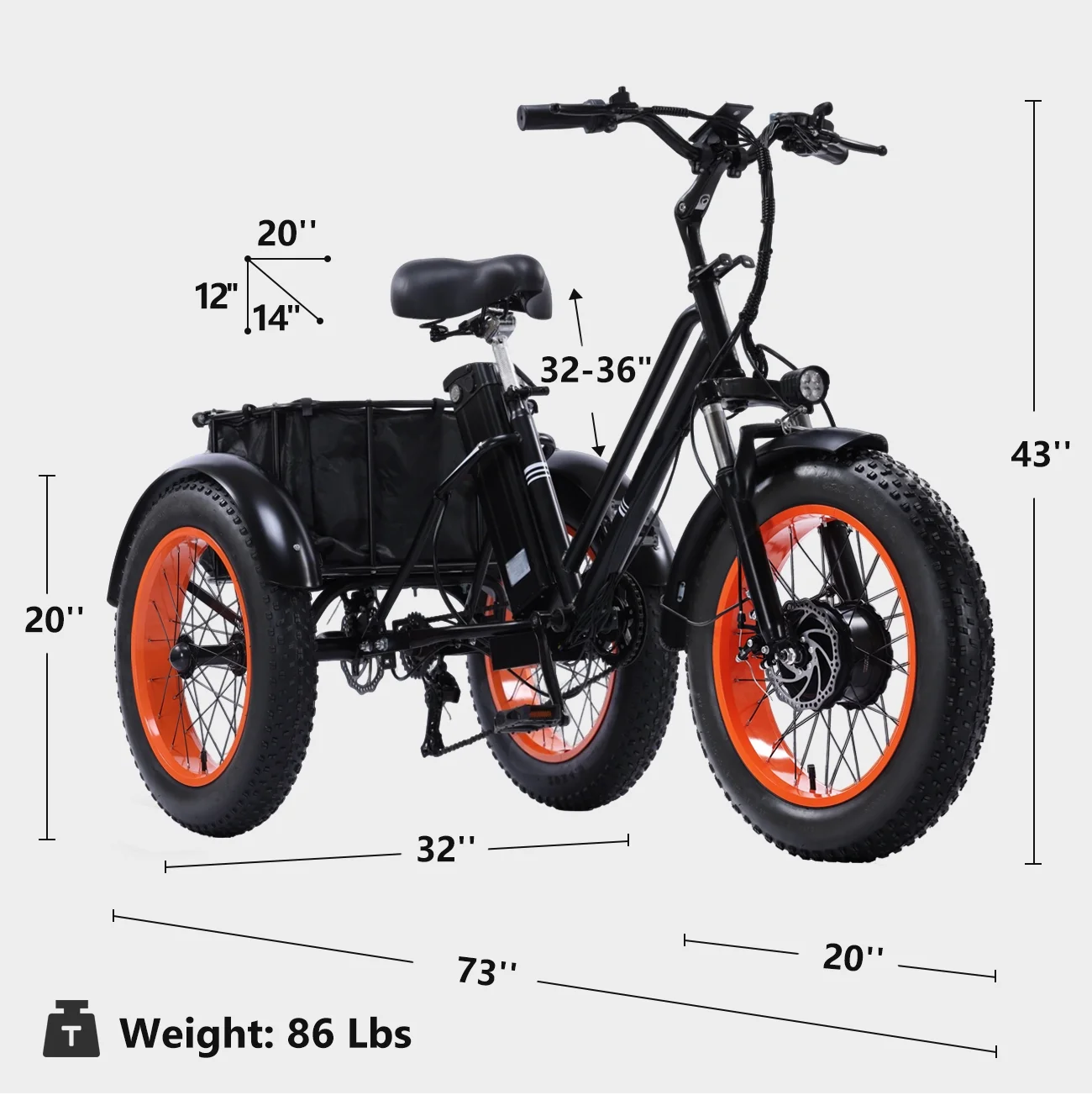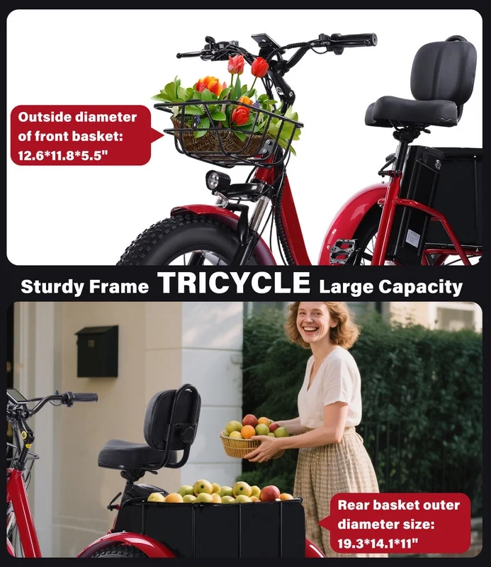 - Sturdy and Durable Construction: This high-performance, urban-style electric tricycle boasts a modern and streamlined design that appeals to both men and women. With a sturdy high-carbon steel frame, 20*40" fat tires aluminum alloy hubs, this adult e trike ensures easy handling and smooth rides across diverse terrains. Supports a maximum weight of 440 lbs, making it perfect for commuting, travel, and sightseeing adventures.