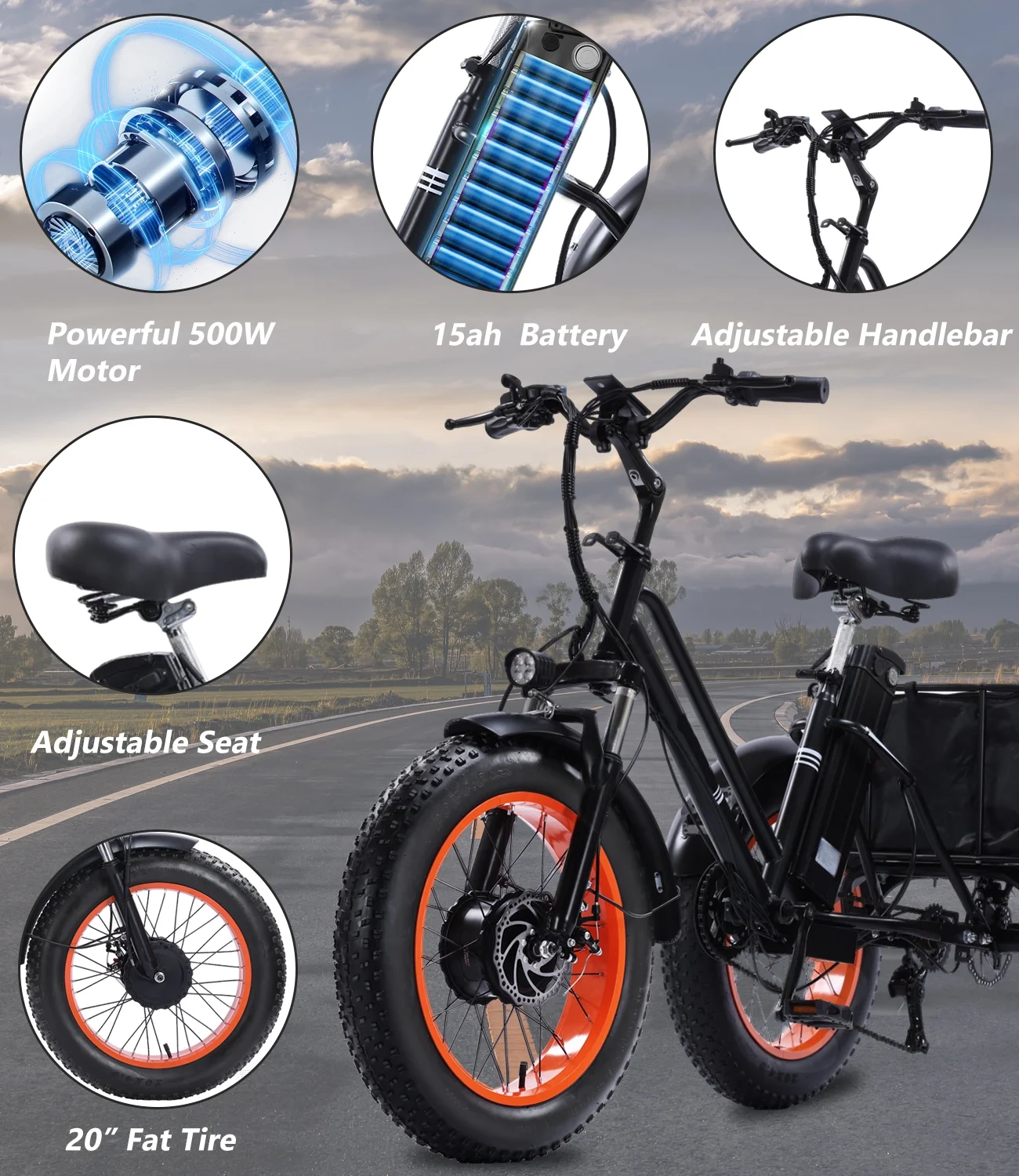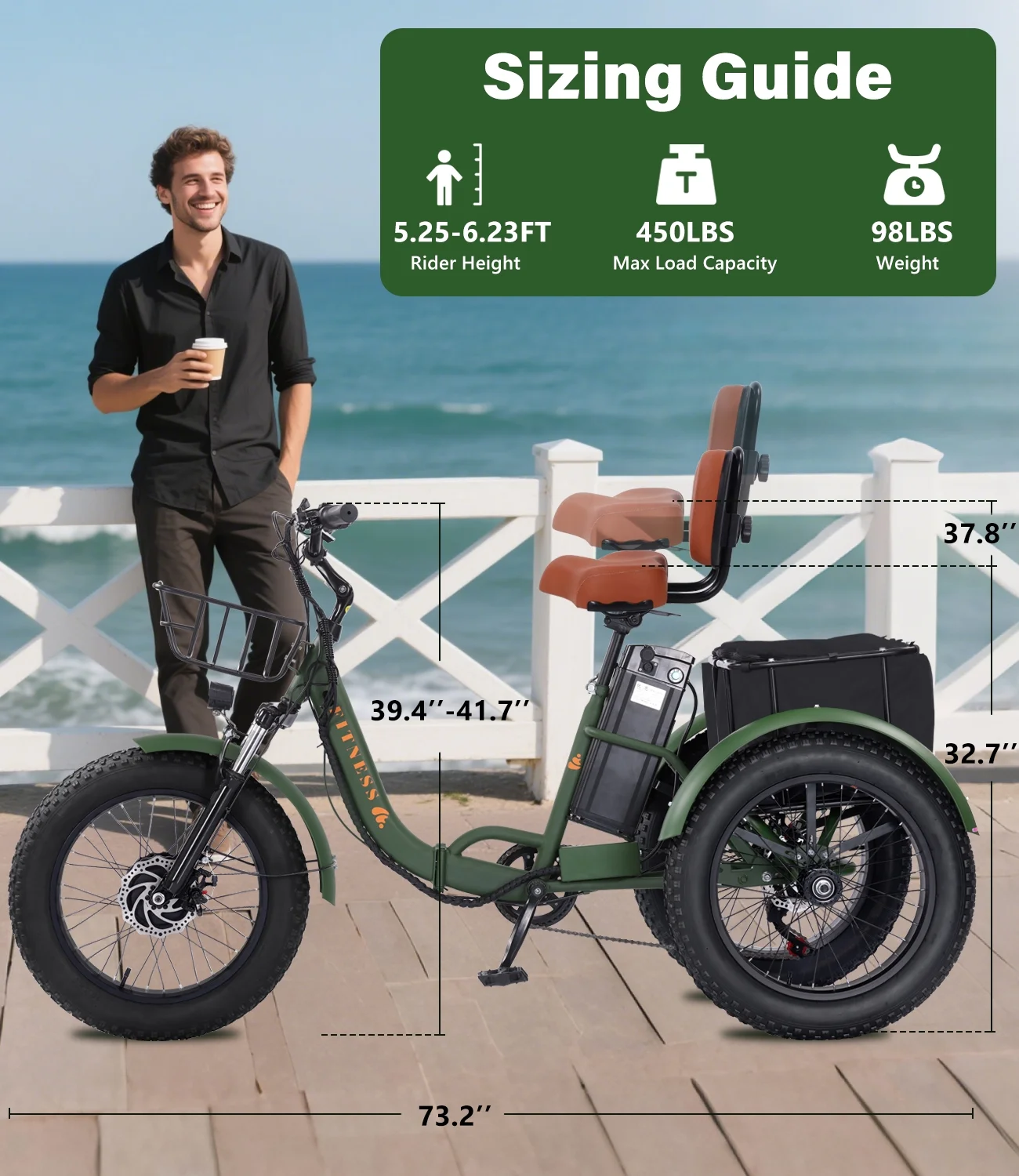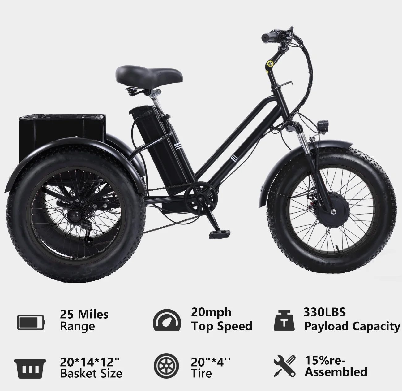 - Sturdy and Durable Construction: This high-performance, urban-style electric tricycle boasts a modern and streamlined design that appeals to both men and women. With a sturdy high-carbon steel frame, 20*40" fat tires aluminum alloy hubs, this adult e trike ensures easy handling and smooth rides across diverse terrains. Supports a maximum weight of 440 lbs, making it perfect for commuting, travel, and sightseeing adventures.