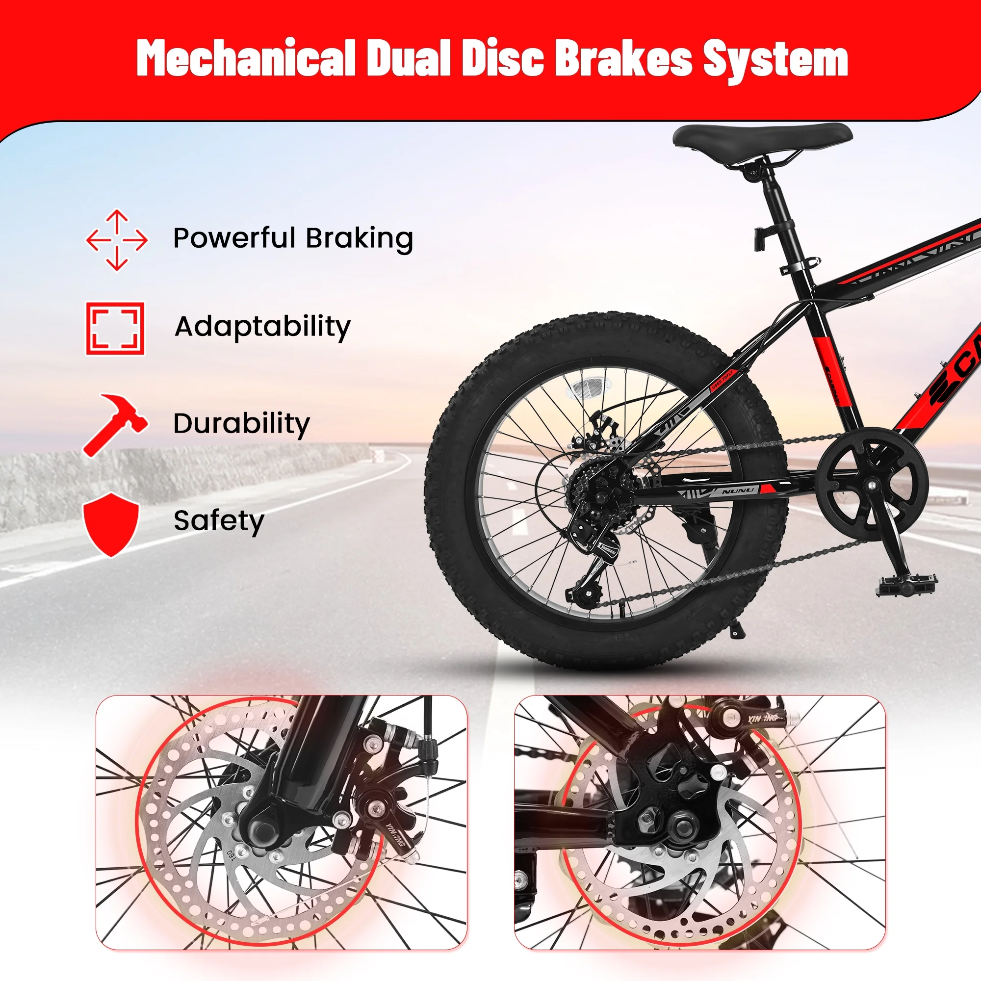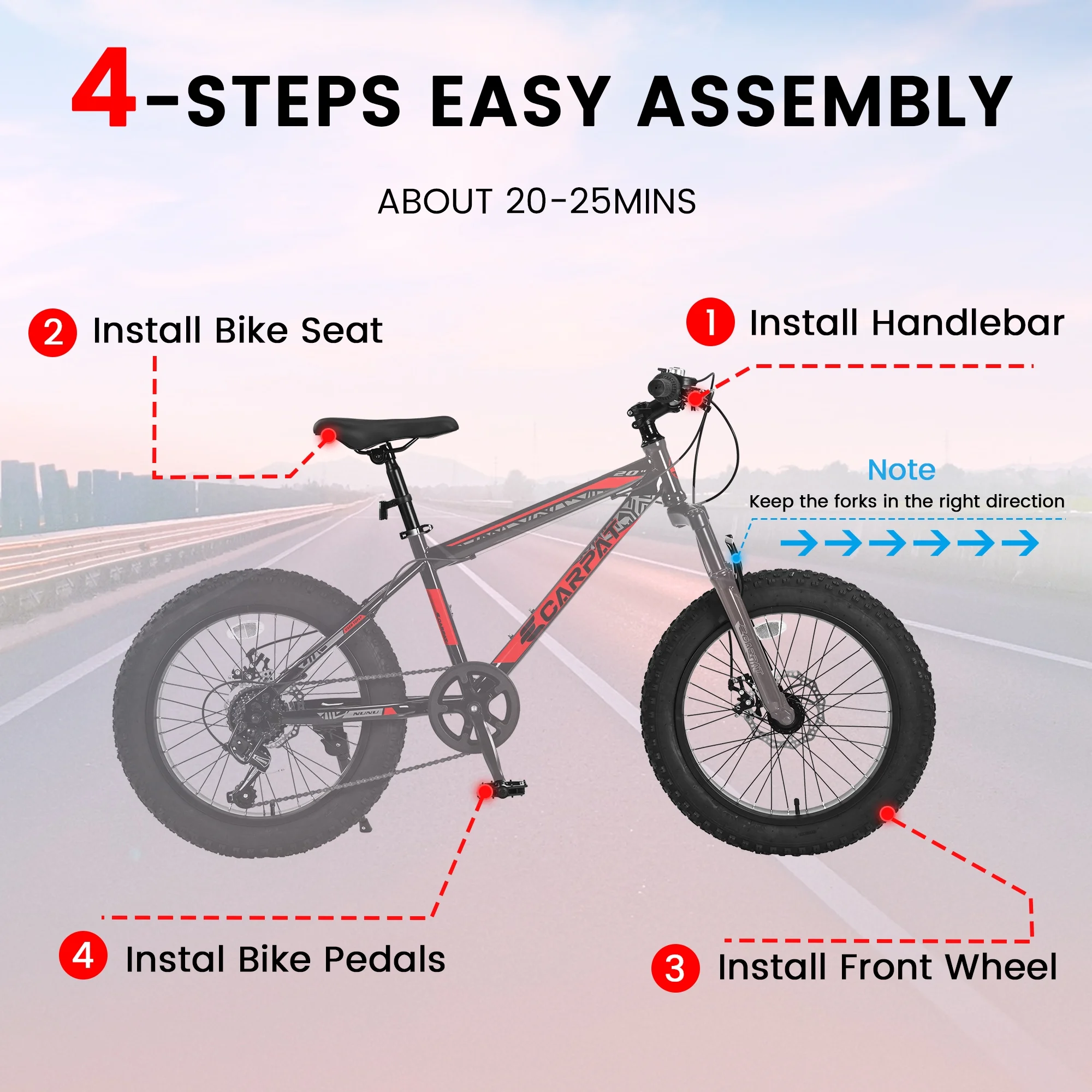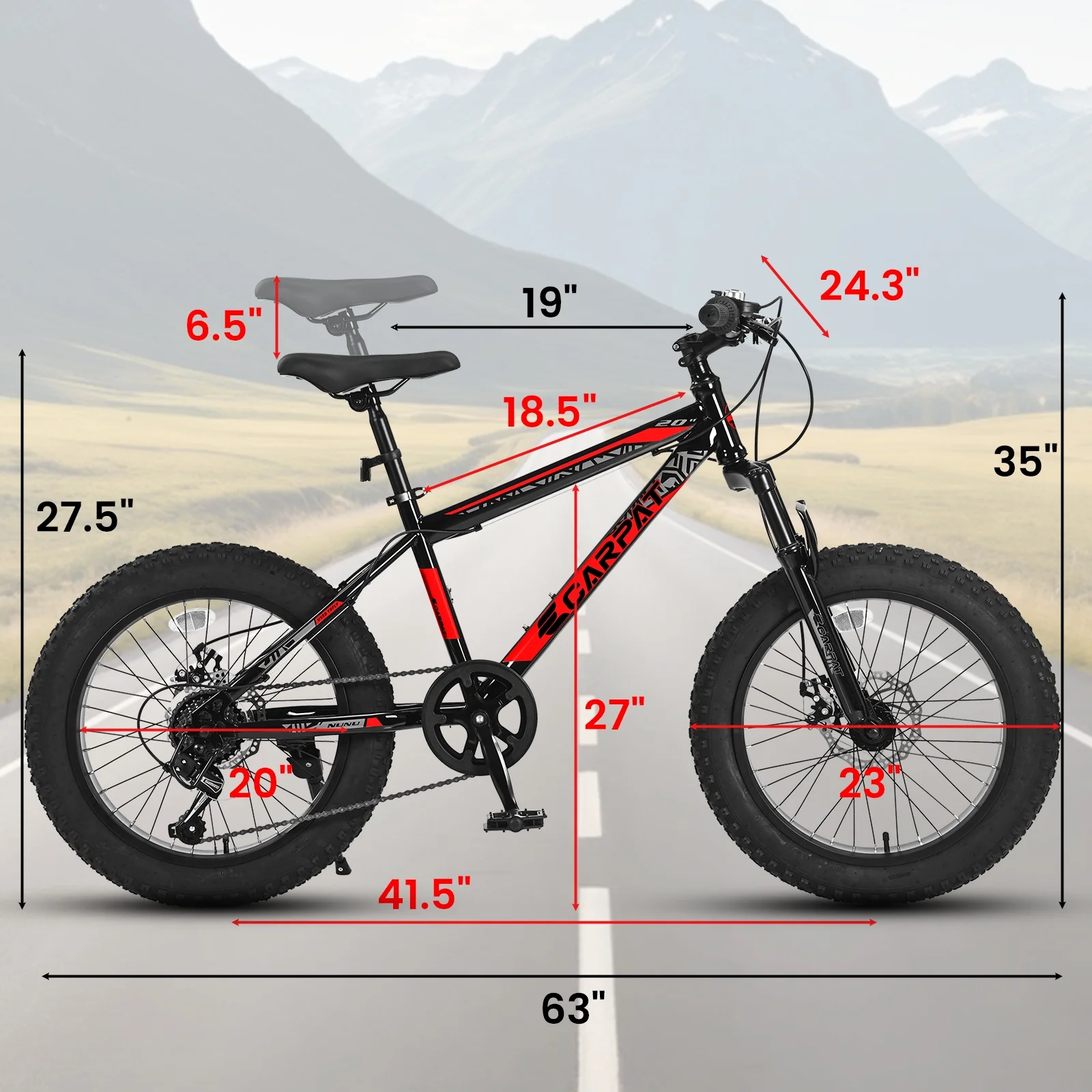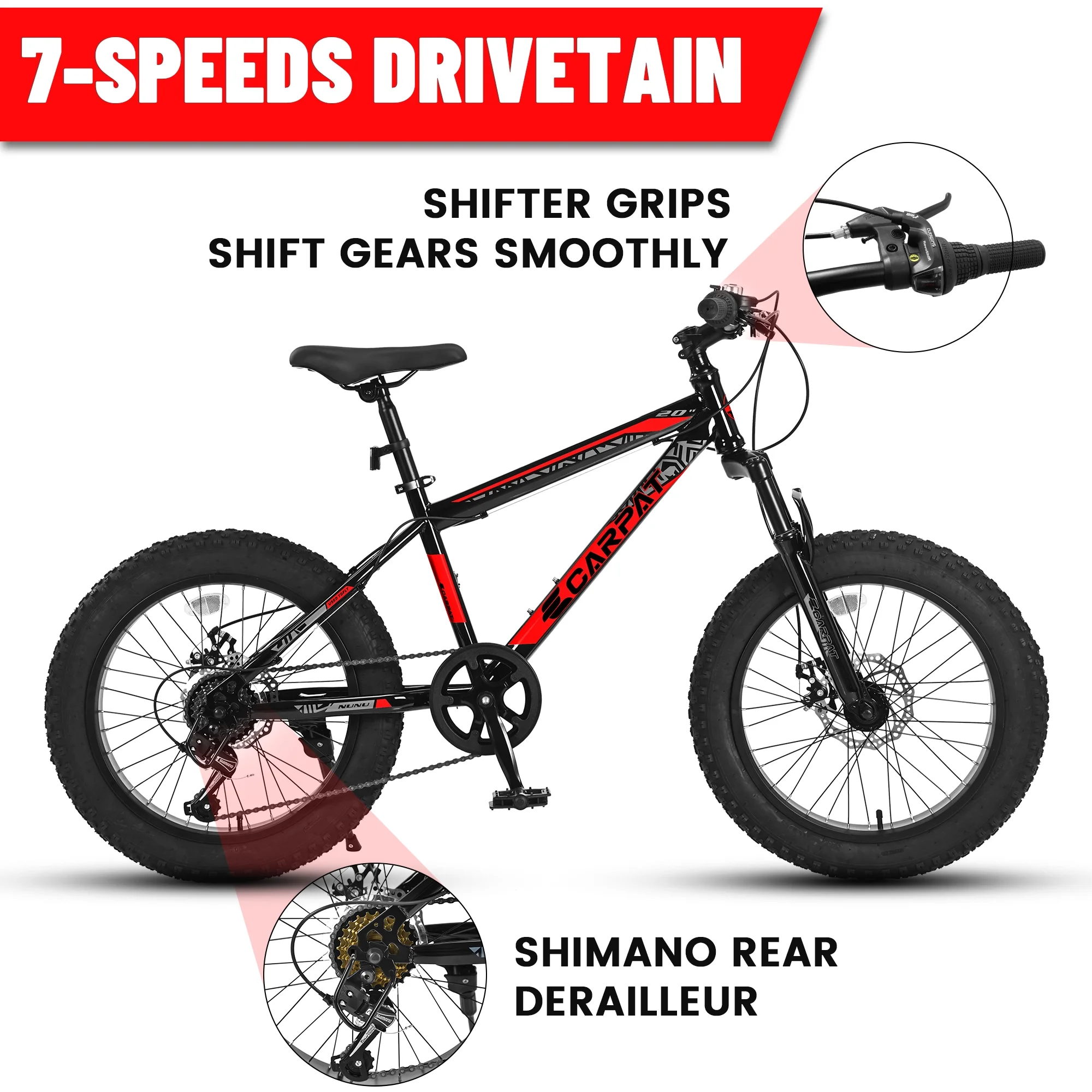 Ecarpat 20-Inch Kids Fat Tire Bike is a great entry-level mountain bike, features low-maintainance componets, a wide-range 6-speed drivetrain and a dropper post for sadle height adjustments on the trail.