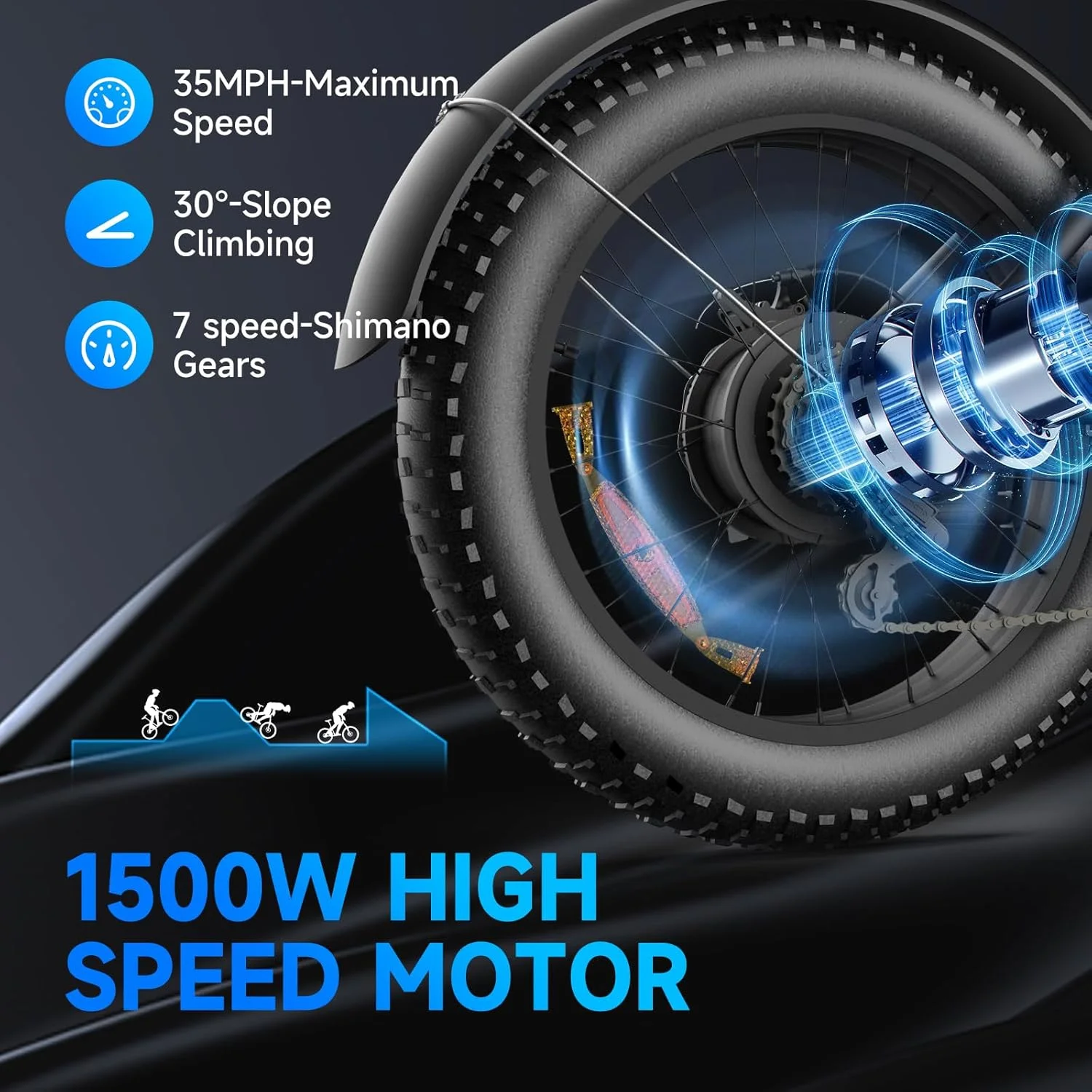 - ��Powerful Brushless Motor with 1500W Peak��Our electric bike is equipped with a ��Peak 1500W��high-speed brushless motor, 85Nm maximum torque, and up to 35MPH speeds & 65Miles, making steep hills and long rides a breeze.The 7-speed gear system can meet all your riding and training needs. In addition, it is equipped with brighter LED headlights, brake lights, and dual wheel reflectors to keep you visible and safe while cycling at night.