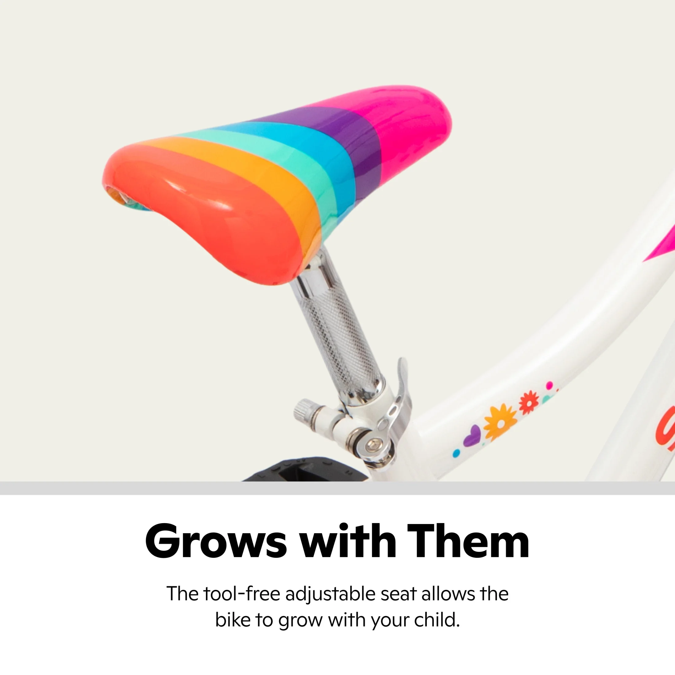 - Tool-free adjustable seat grows with your child