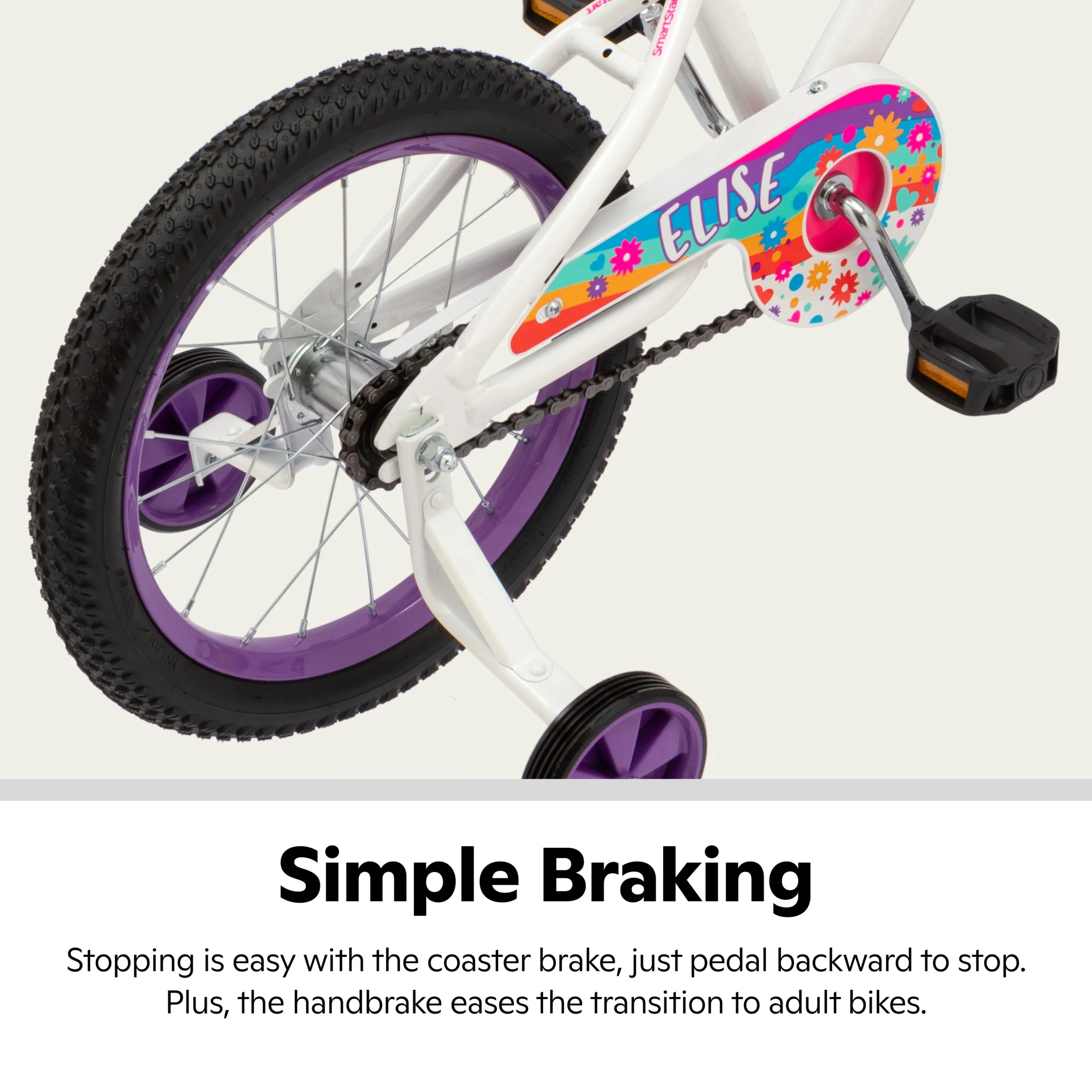 Featuring reliable stability with forward-positioned pedals, low standover height for easy ons and offs, and more control with a lightweight frame, the Elise offers a fit that's better for your little rider. This bike for kids includes a rear coaster brake plus a front hand brake that helps young riders learn to use big kid brakes while still relying on an intuitive and easy stopping option. A tool-free adjustable seat post helps the bicycle grow with your child, while the training wheels are easy to remove. The basket and tassels bring extra flair to every ride to make sure bike riding stays exciting. Give your little one the gift of riding with the Elise girls' bike.