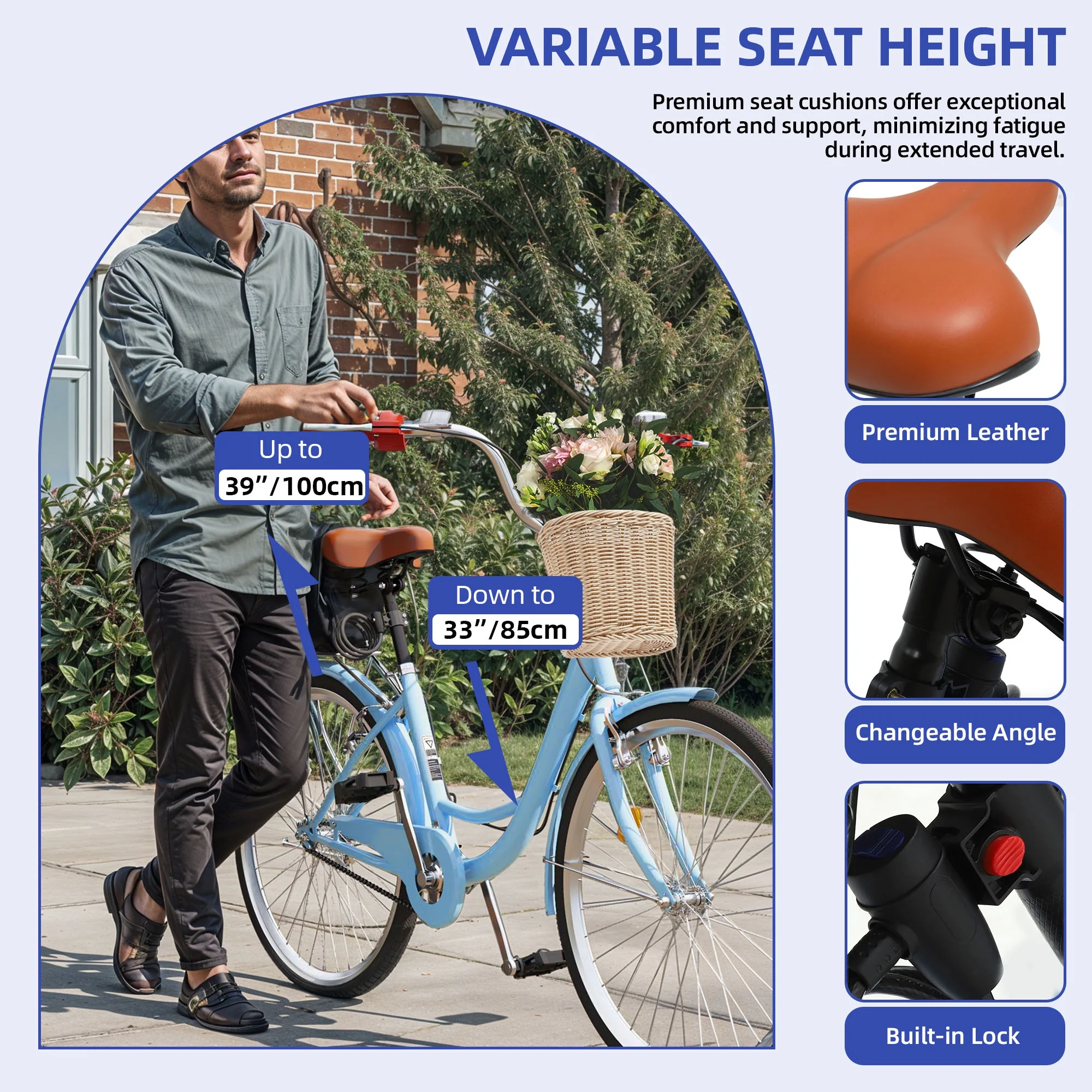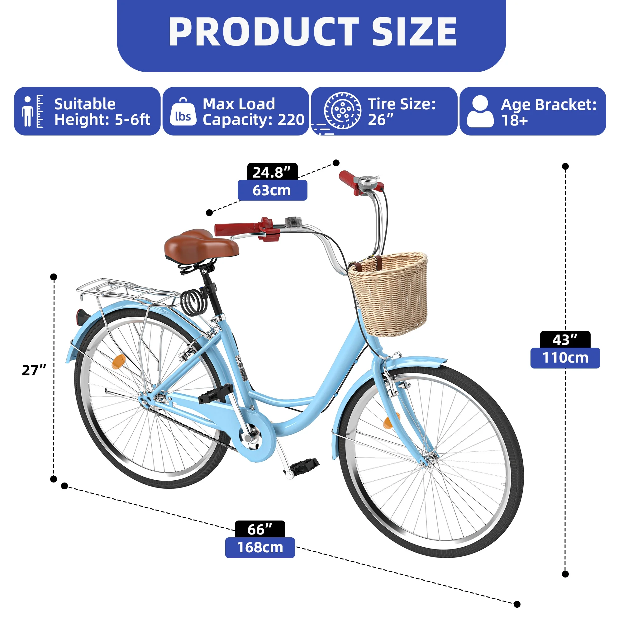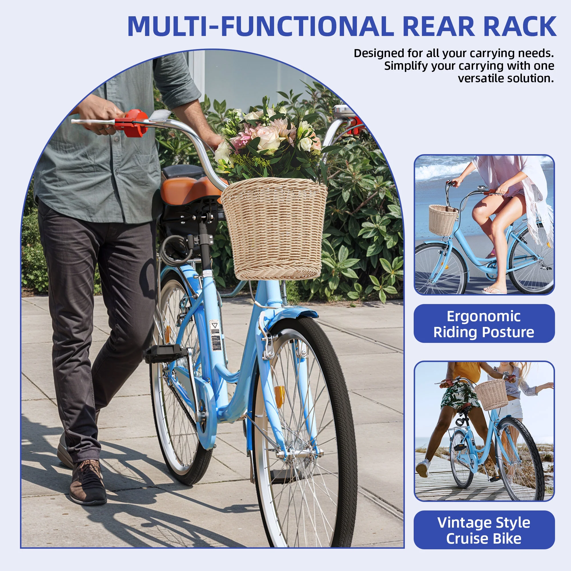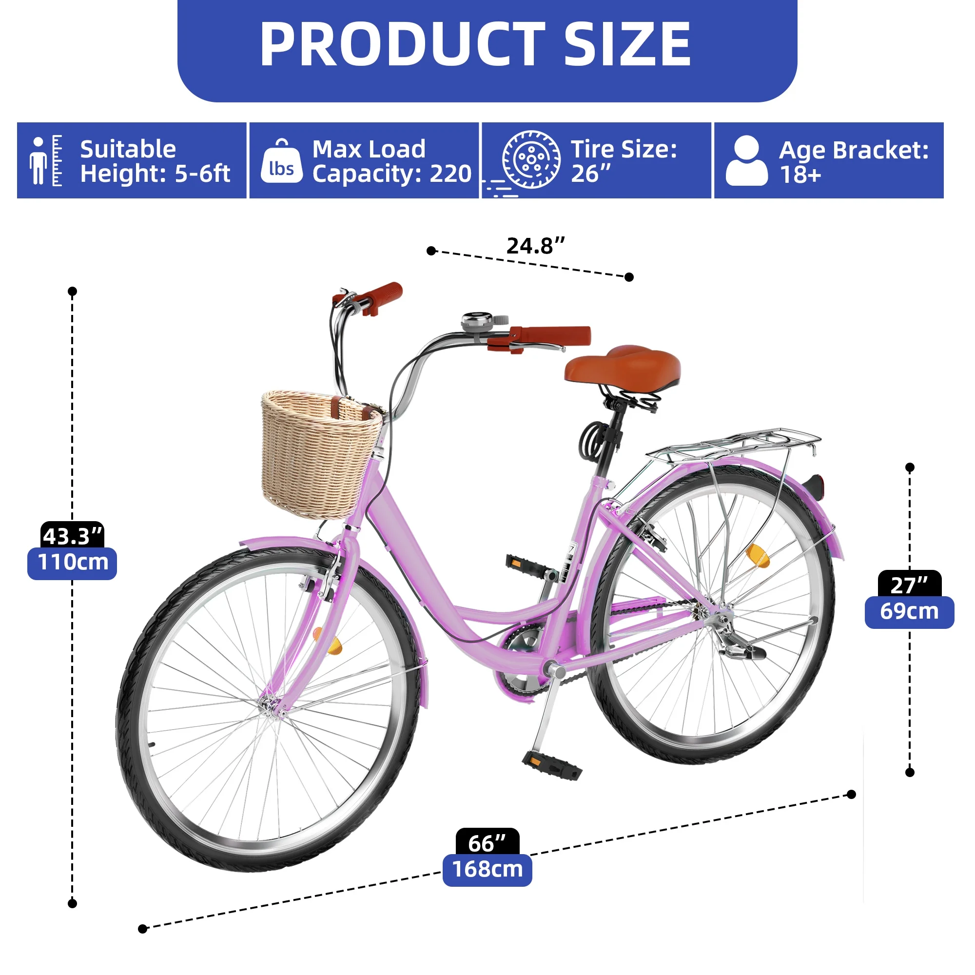 Experience the perfect blend of style, comfort, and functionality with the 26" 1/7-Speed Beach Cruiser Bike. Designed for women who love leisurely rides, this bike features a classic curved frame, dual suspension for a smooth journey, and vibrant color options. Whether cruising along the beach or exploring city streets, this lightweight and durable bike promises an enjoyable ride every time.