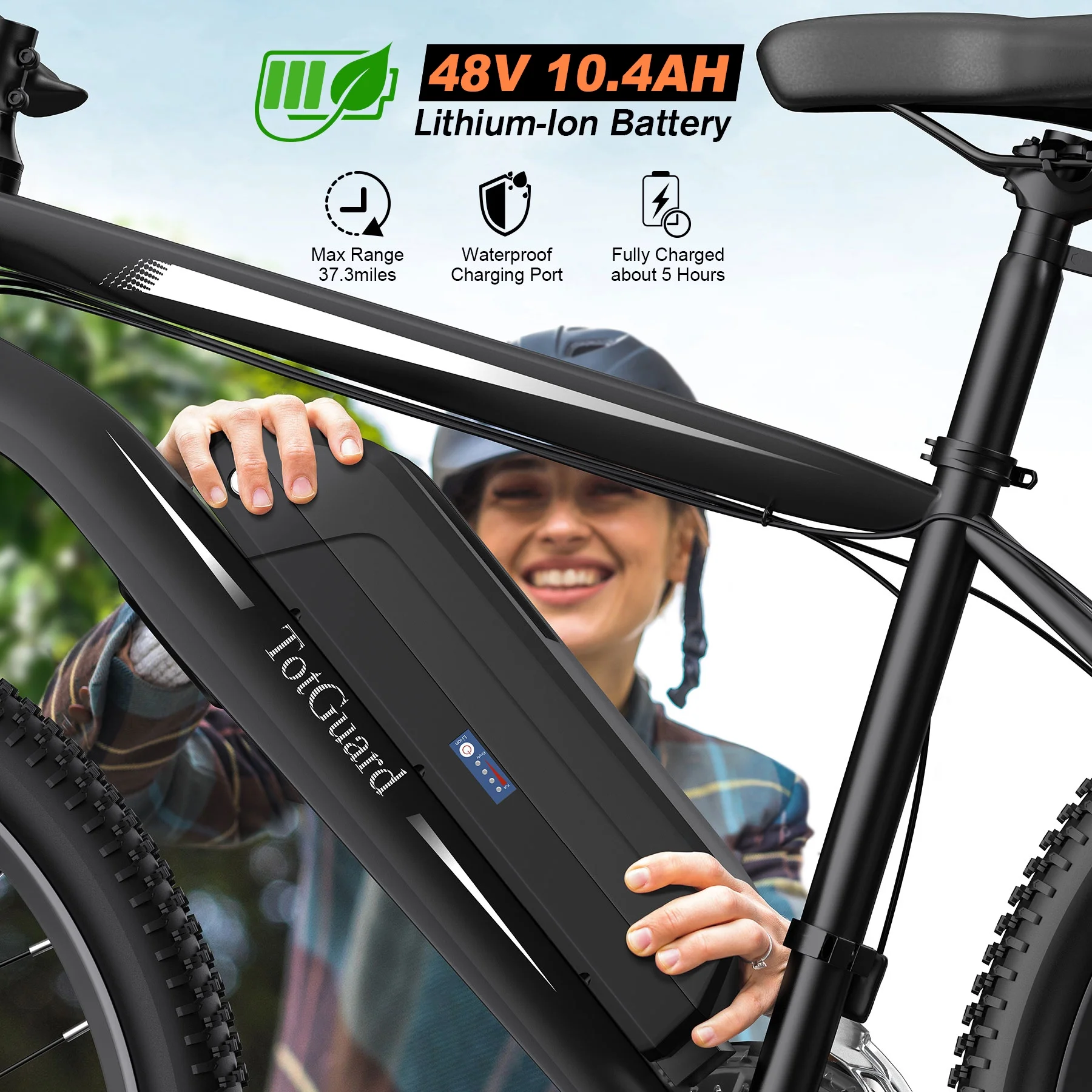 TotGuard is strive to providing cost-effective products. TotGuard 27.5'' electric bike adopts 500W motor, 48V10Ah removable battery, lockable suspension fork and Shimano 21-speed, helping you to explore more cycling fun on the city, mountain and beach roads.