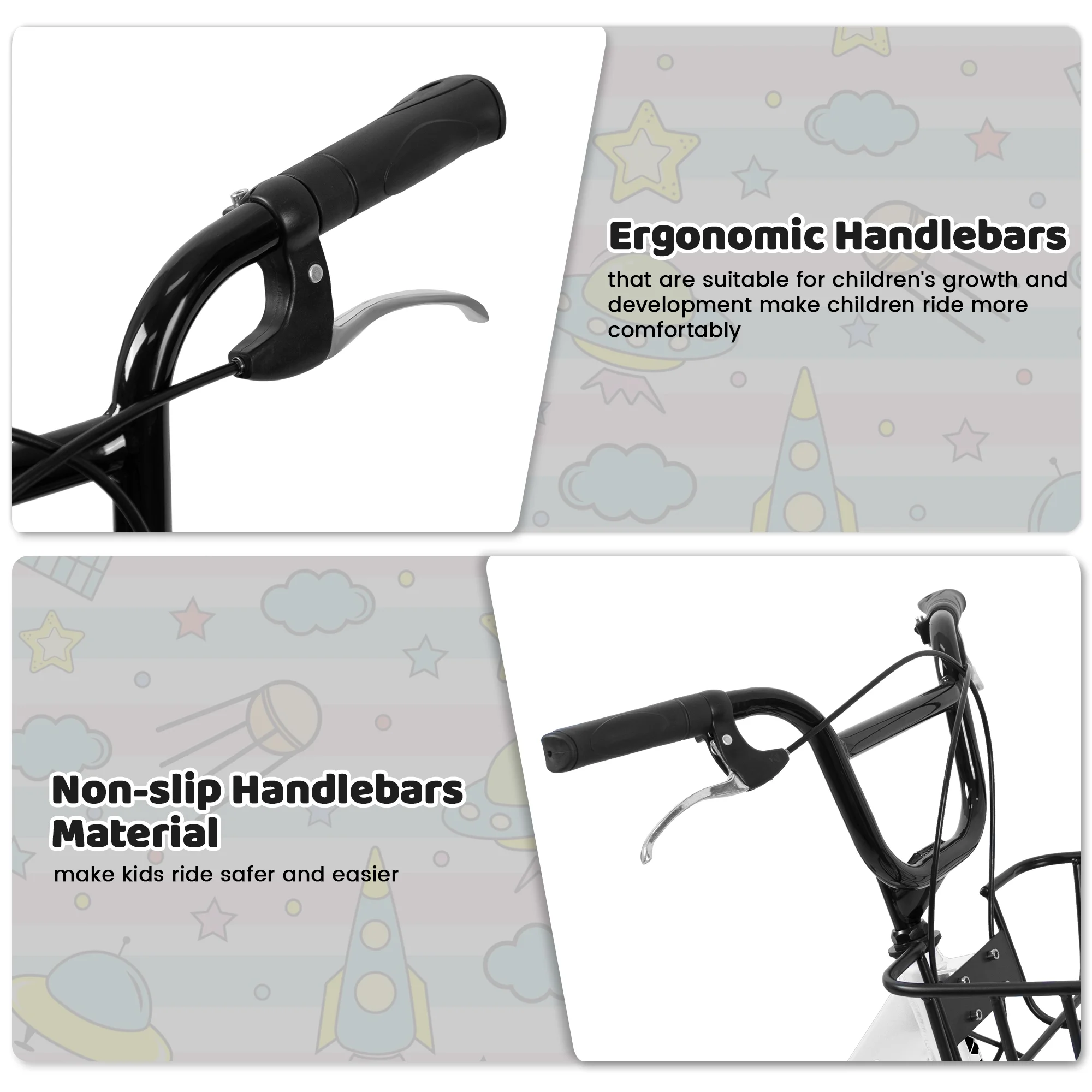 - [Reliable Dual Braking System] Safety is prioritized with a coaster brake (foot brake) for intuitive stopping by pedaling backward, paired with a front V-brake for precise control during sudden stops or downhill rides. This dual braking setup helps kids develop essential riding skills while ensuring maximum safety on every adventure.