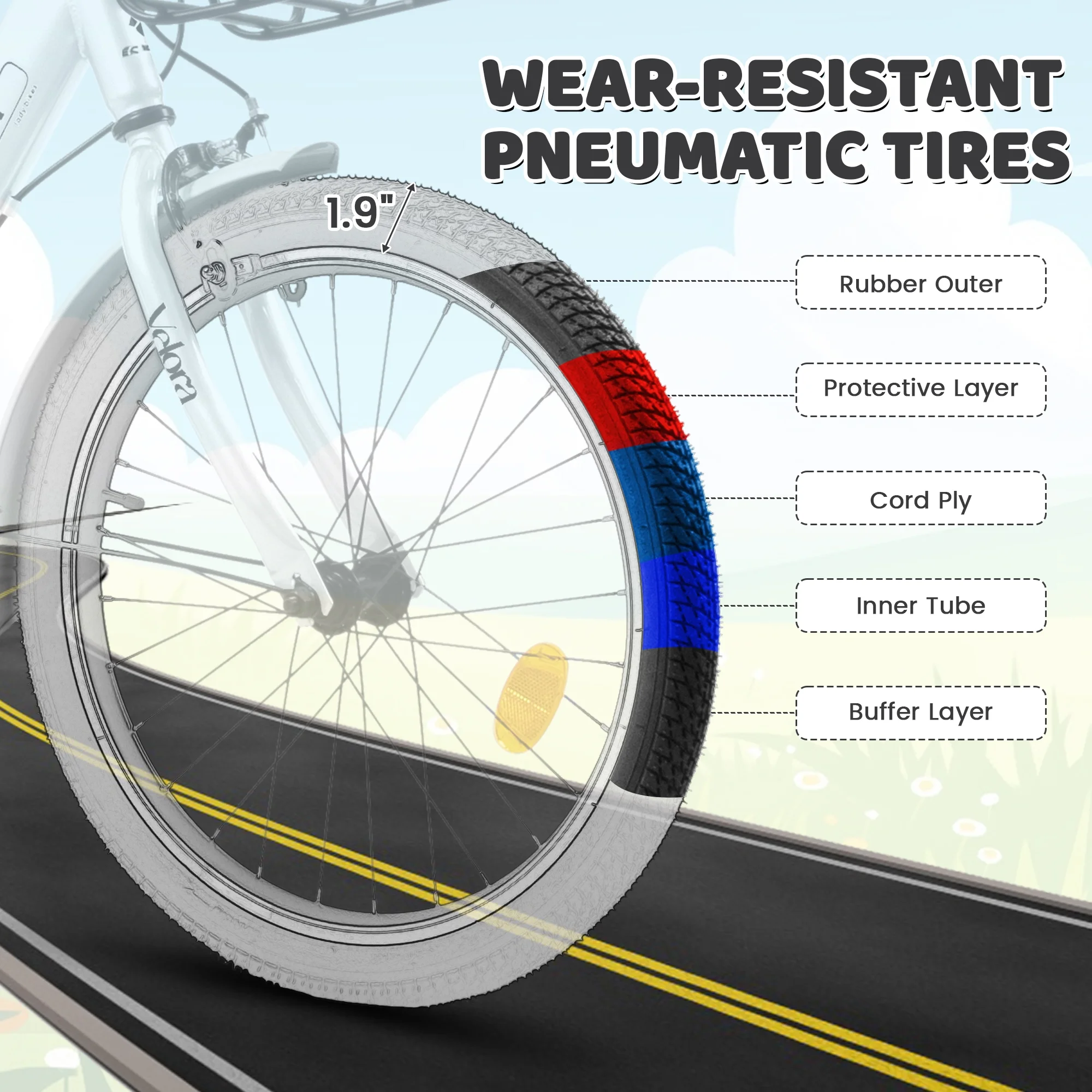 - [Smooth & Low-Maintenance Riding] The single-speed (1-speed) drivetrain simplifies riding for beginners, eliminating the need for gear shifting while providing a smooth, hassle-free experience. Paired with aluminum alloy rims and 20x2.125 clincher tires, this bike offers reliable traction and stability on pavement, trails, or sidewalks.