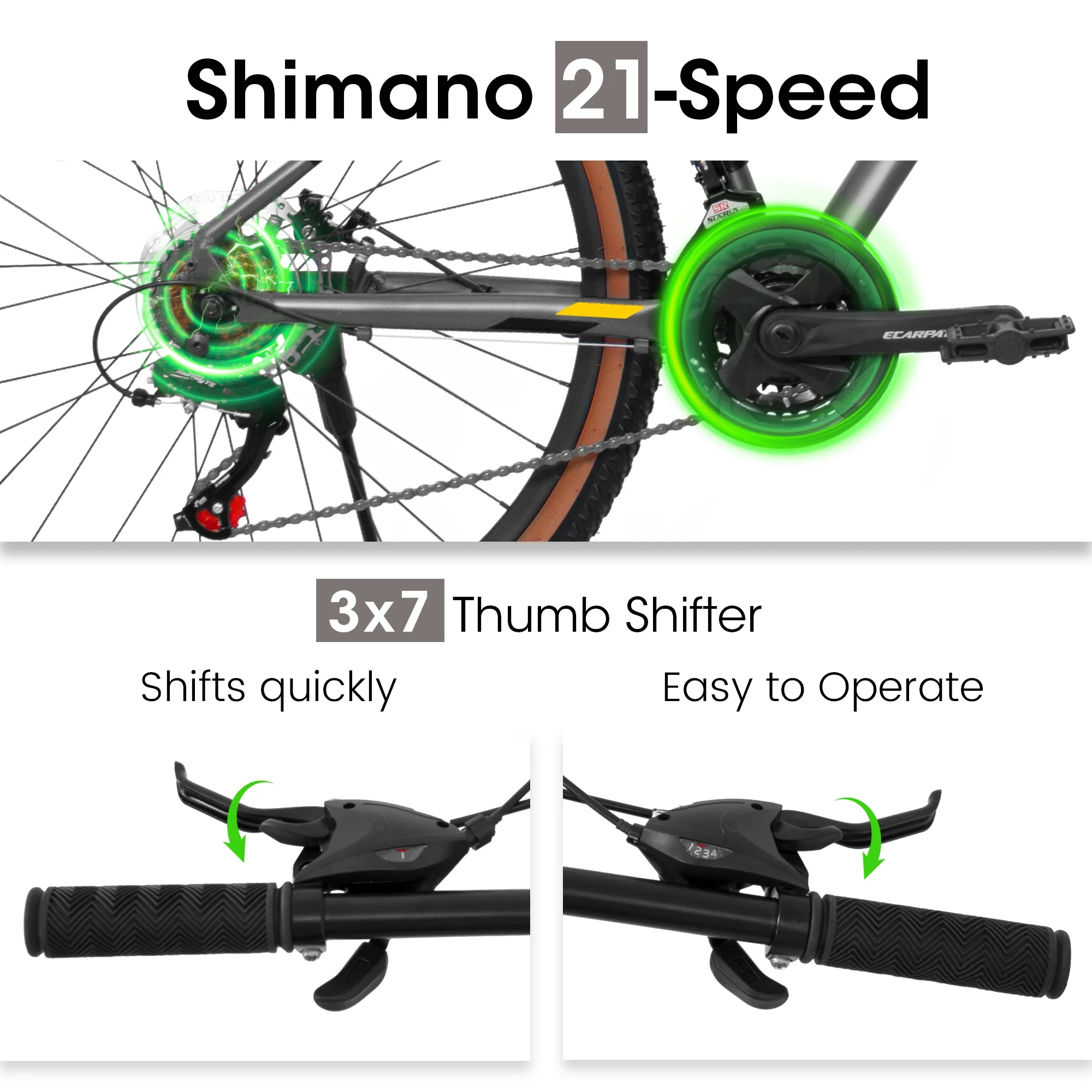 - ��21-Speed with Disc Brakes��Thumb shifter help to switch gears with smoothness. Simple operation allows for quick selection of gears for various terrains. Mechanical dual disc brake system, simple structure and convenient for maintenance.