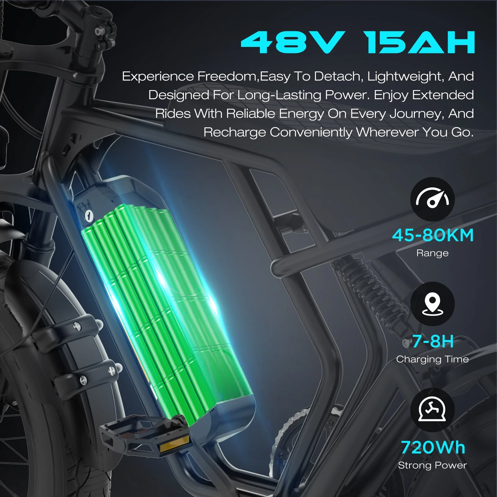 - ��15AH battery mountain bike�� Equipped with 48V 15AH large capacity battery, which provides fast charging in as little as 7 hour. It covers a range of 50 miles per full charge. The battery is removable, waterproof and is small enough to bring home or to the office to charge.