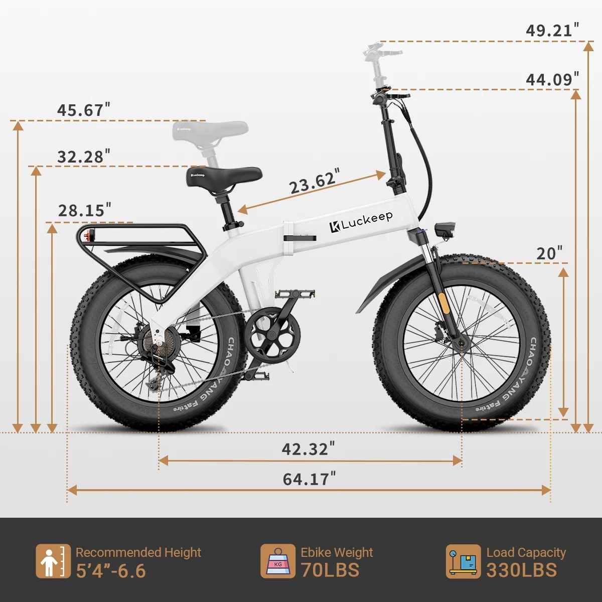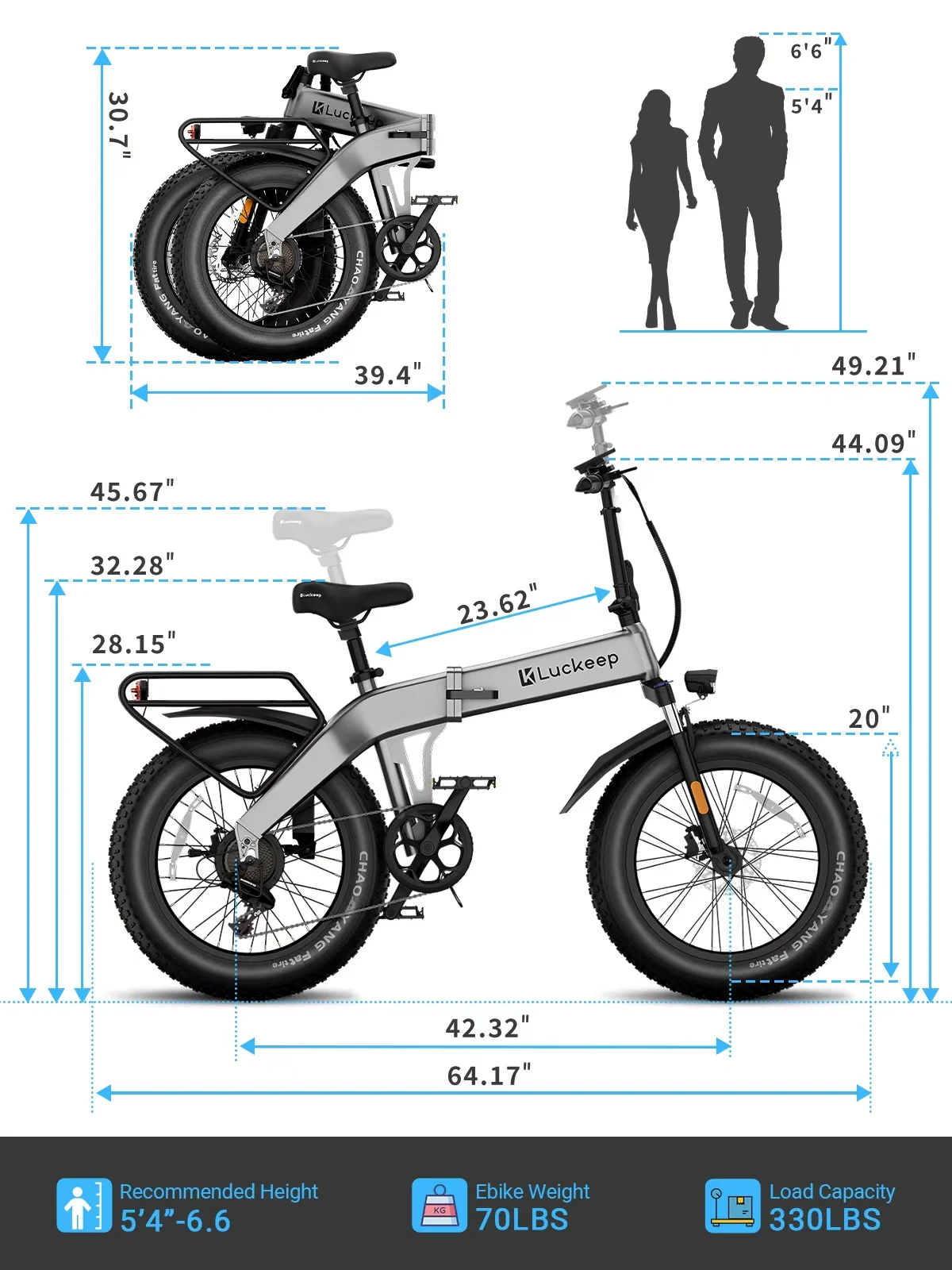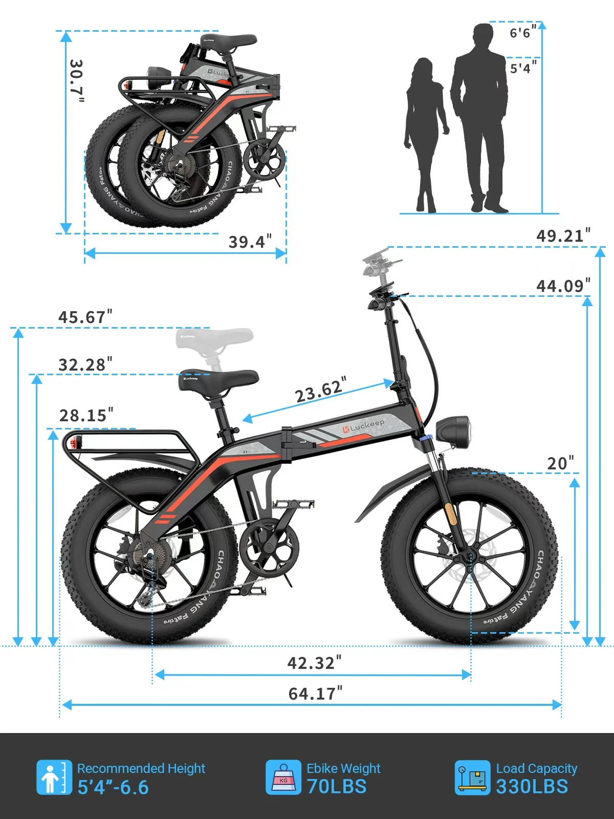 - Two step folding design will make it easier to carry or store in the trunk.When folded, the folding e-bike measures 39.4" �� 21.7" �� 30.7", making it compact enough for car trunks, RVs, or apartments.Especially for daily riders, seniors, or those carrying gear.The seat and handlebar height is adjustable for person of different heights (5'4"-6'6").