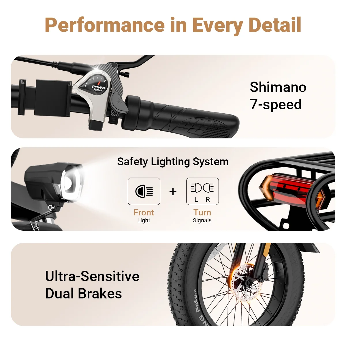 - The e bike also prioritizes safety, with dual mechanical disc brakes, a turn signal-integrated tail light, front suspension fork, and a clear LCD display for real-time ride data. These features improve control, visibility, and confidence��day or night.
