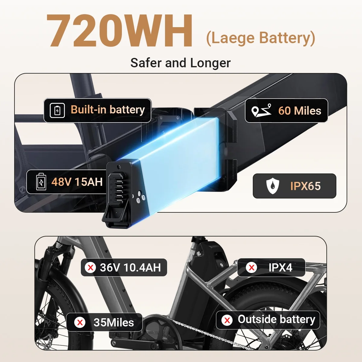 - A 48V 15Ah removable lithium battery provides up to 60 miles of range per charge in pedal-assist mode. Its advanced battery management system includes 14 layers of protection for safety and longevity. With dual charging options (on or off the bike), the battery fully charges in 5 to 6 hours, ensuring quick turnaround between rides.The battery is removable and lockable to guard against theft.