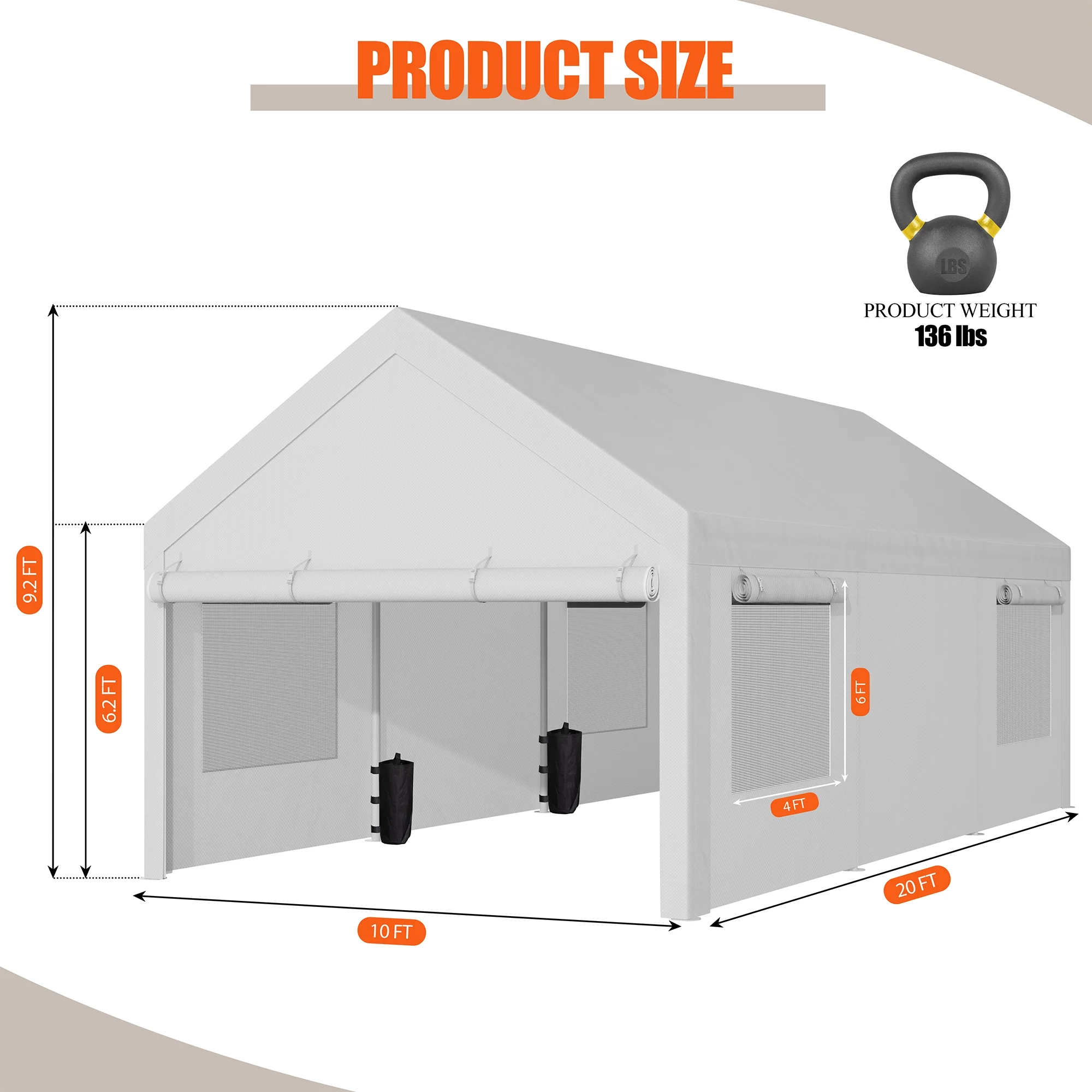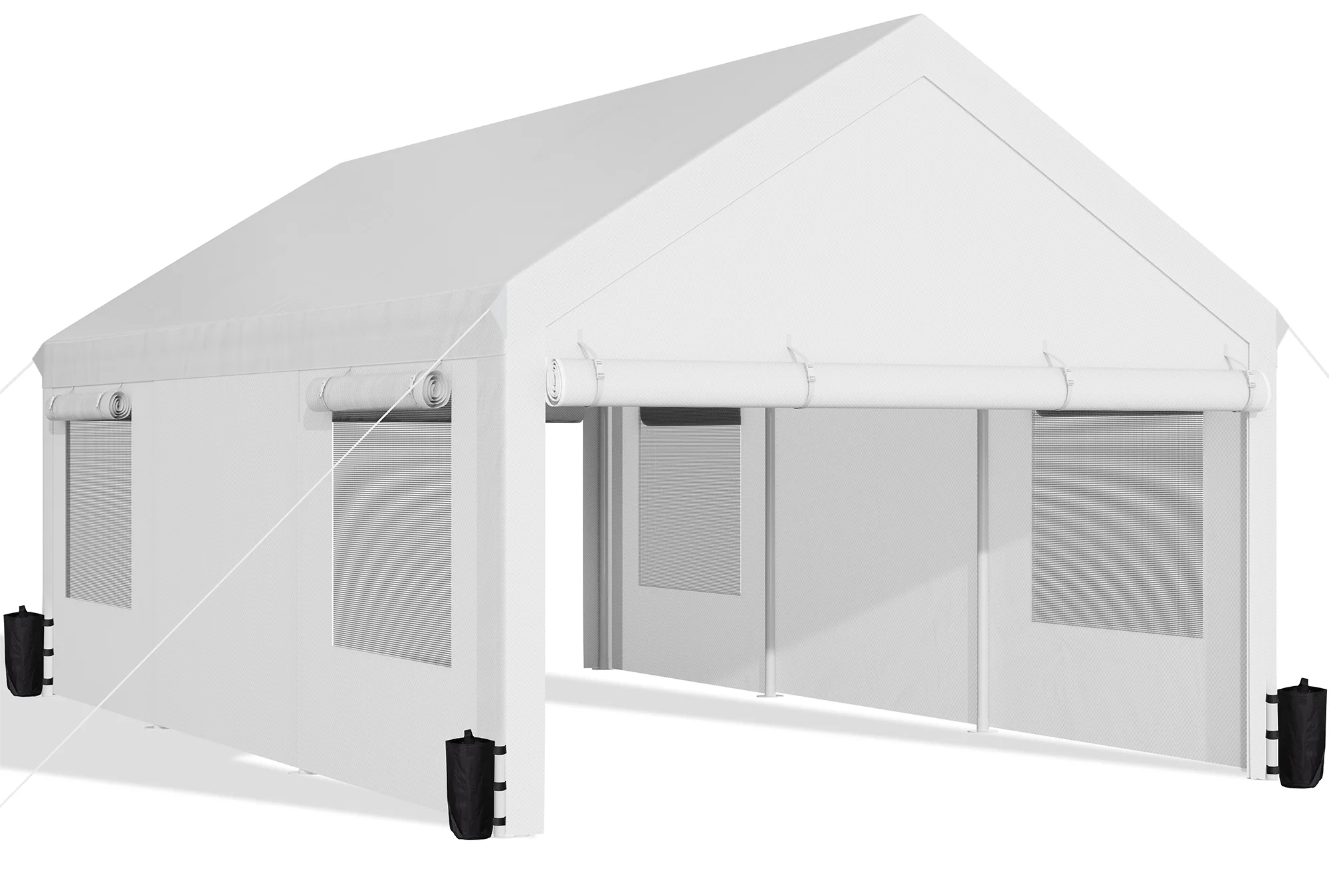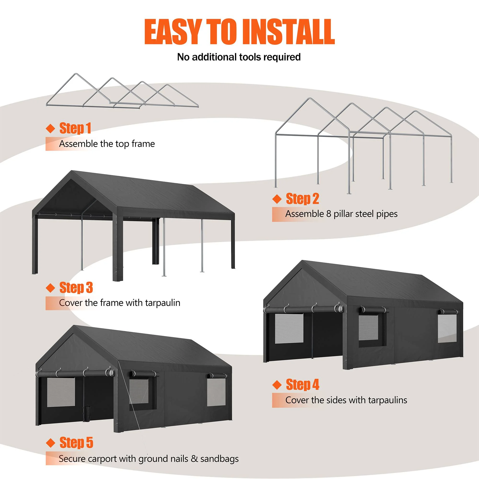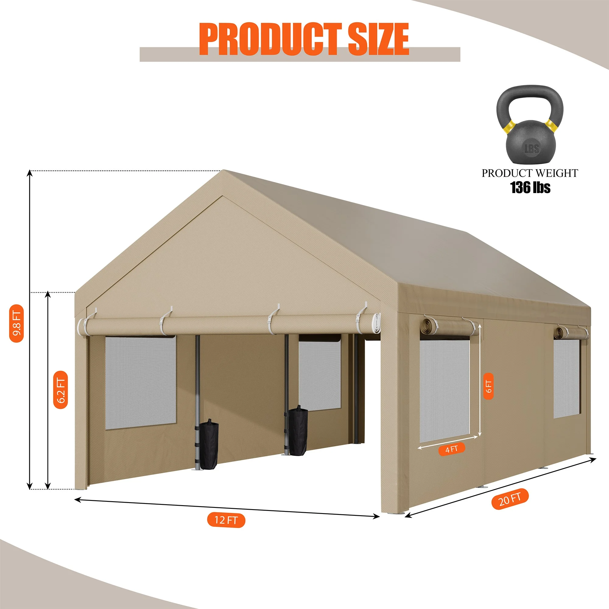 The 12x20 heavy-duty carport canopy provides ample protection for vehicles, boats, and cargo. Designed with versatility in mind, its removable sidewalls and zippered doors make it perfect for storage, commercial exhibitions, weddings, and outdoor events. This spacious shelter includes two detachable sidewalls with roll-up ventilation windows and two zippered doors for enhanced airflow and moisture control. Built with a rust-resistant steel frame and sturdy 1.5-inch diameter legs, it ensures exceptional stability, further reinforced by eight windproof ropes. The 180g waterproof cover offers reliable protection against various weather conditions, securely fastened for durability. Easy to assemble with no extra tools required, this carport canopy combines functionality with convenience.