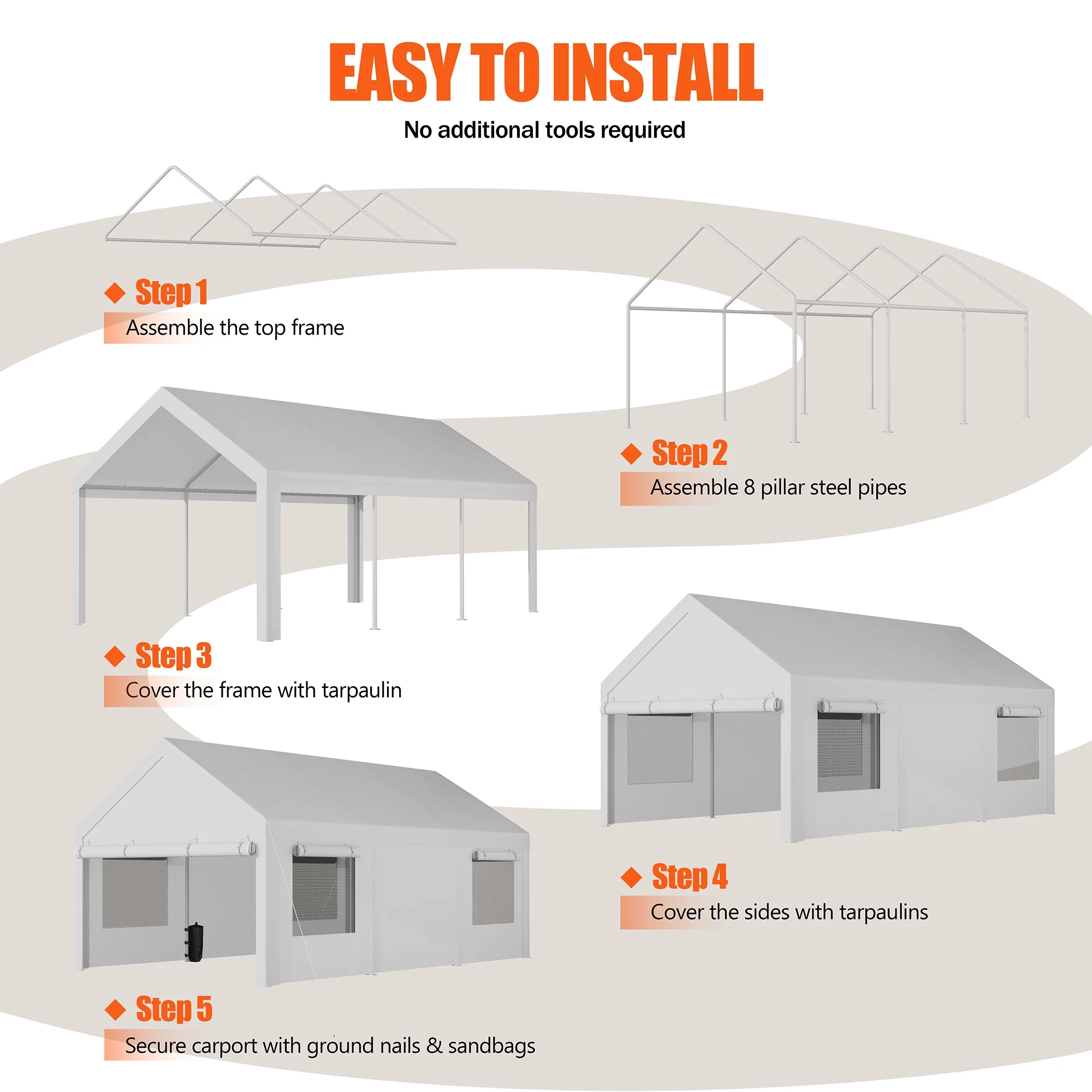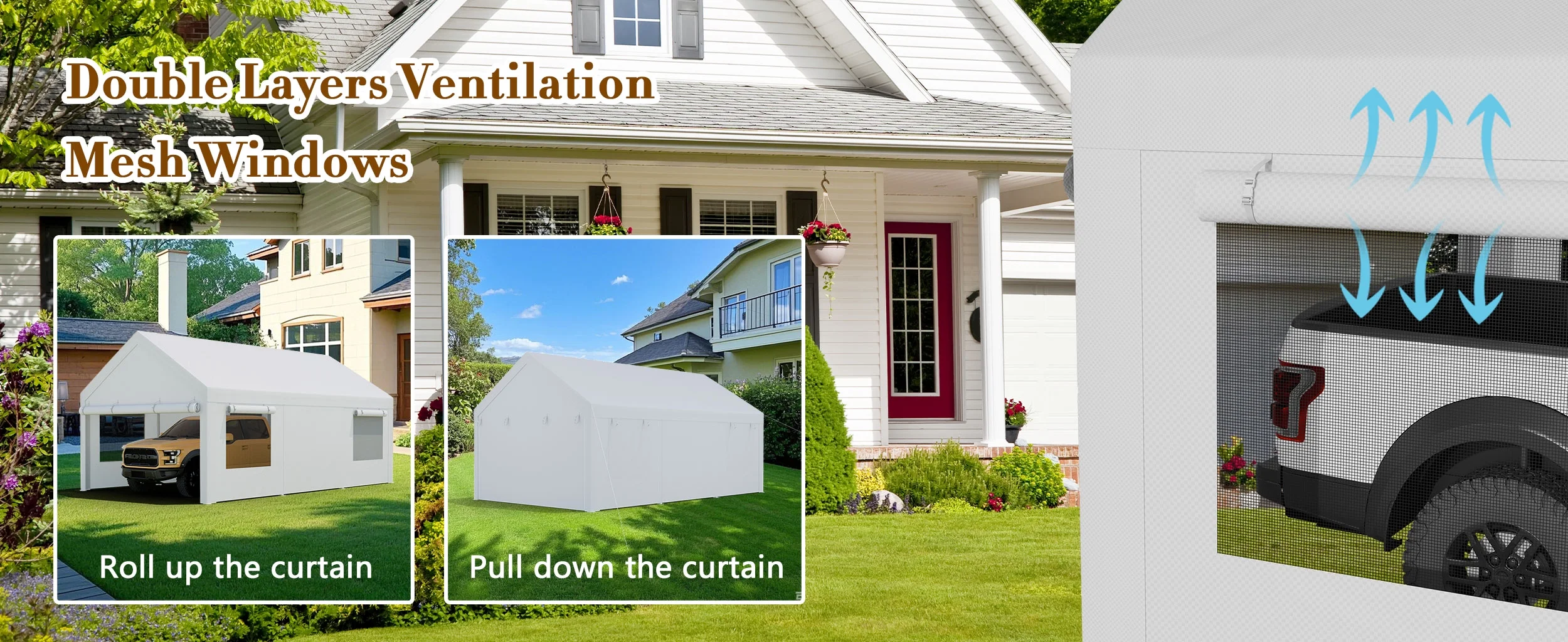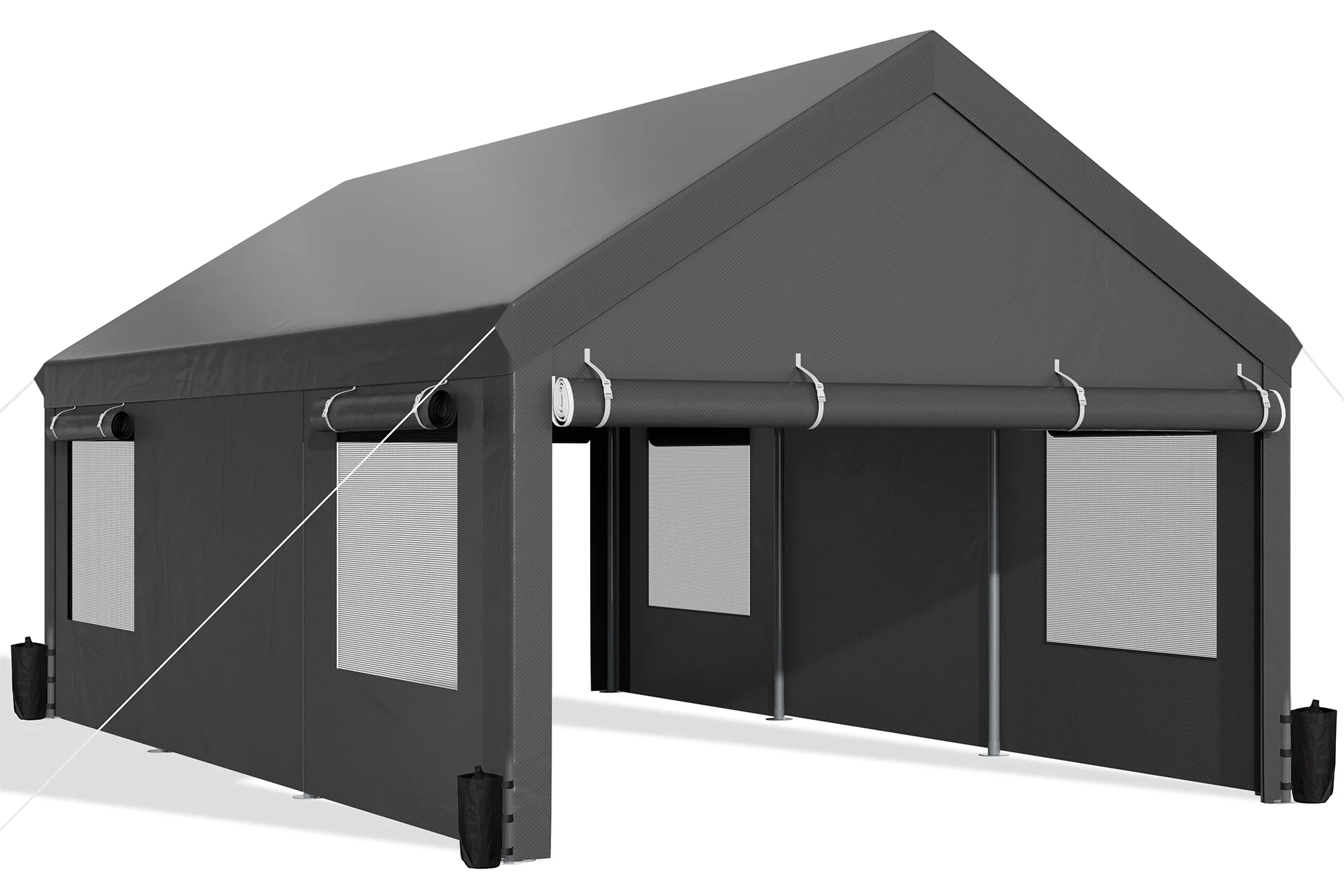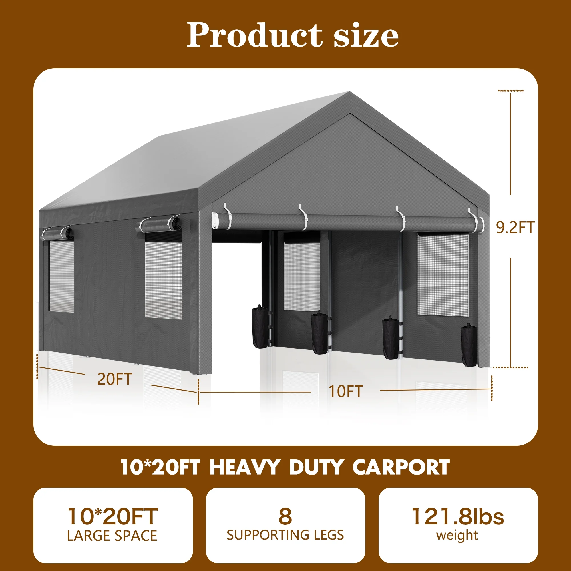 The 12x20 heavy-duty carport canopy provides ample protection for vehicles, boats, and cargo. Designed with versatility in mind, its removable sidewalls and zippered doors make it perfect for storage, commercial exhibitions, weddings, and outdoor events. This spacious shelter includes two detachable sidewalls with roll-up ventilation windows and two zippered doors for enhanced airflow and moisture control. Built with a rust-resistant steel frame and sturdy 1.5-inch diameter legs, it ensures exceptional stability, further reinforced by eight windproof ropes. The 180g waterproof cover offers reliable protection against various weather conditions, securely fastened for durability. Easy to assemble with no extra tools required, this carport canopy combines functionality with convenience.