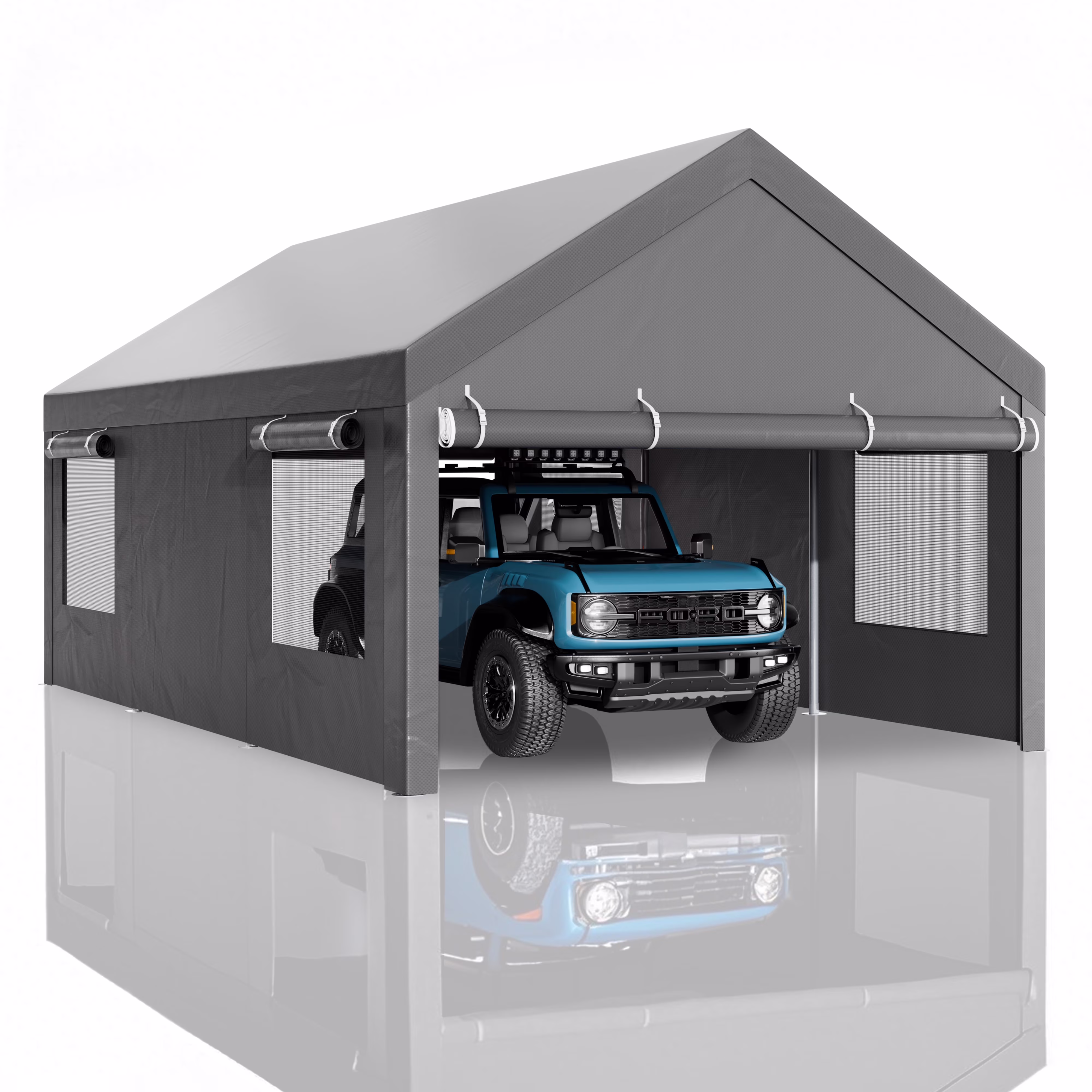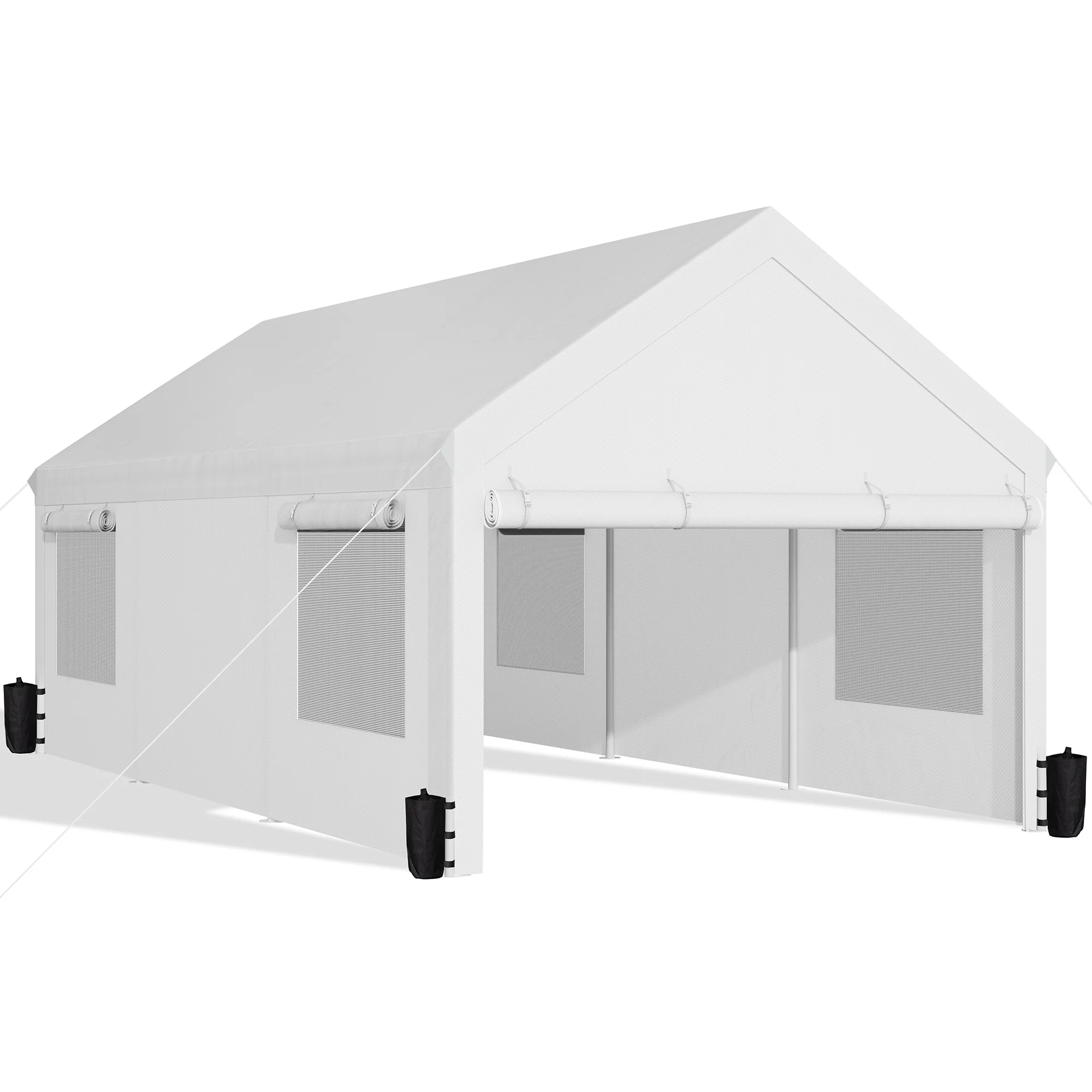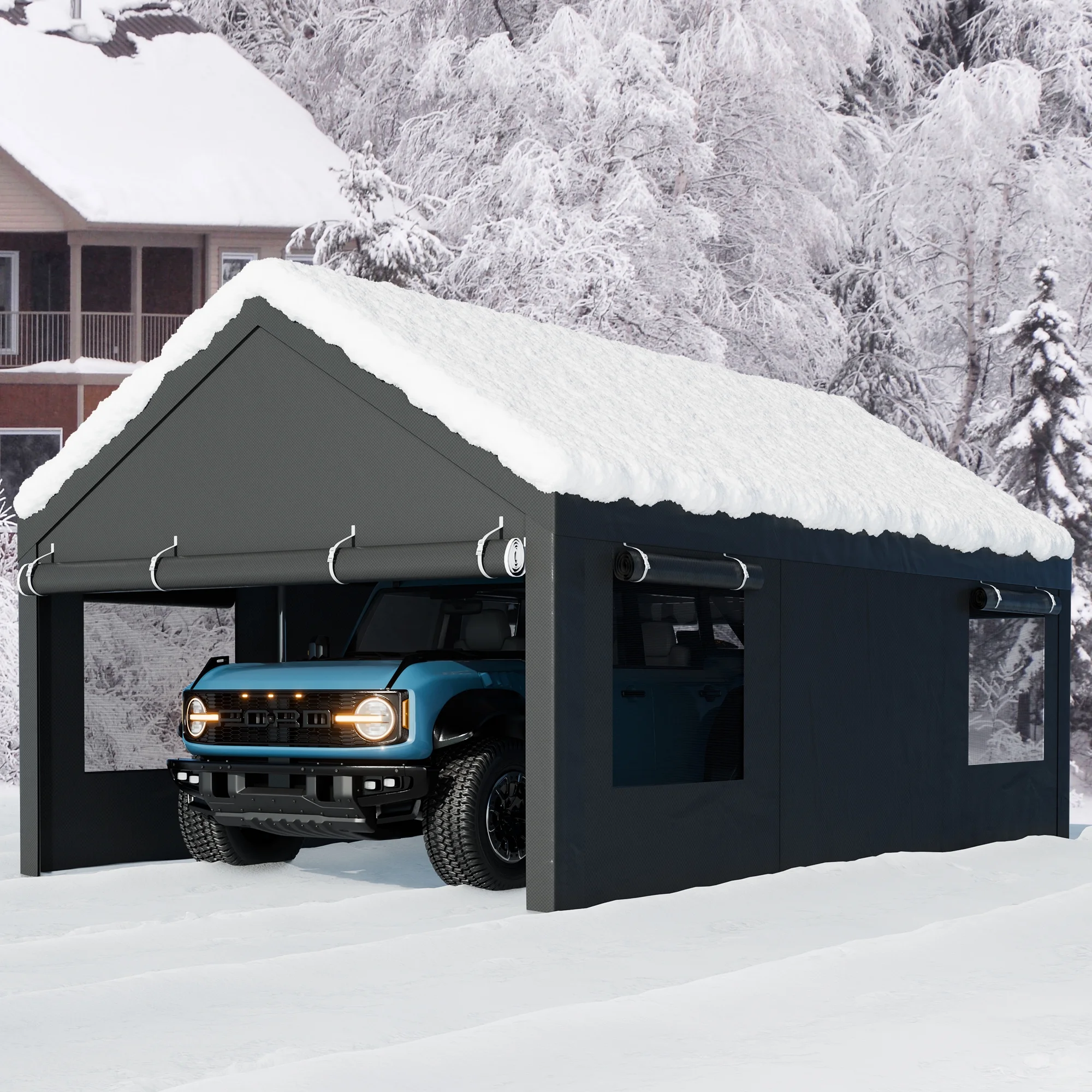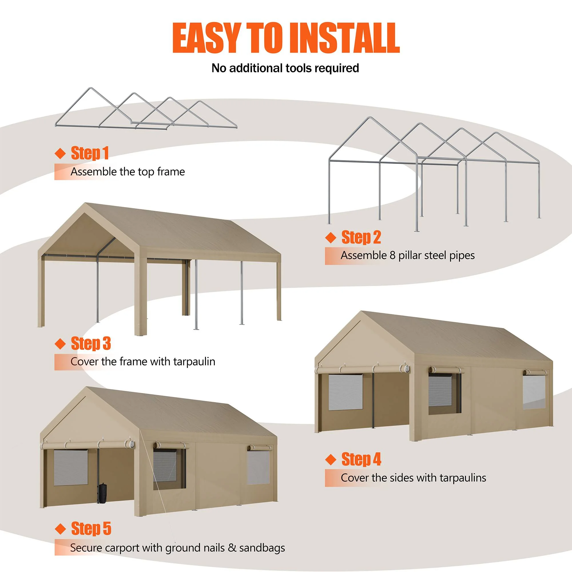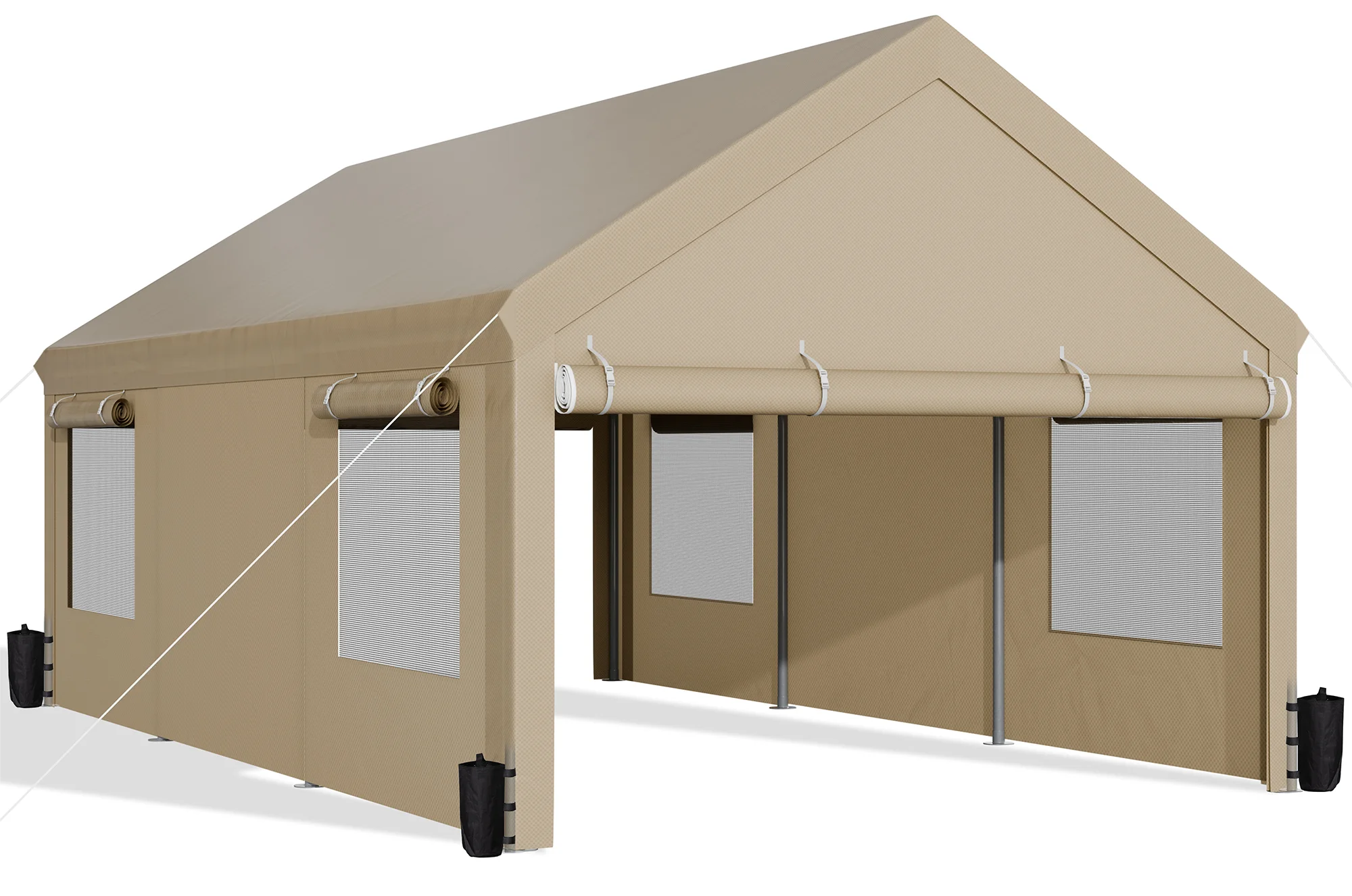 The 12x20 heavy-duty carport canopy provides ample protection for vehicles, boats, and cargo. Designed with versatility in mind, its removable sidewalls and zippered doors make it perfect for storage, commercial exhibitions, weddings, and outdoor events. This spacious shelter includes two detachable sidewalls with roll-up ventilation windows and two zippered doors for enhanced airflow and moisture control. Built with a rust-resistant steel frame and sturdy 1.5-inch diameter legs, it ensures exceptional stability, further reinforced by eight windproof ropes. The 180g waterproof cover offers reliable protection against various weather conditions, securely fastened for durability. Easy to assemble with no extra tools required, this carport canopy combines functionality with convenience.