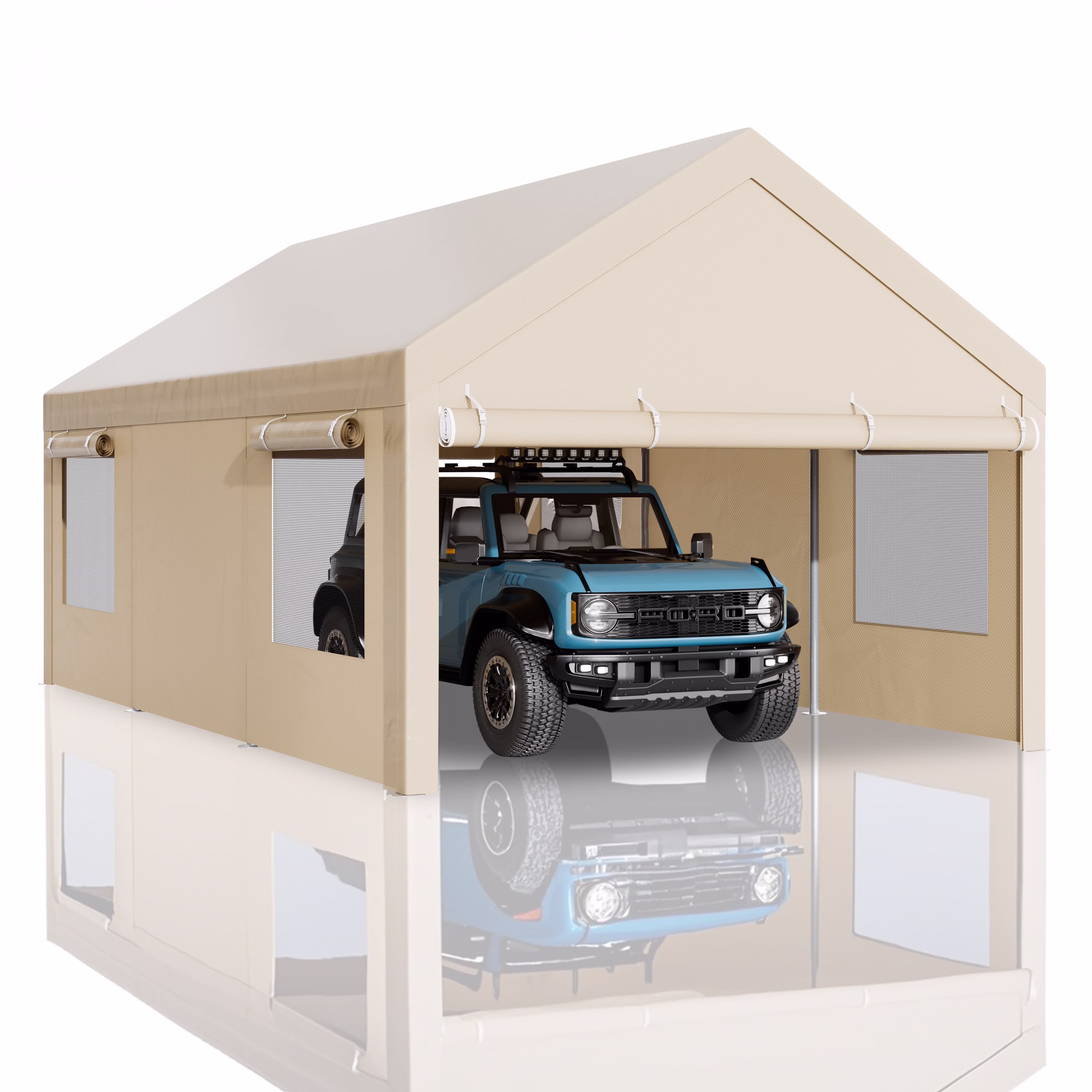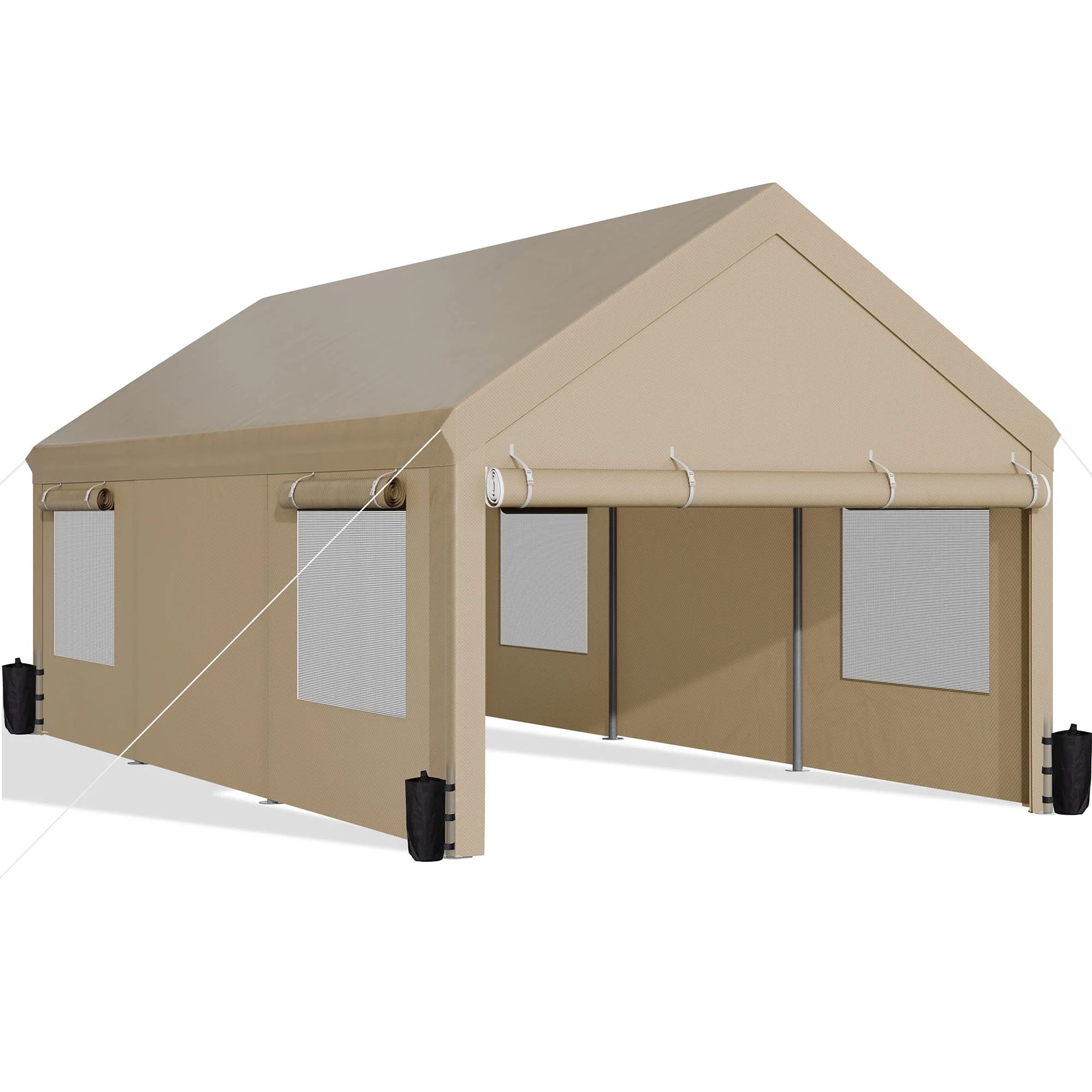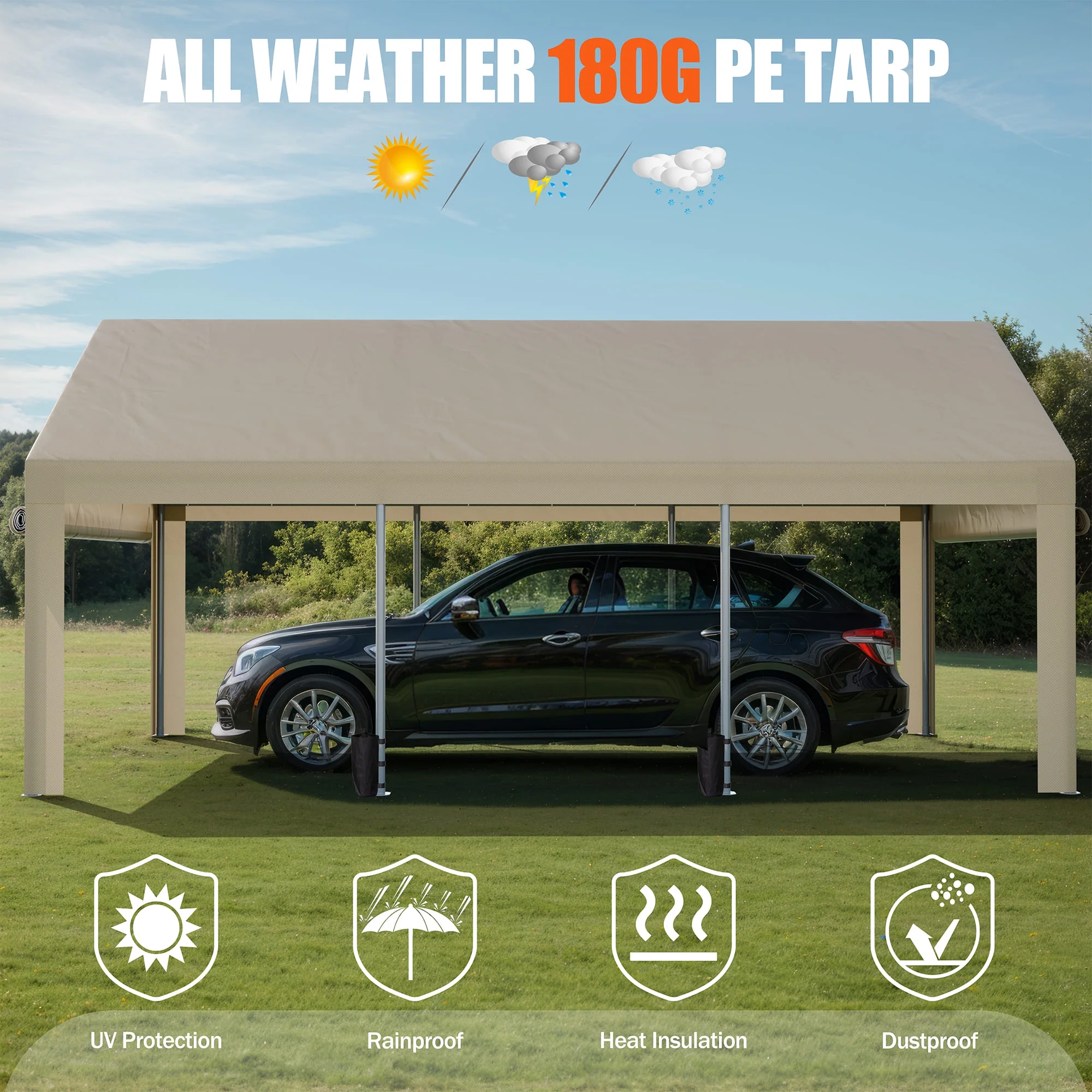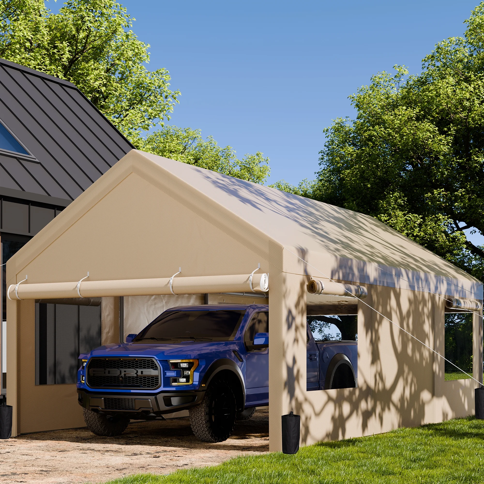 The 12x20 heavy-duty carport canopy provides ample protection for vehicles, boats, and cargo. Designed with versatility in mind, its removable sidewalls and zippered doors make it perfect for storage, commercial exhibitions, weddings, and outdoor events. This spacious shelter includes two detachable sidewalls with roll-up ventilation windows and two zippered doors for enhanced airflow and moisture control. Built with a rust-resistant steel frame and sturdy 1.5-inch diameter legs, it ensures exceptional stability, further reinforced by eight windproof ropes. The 180g waterproof cover offers reliable protection against various weather conditions, securely fastened for durability. Easy to assemble with no extra tools required, this carport canopy combines functionality with convenience.
