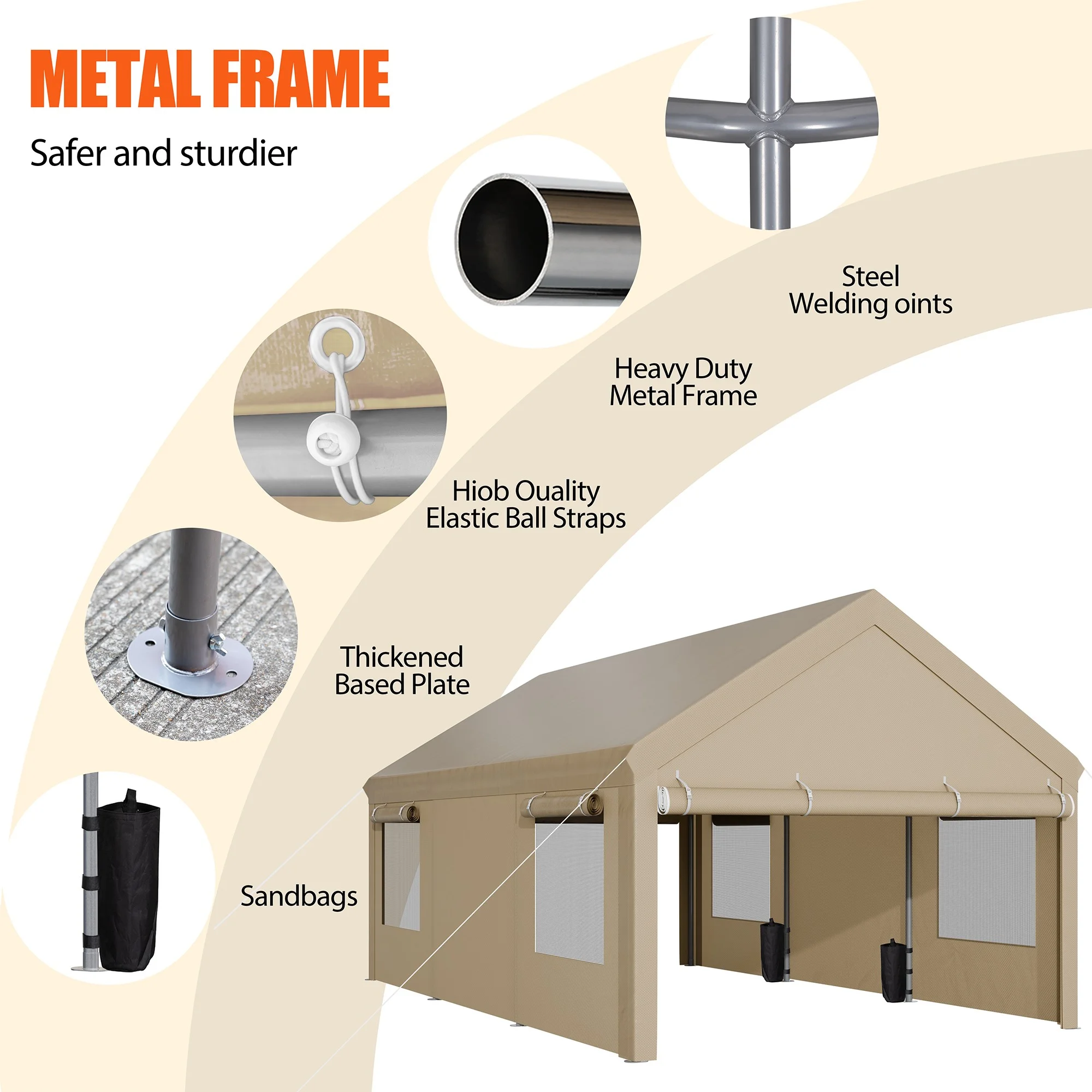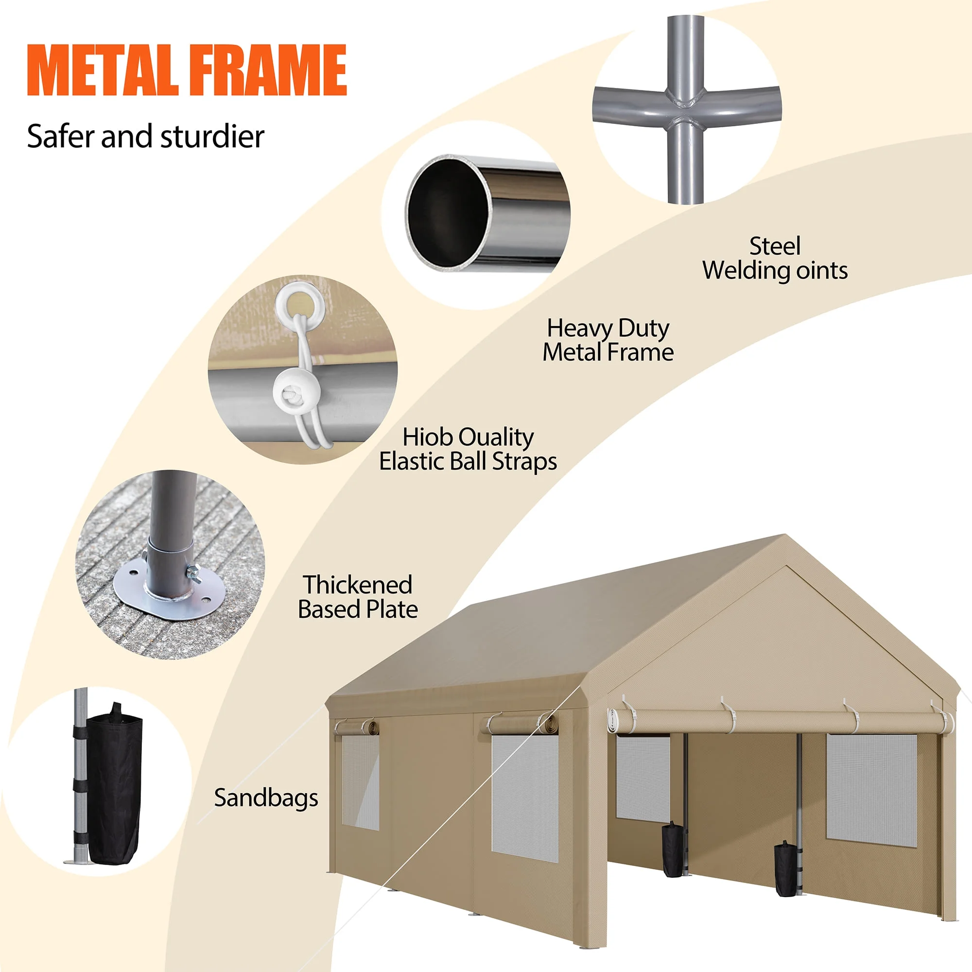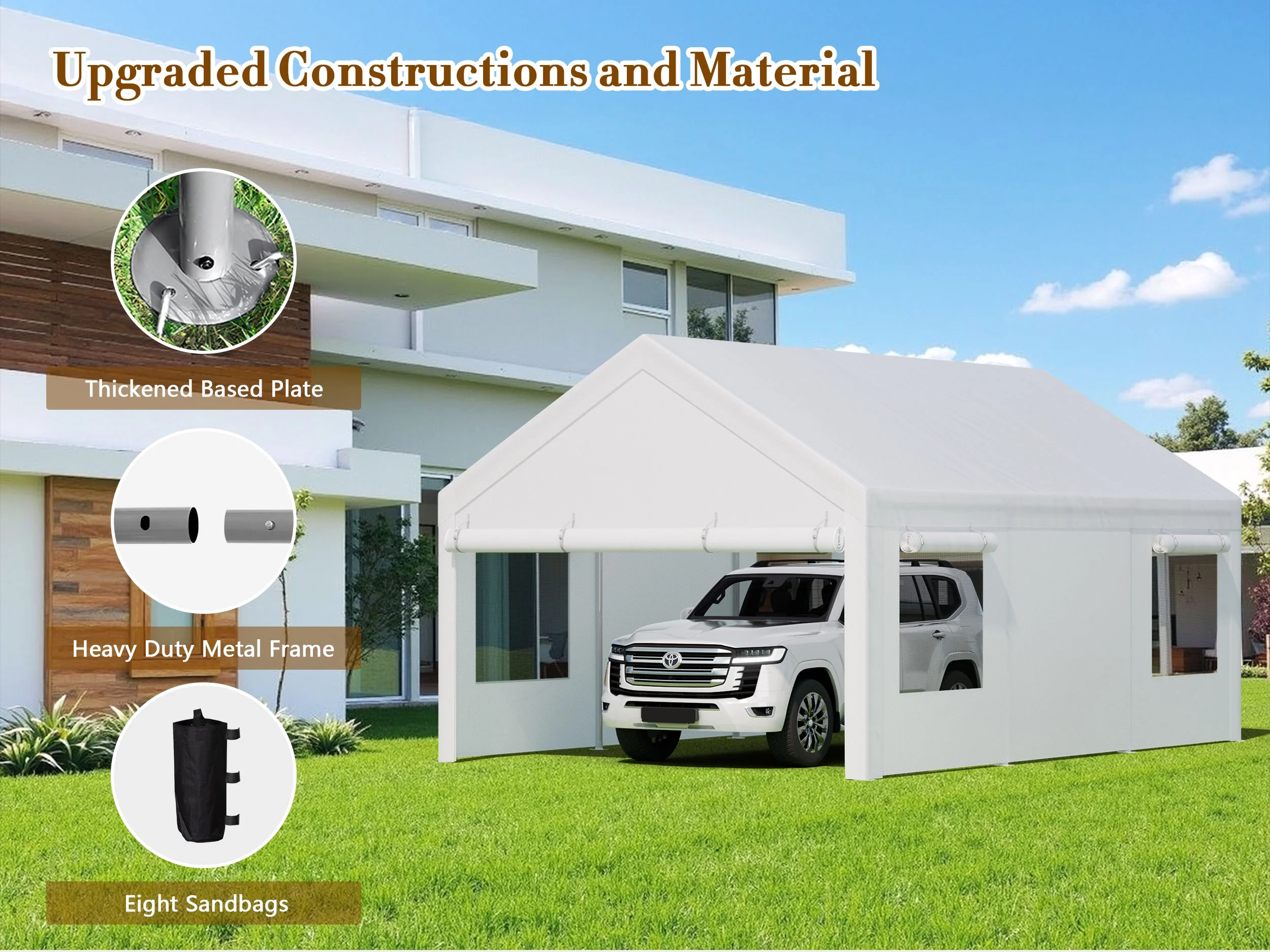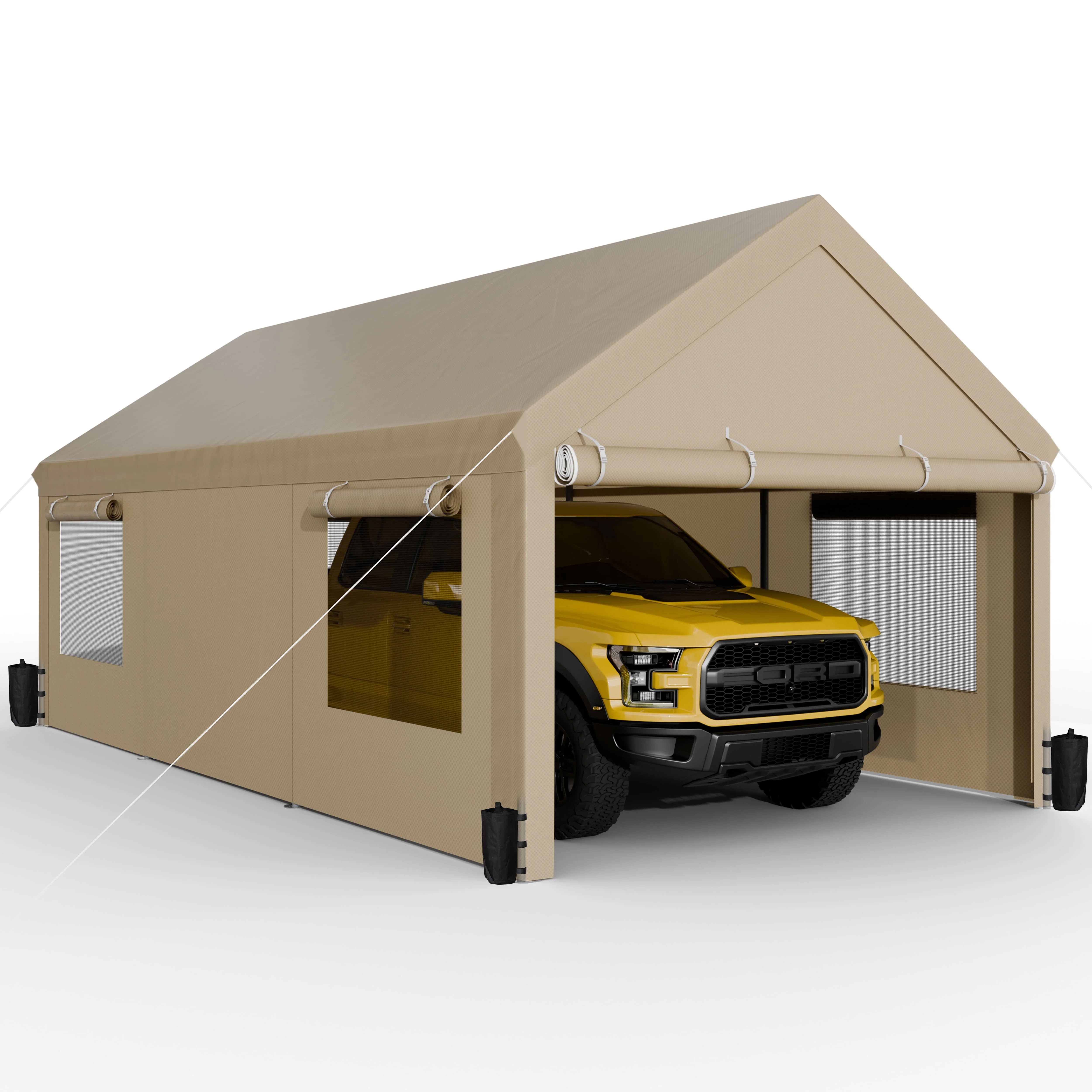 The 12x20 heavy-duty carport canopy provides ample protection for vehicles, boats, and cargo. Designed with versatility in mind, its removable sidewalls and zippered doors make it perfect for storage, commercial exhibitions, weddings, and outdoor events. This spacious shelter includes two detachable sidewalls with roll-up ventilation windows and two zippered doors for enhanced airflow and moisture control. Built with a rust-resistant steel frame and sturdy 1.5-inch diameter legs, it ensures exceptional stability, further reinforced by eight windproof ropes. The 180g waterproof cover offers reliable protection against various weather conditions, securely fastened for durability. Easy to assemble with no extra tools required, this carport canopy combines functionality with convenience.