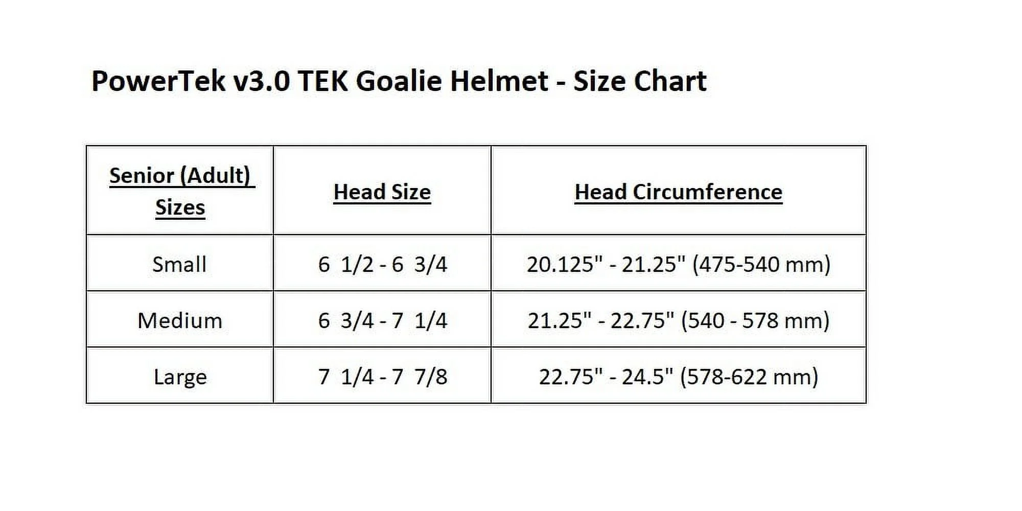 - For PowerTek Goalie Helmet sizing, see Size Chart in images
