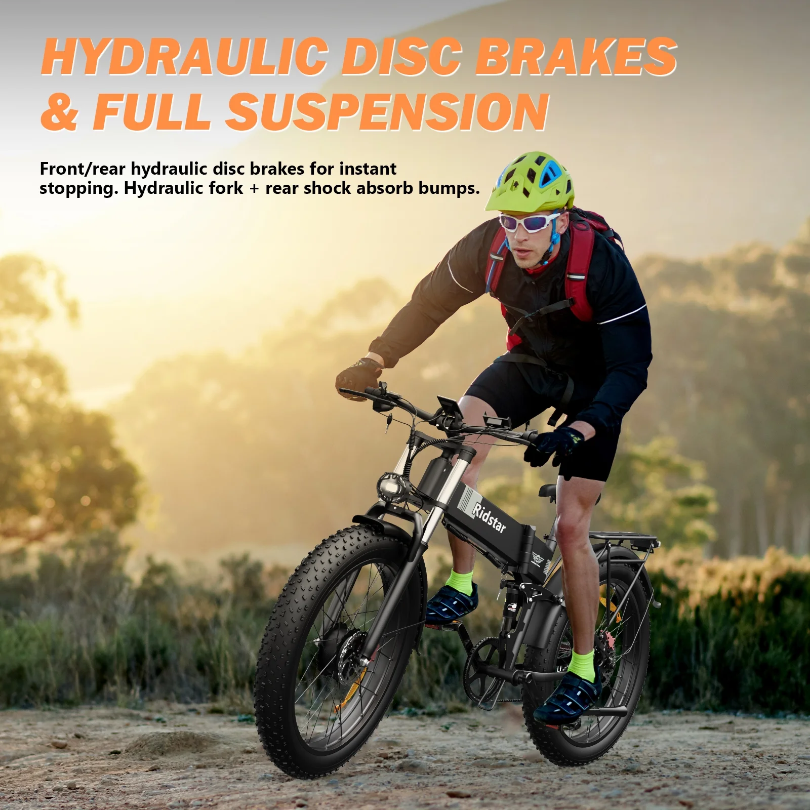 - ��???????? ???????????????????? & ?????????????????? ???????? ????????????�� The reinforced 100% front suspension fork enhances maneuverability on rough terrains, while a rear hydraulic shock absorber delivers superior performance. Hydraulic dual brakes significantly reduce stopping distance by 50%. With 26 x 4.0'' fat tires, you��ll experience increased stability, allowing you to ride confidently on any bumpy surface.