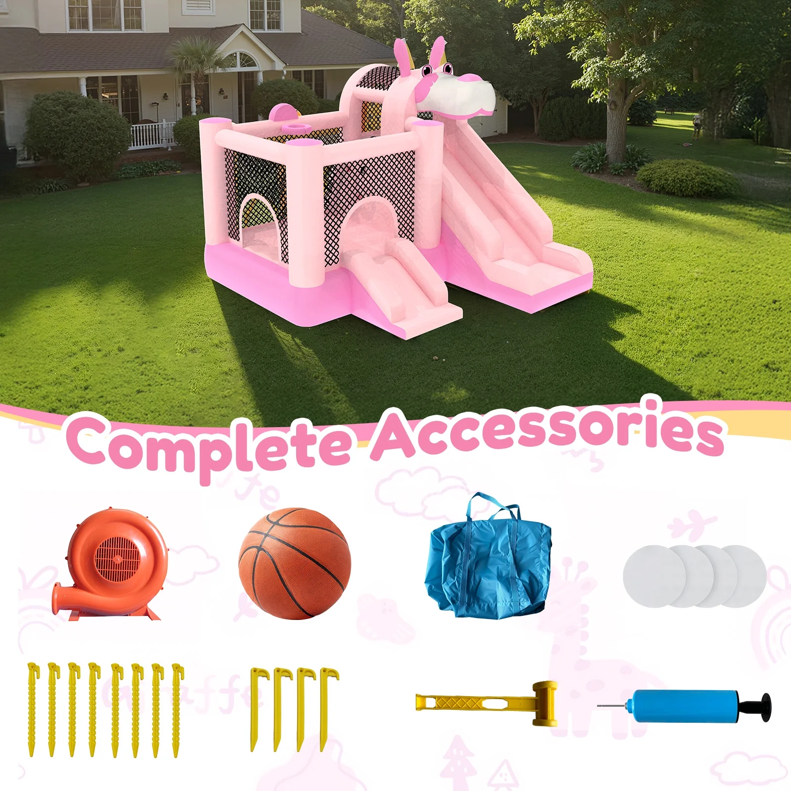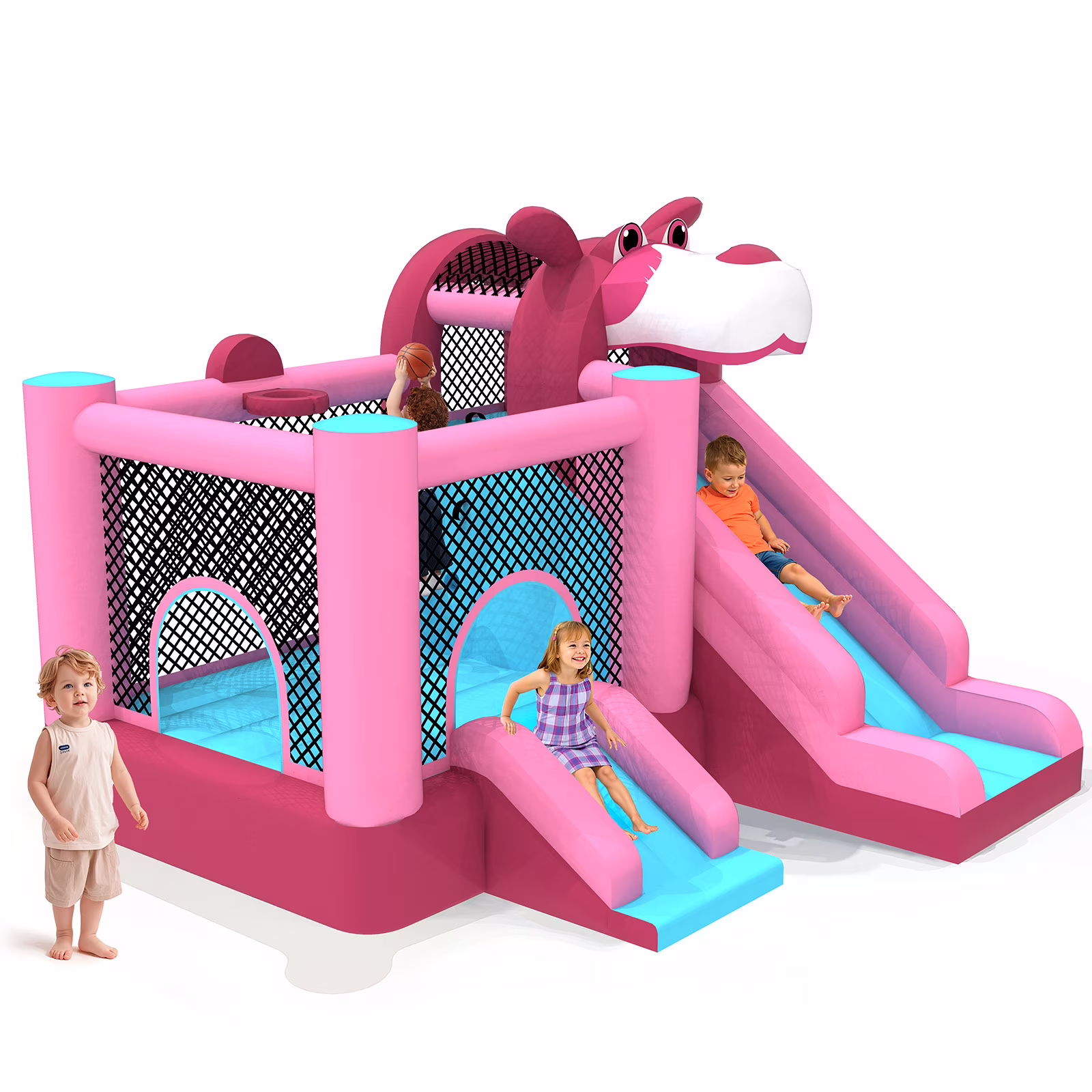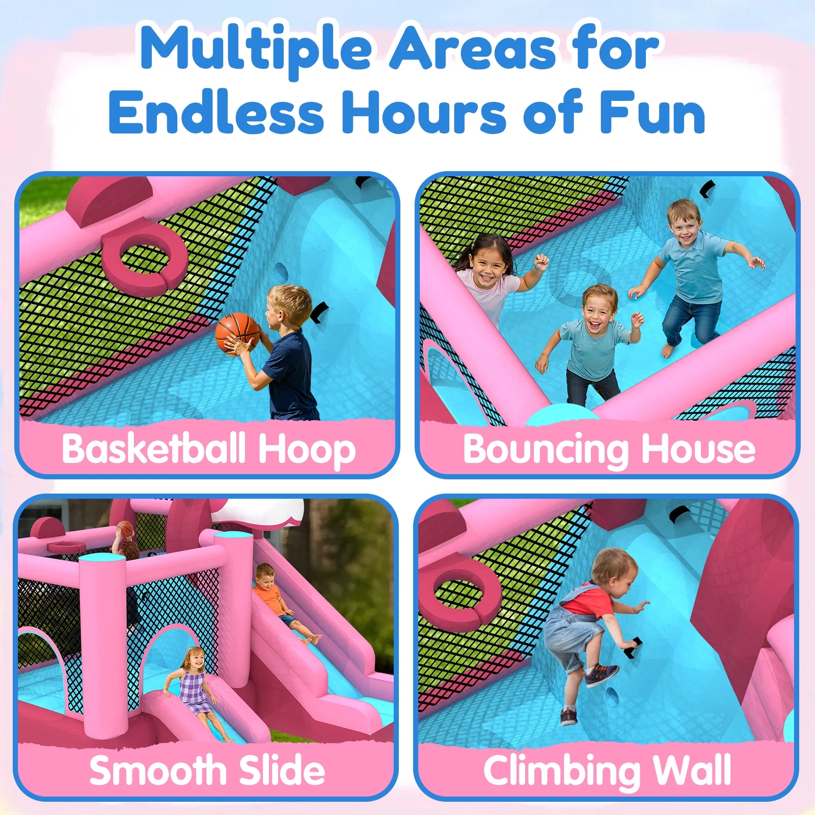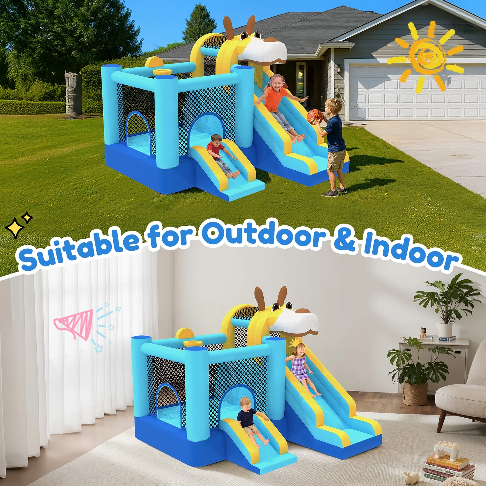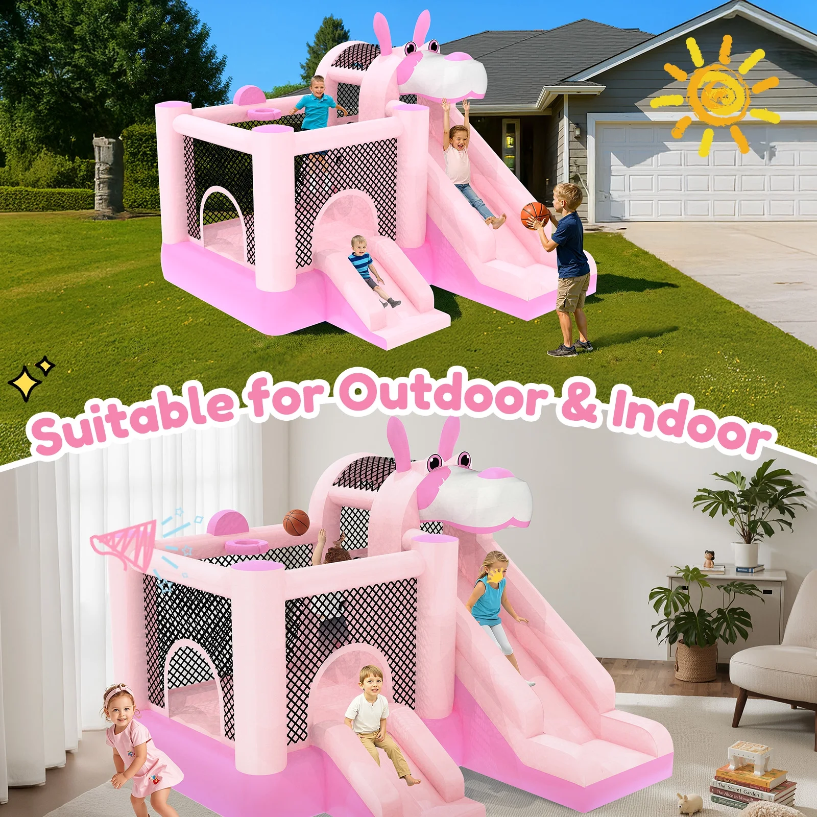 - ??��3-in-1 Design for Infinite Fun��: This inflatable castle features a spacious jumping area and a smooth slide that add an extra element of thrill and adventure. In addition, the built-in basketball hoop allows kids to practice shooting skills and engage in friendly competition.