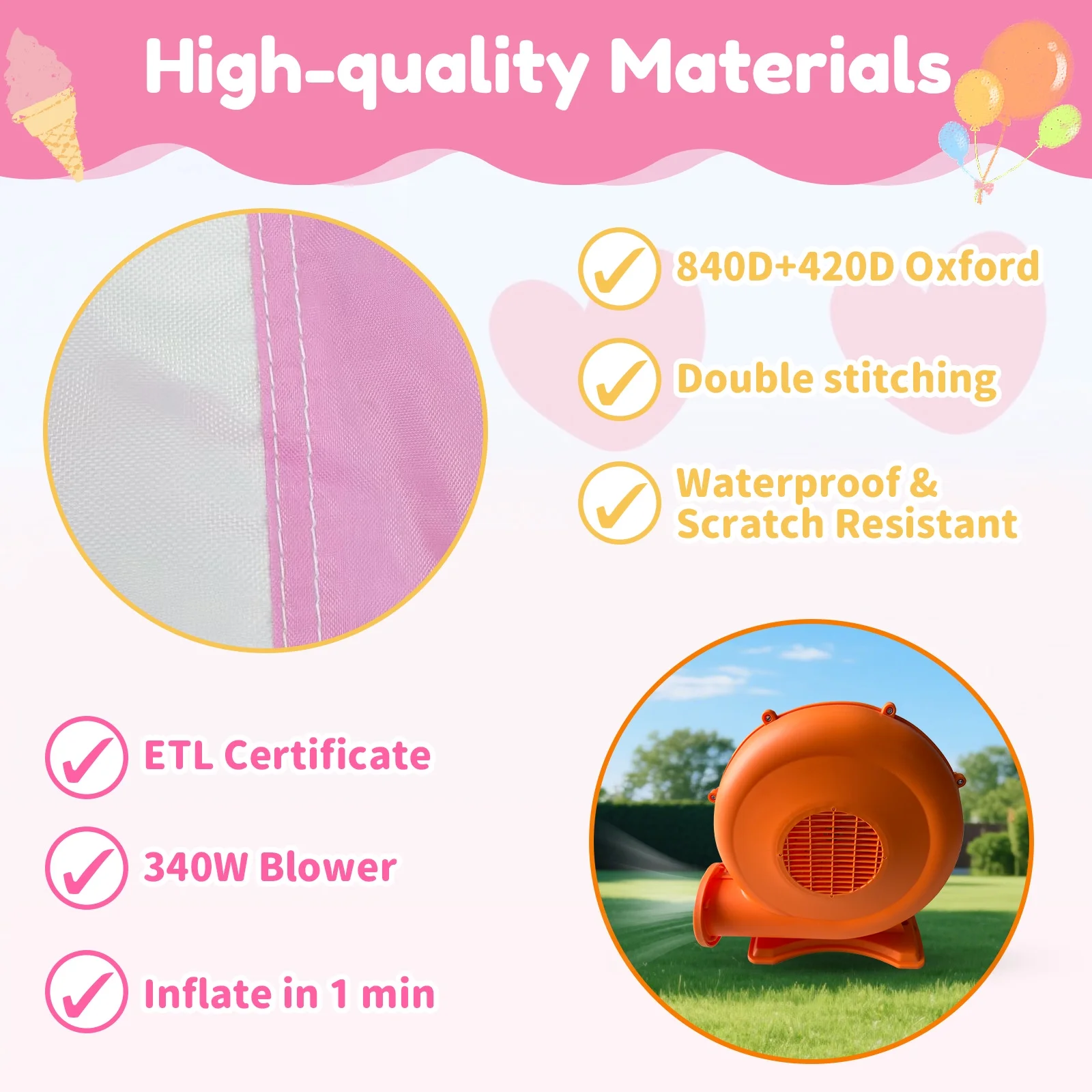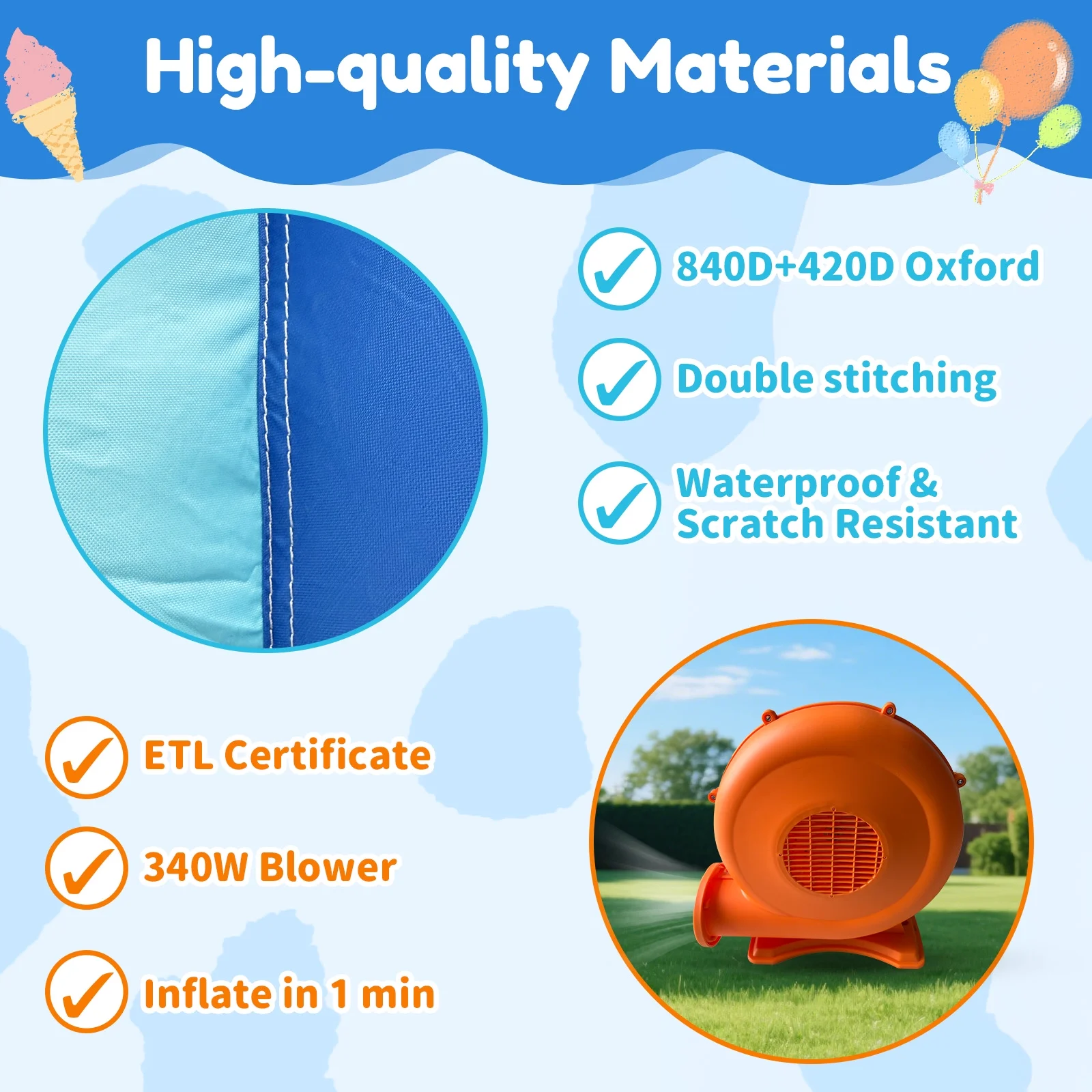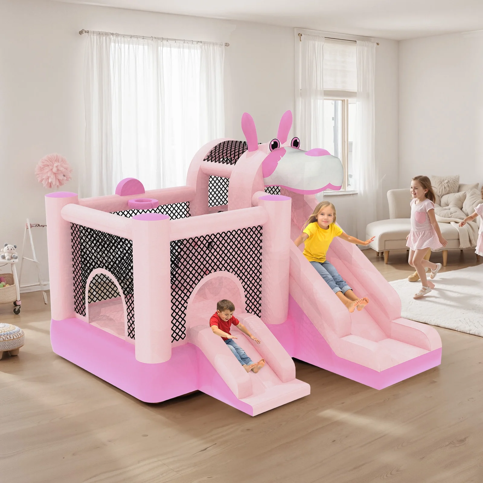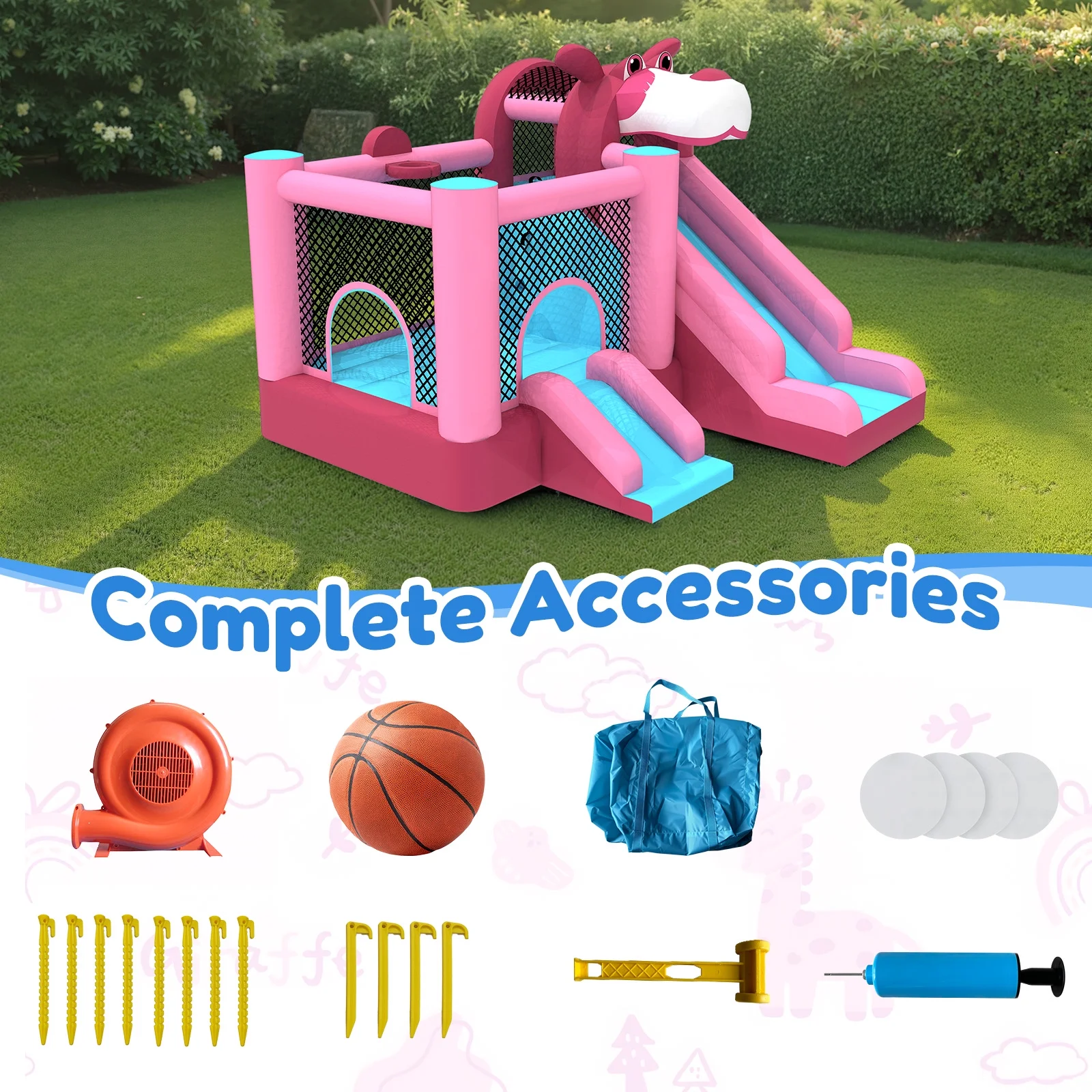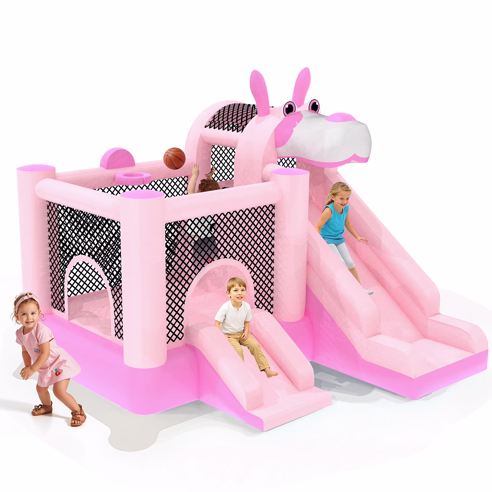 - ??��3-in-1 Design for Infinite Fun��: This inflatable castle features a spacious jumping area and a smooth slide that add an extra element of thrill and adventure. In addition, the built-in basketball hoop allows kids to practice shooting skills and engage in friendly competition.
