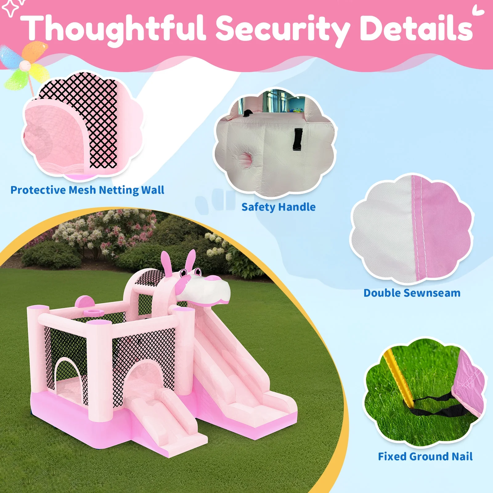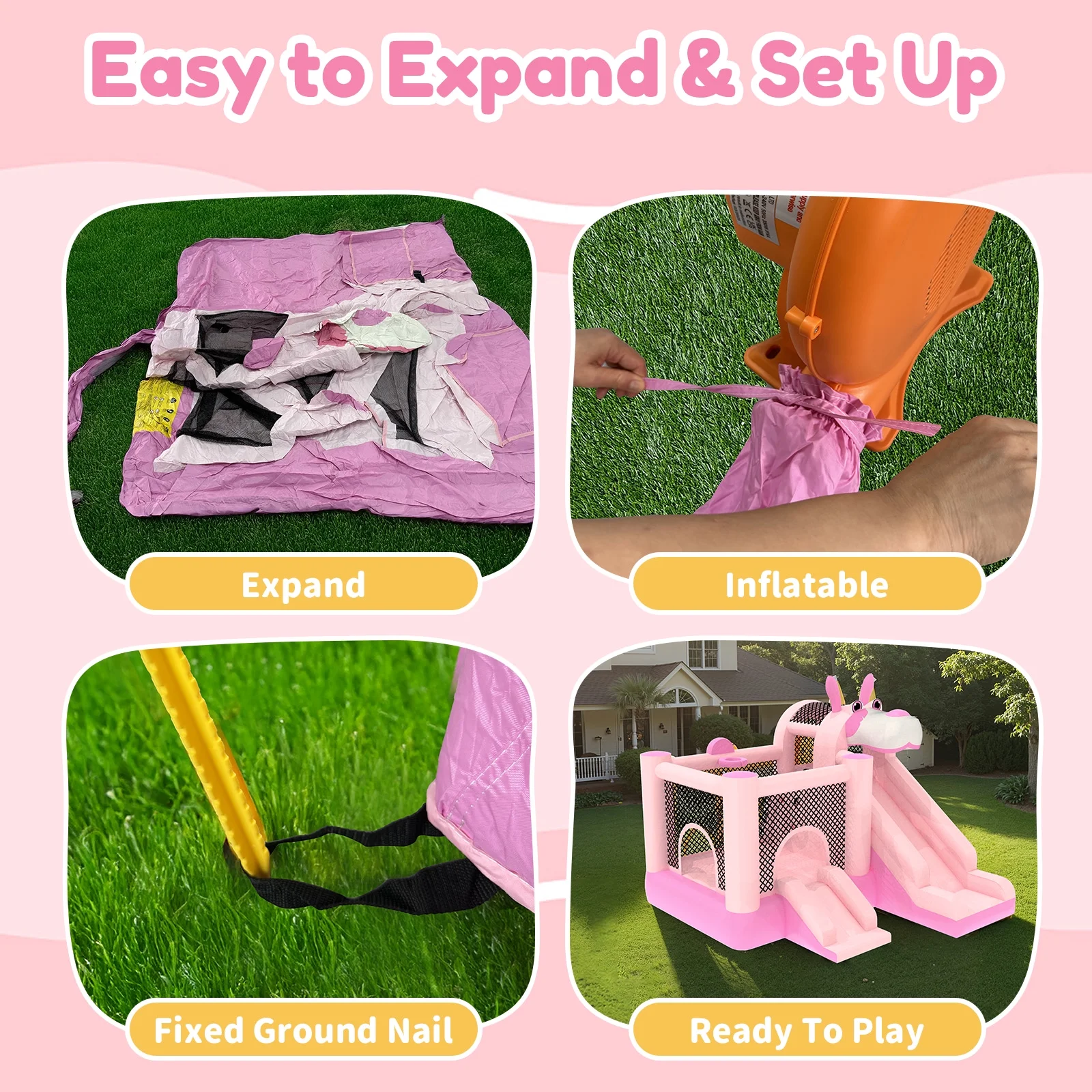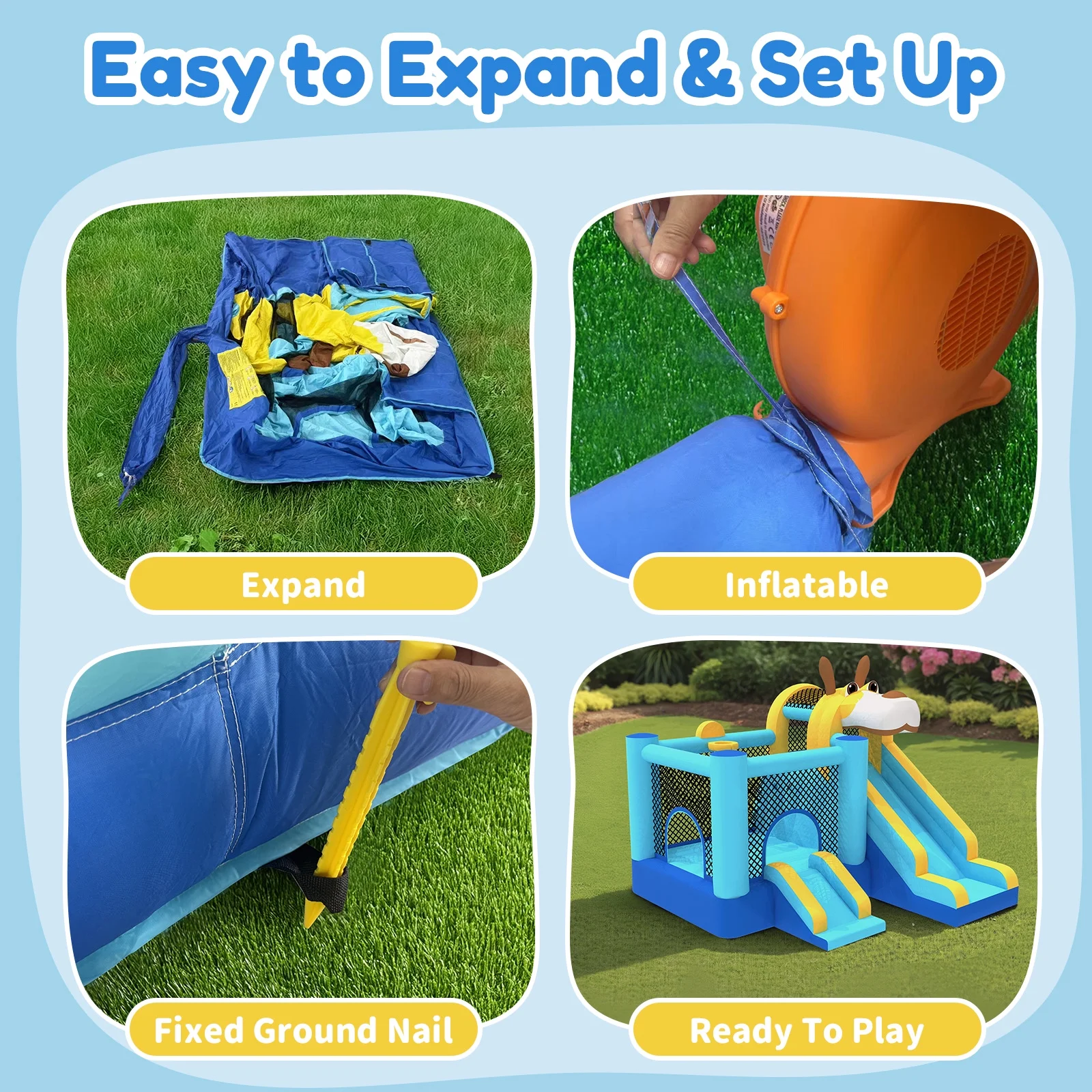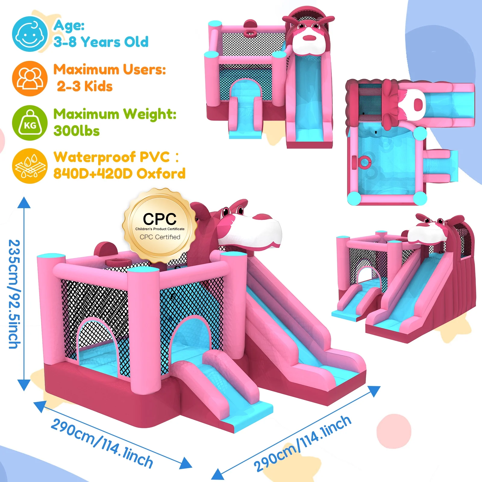 - ��Enhanced Safety Protection��: Safety is a top priority with a mesh protective wall surrounding the jumping area to prevent falls and enable easy supervision. Also, 4 ground stakes are included to secure the bouncer when used outdoors. Note: The inflatable house can accommodate up to 3 children aged 3-8 years old playing at the same time. Maximum weight capacity is 300 lbs.