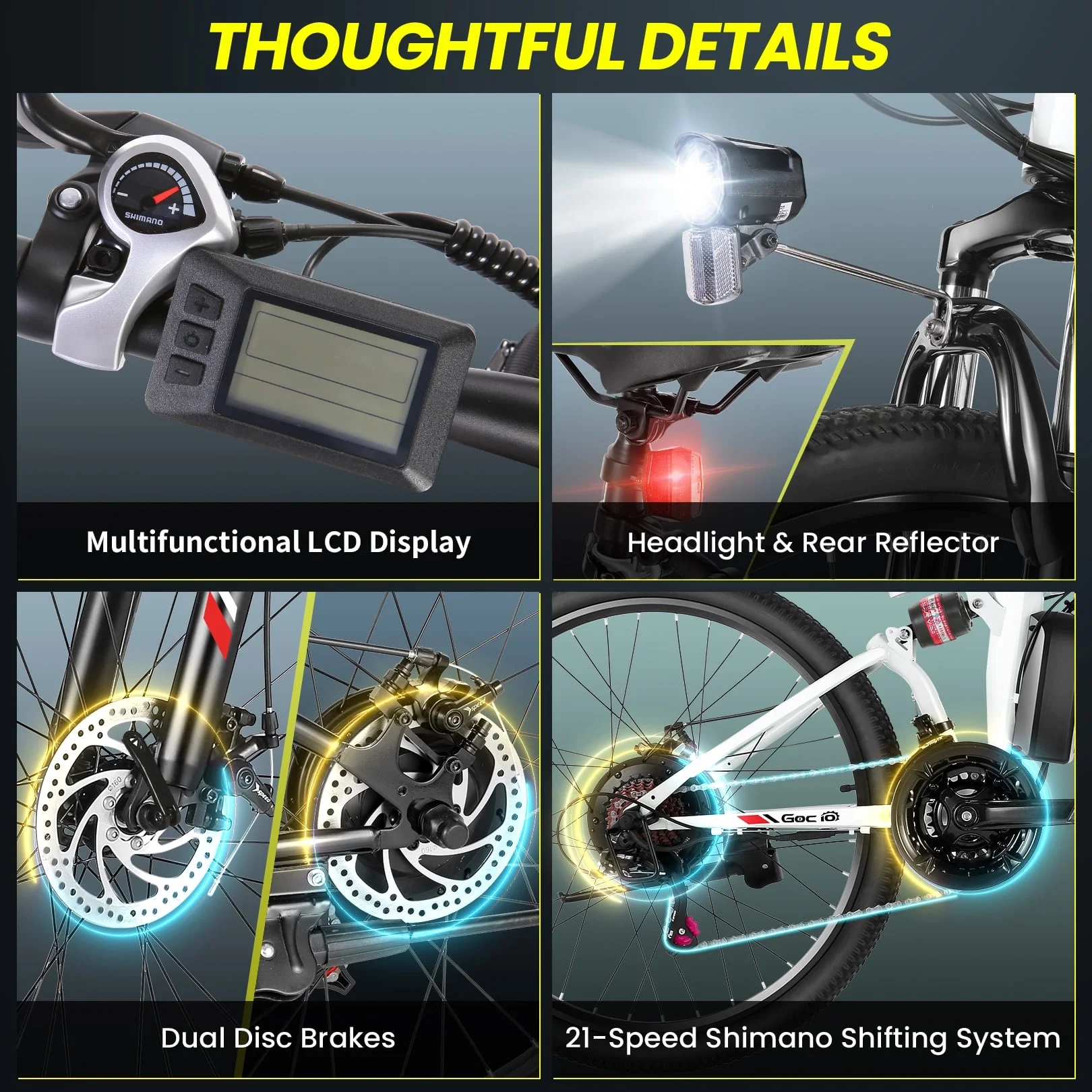 is designed with a durable carbon steel folding frame and dual shock absorption for a comfortable journey, complemented by a Shimano 21-speed transmission for tackling various terrains. Riders can choose from five riding modes, including electric