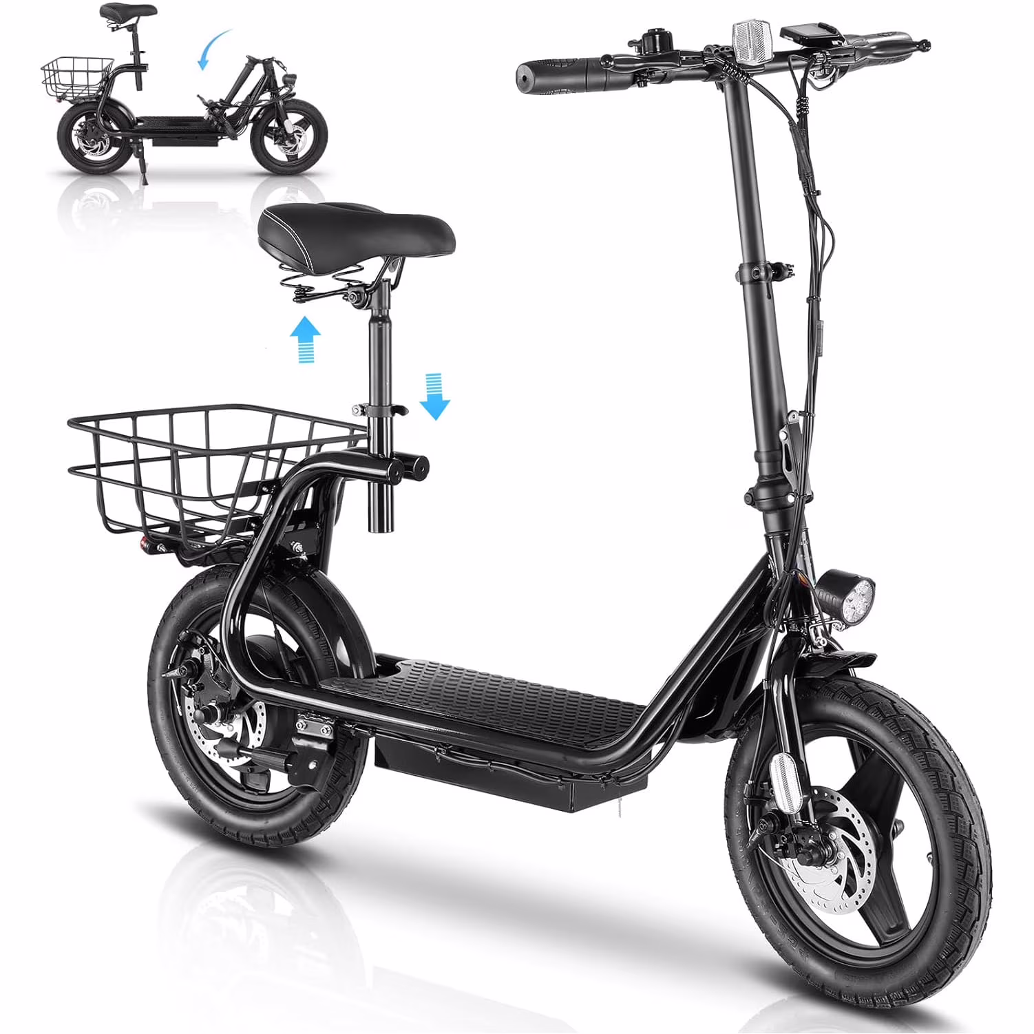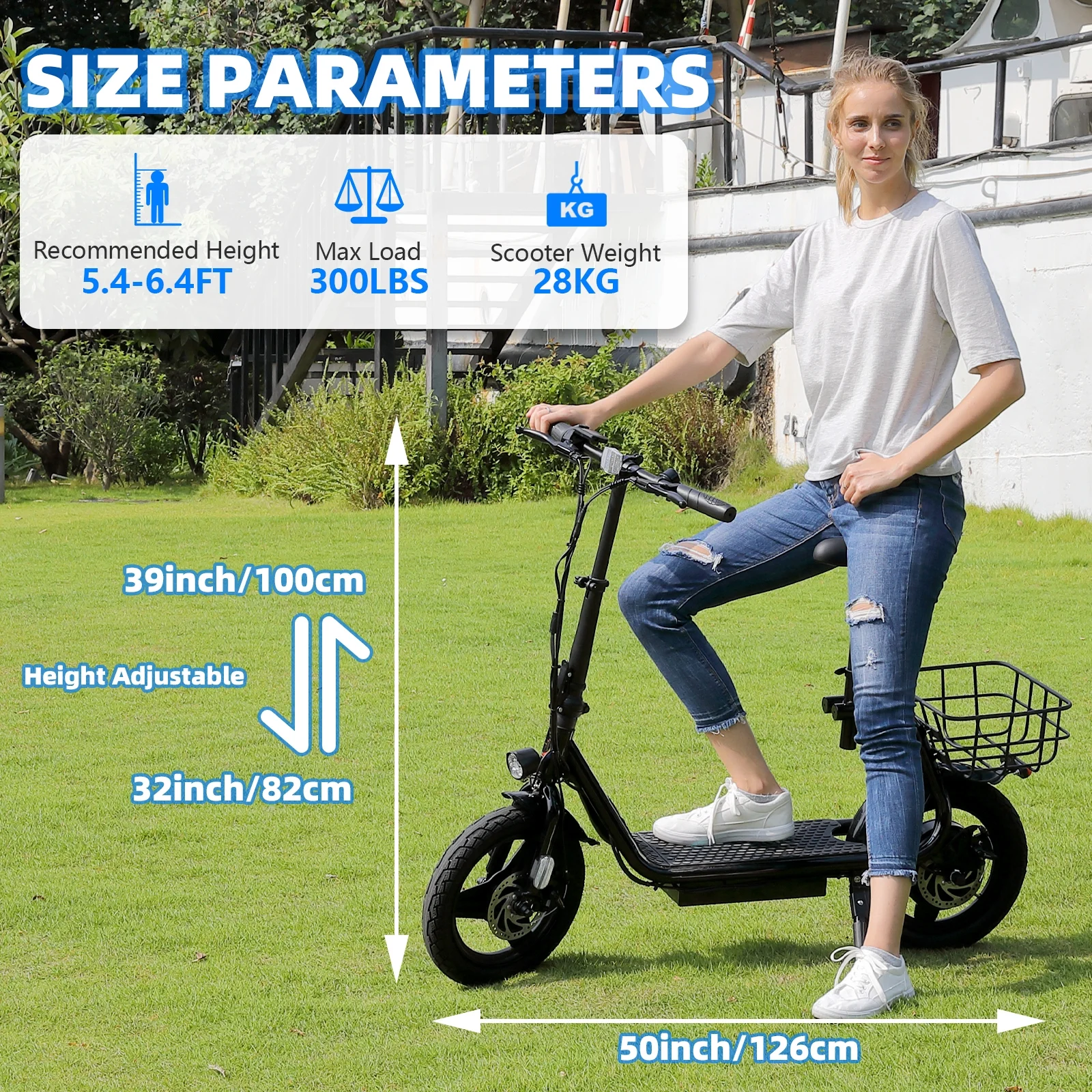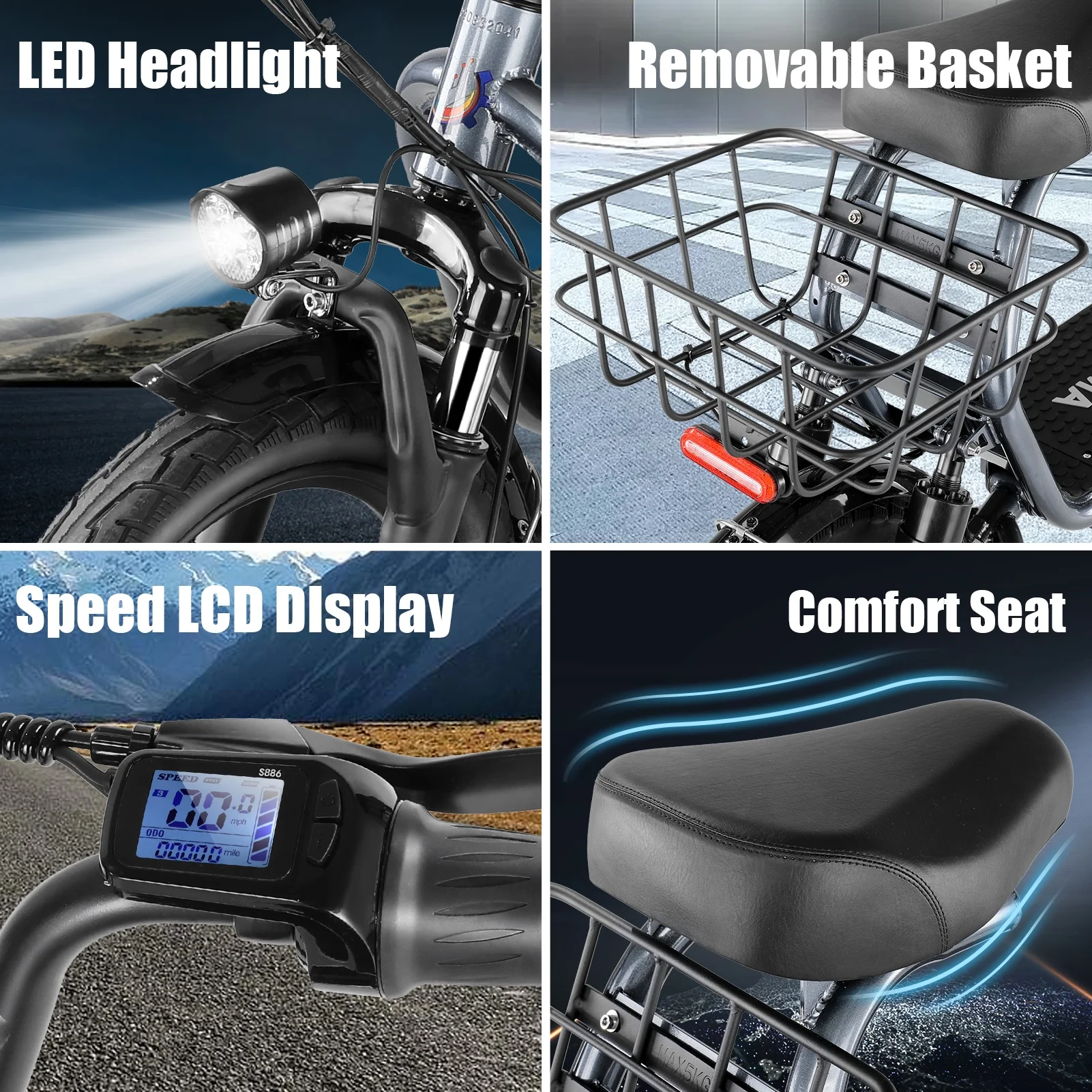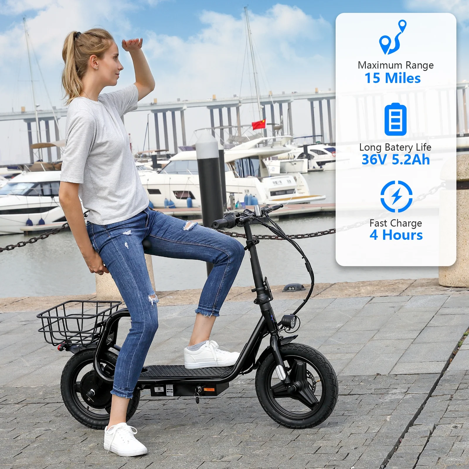 ?Design for Commuters: SANOPY Eletric scooter for adults comes with a basket above the rear wheel, perfect for shopping trips and short errands around the block. Built-in spot headlight makes the road visible and safe to ride at night.