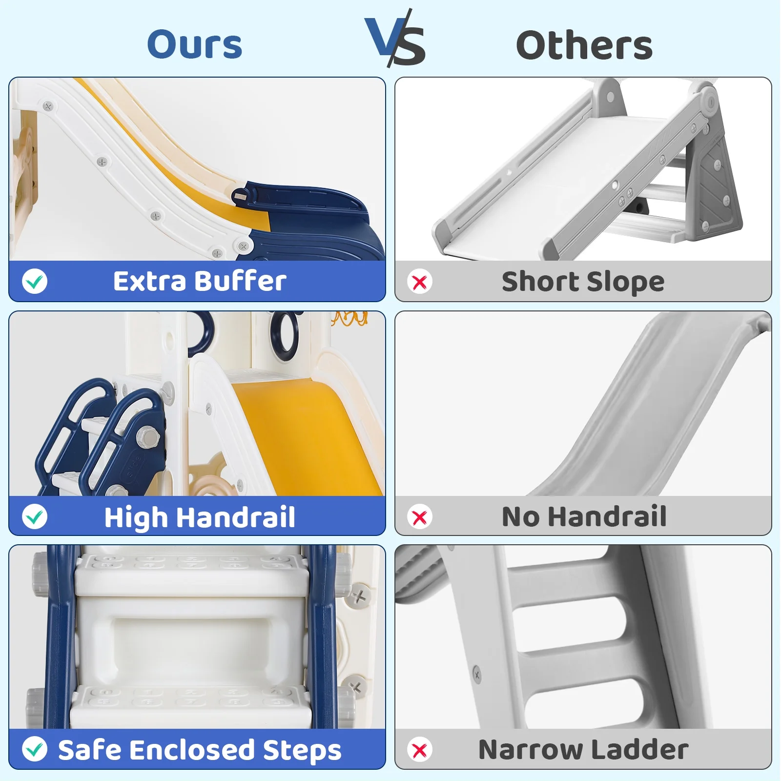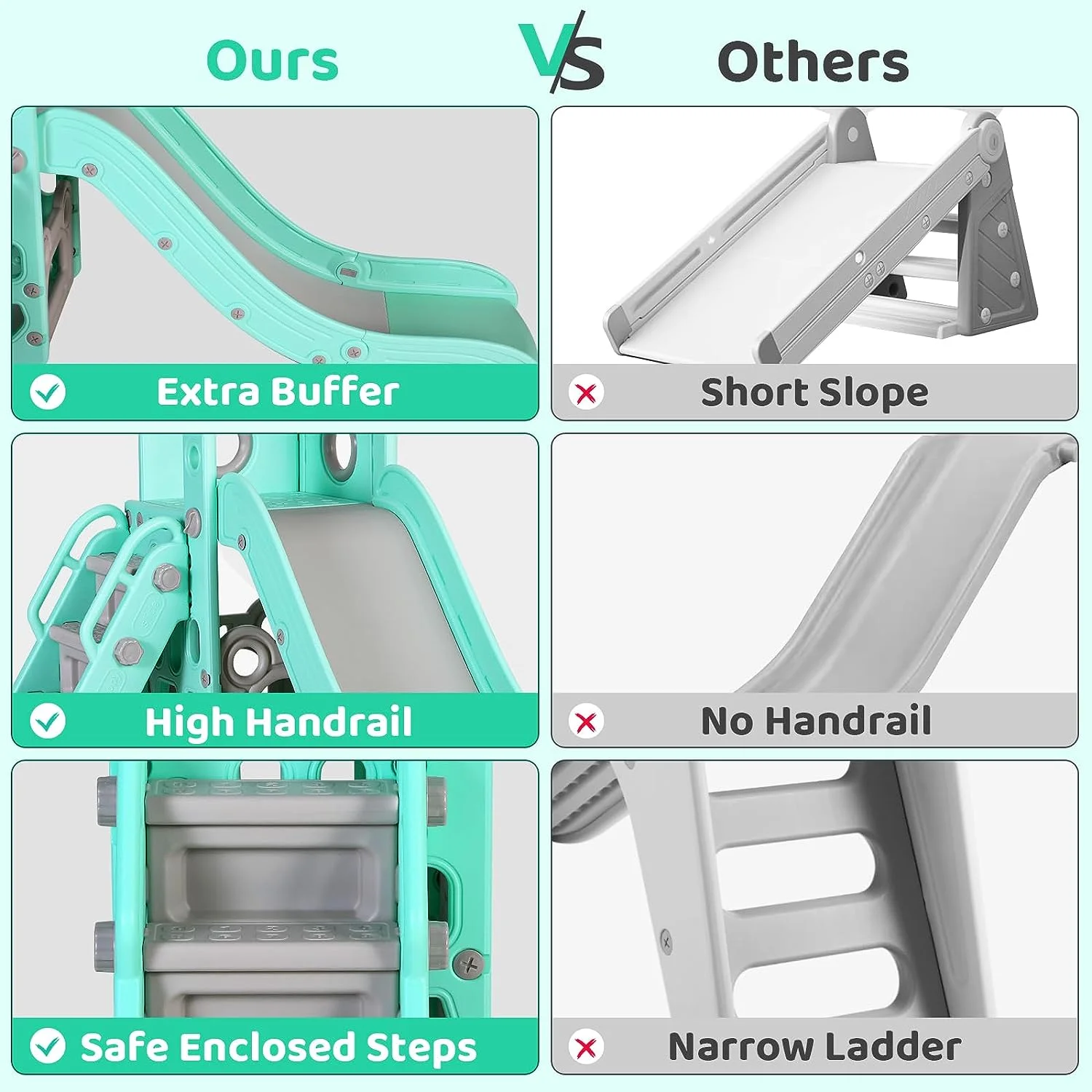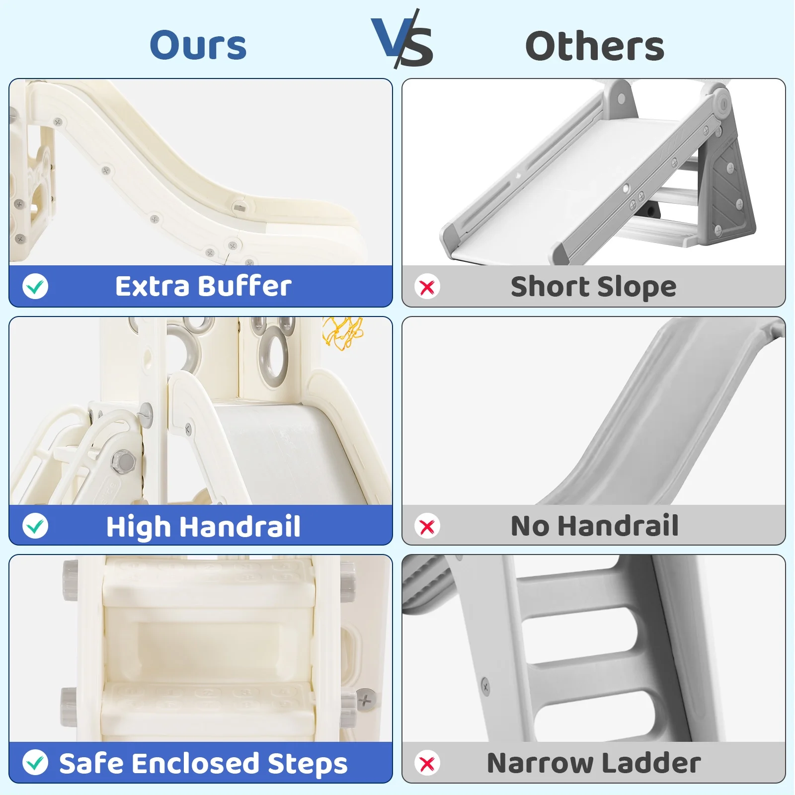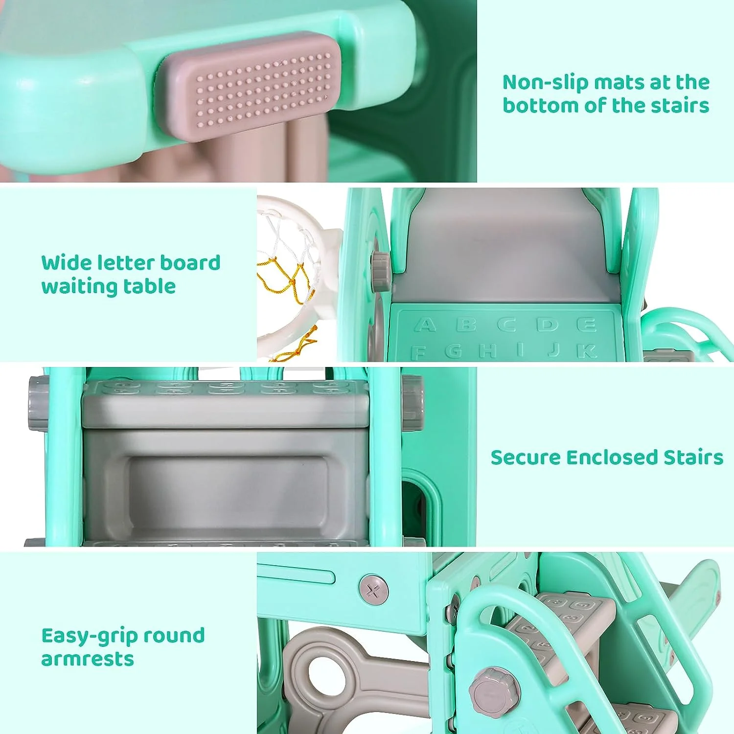 - 4-in-1 Fun Design: Features long slide, handrail climber, basketball hoop, and storage. Wide slideway with 3 speed zones for exciting play.