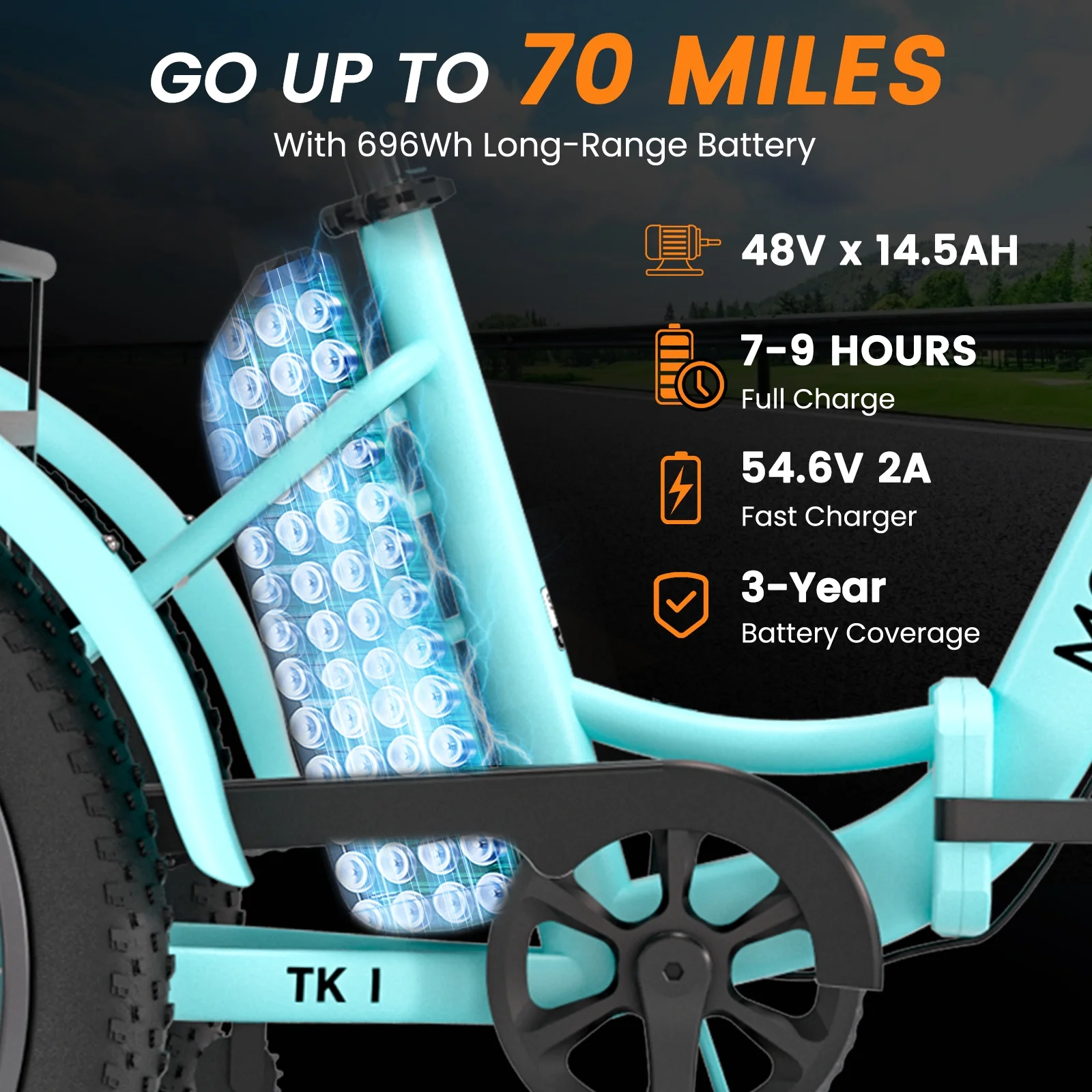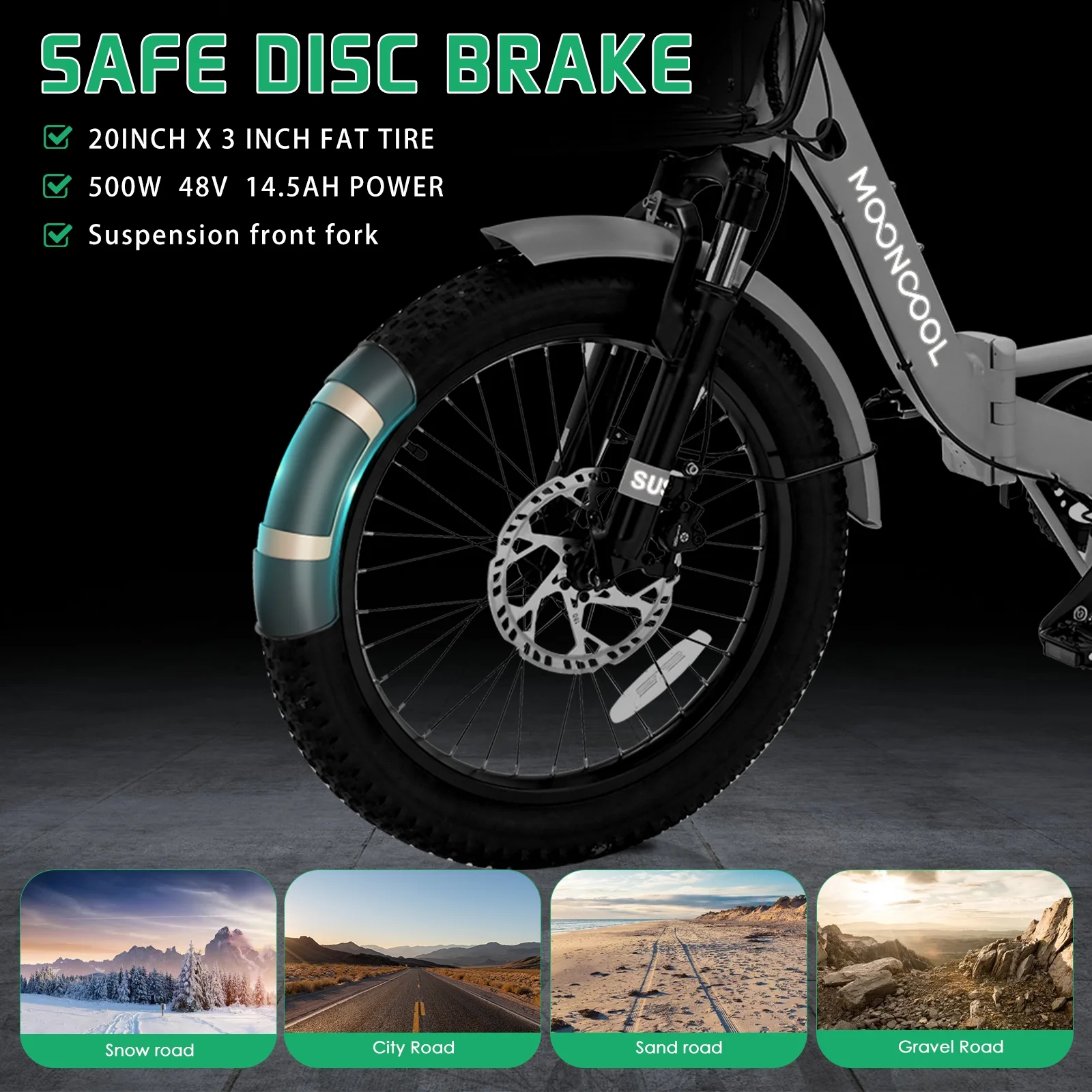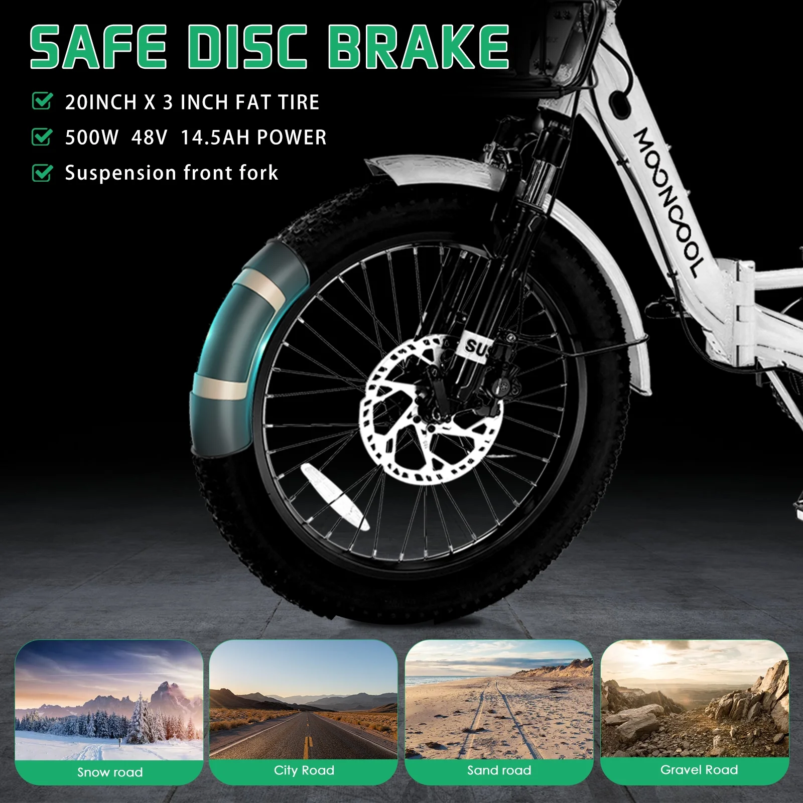 3.3'' Fat Tires & Shock Absorber: The newly upgraded 3.3'' wide puncture-resistant fat tires have better performance and a cooler appearance. With excellent suspension front fork and Seat Post. In addition to city roads, can ride on snow, beaches, rugged mountain roads, etc.