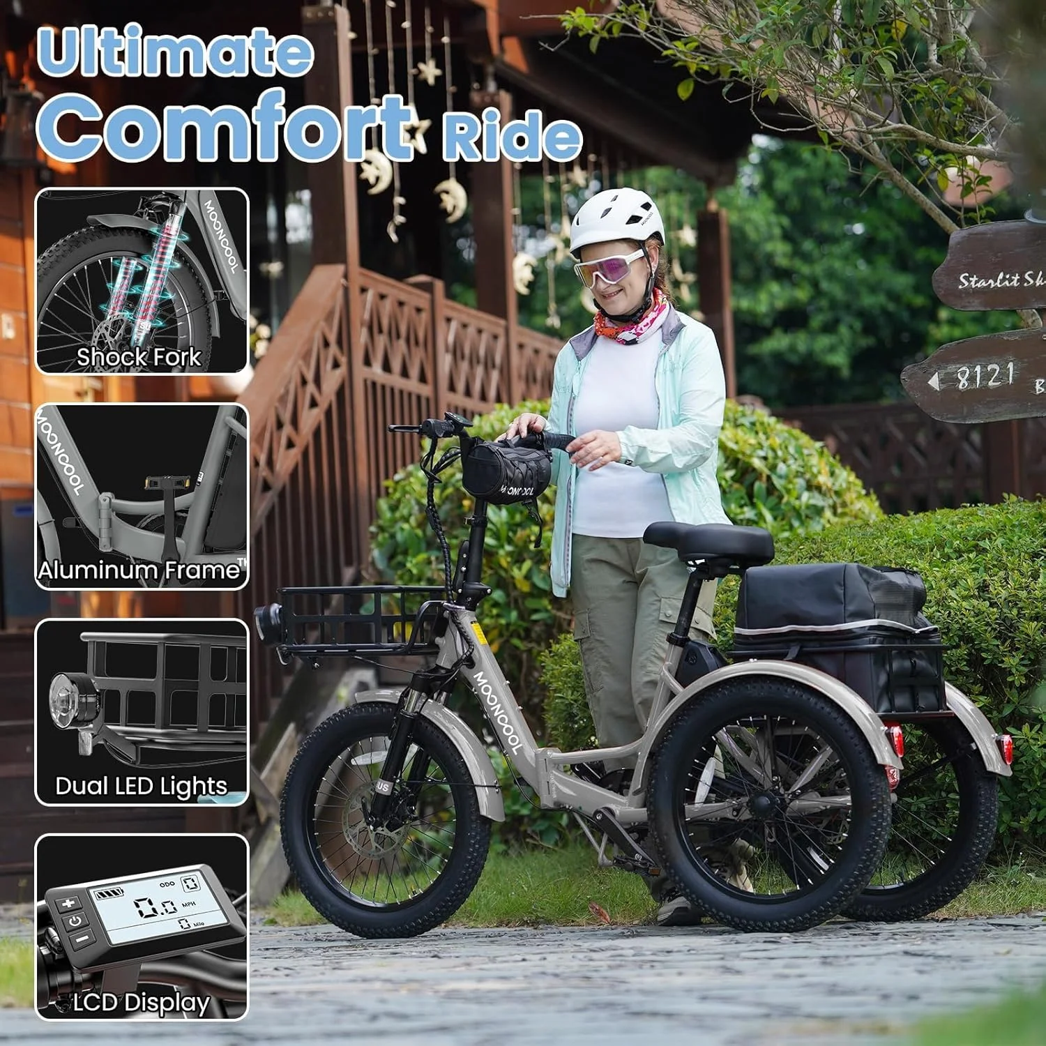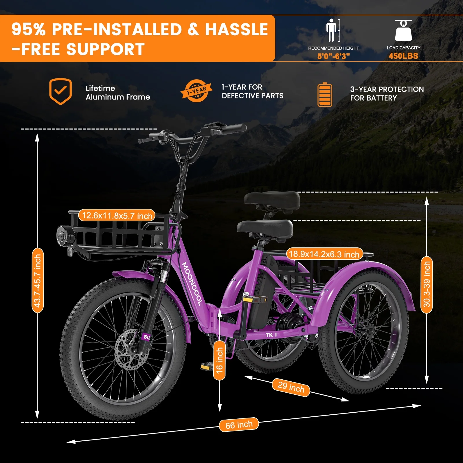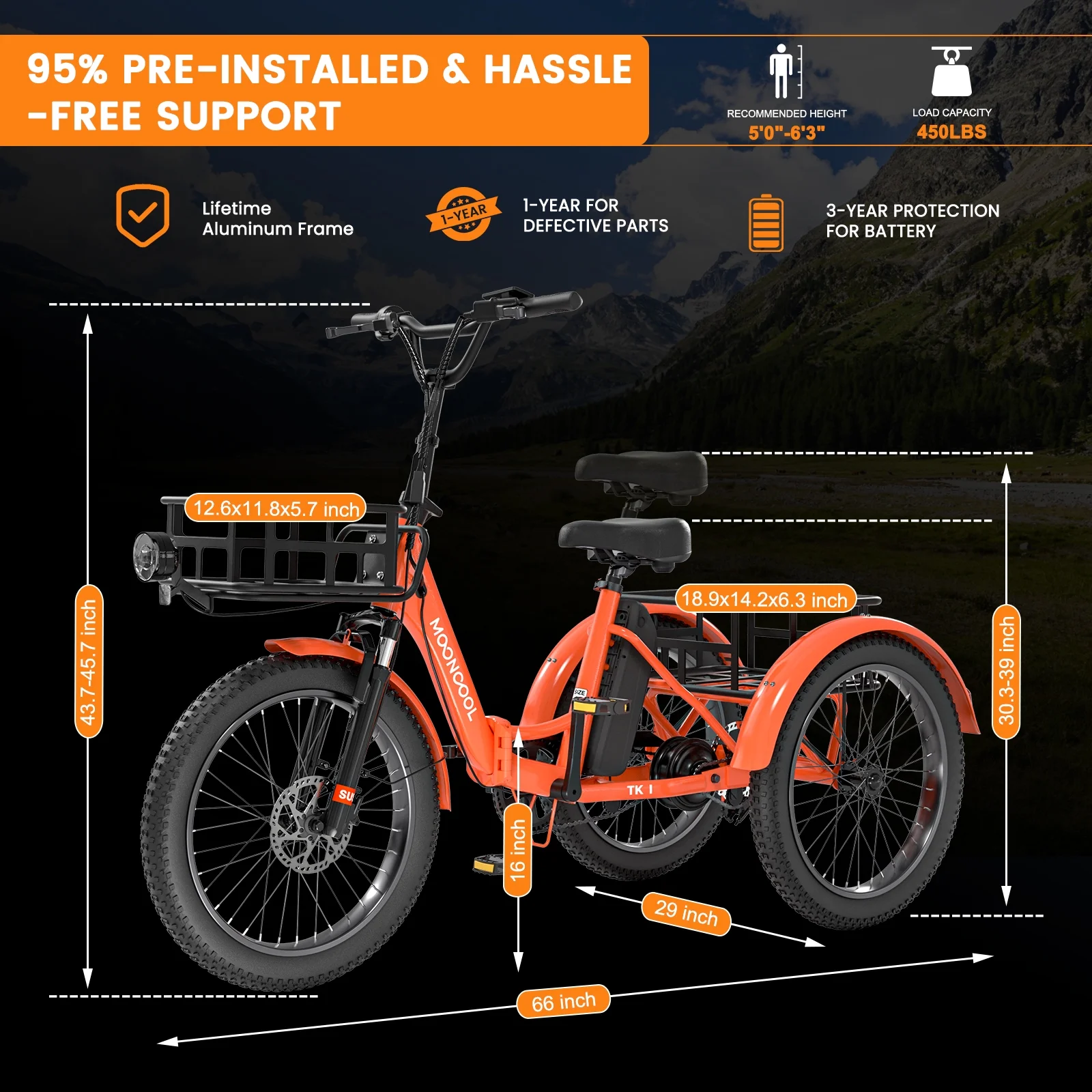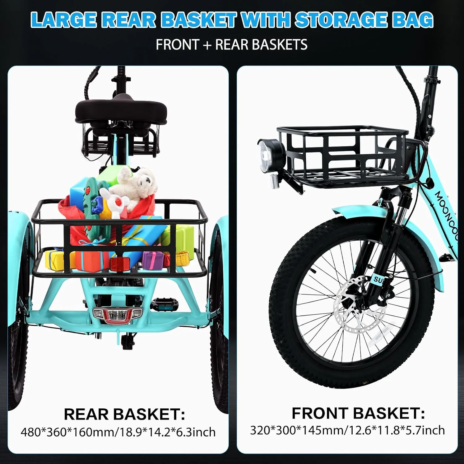 SIZE And Front & Rear basket: 20 inch Adult electric bicycles is suitable for 4.2 to 6.9 ft height; The load capacity of the 3 wheel electric bicycle is 450LBS. MOONCOOL electric tricycle for adults offers a front basket and a large rear basket, perfect for groceries, supplies. The rear basket is designed to be pet-friendly, ensuring a safe and comfortable travel experience for your furry companions.