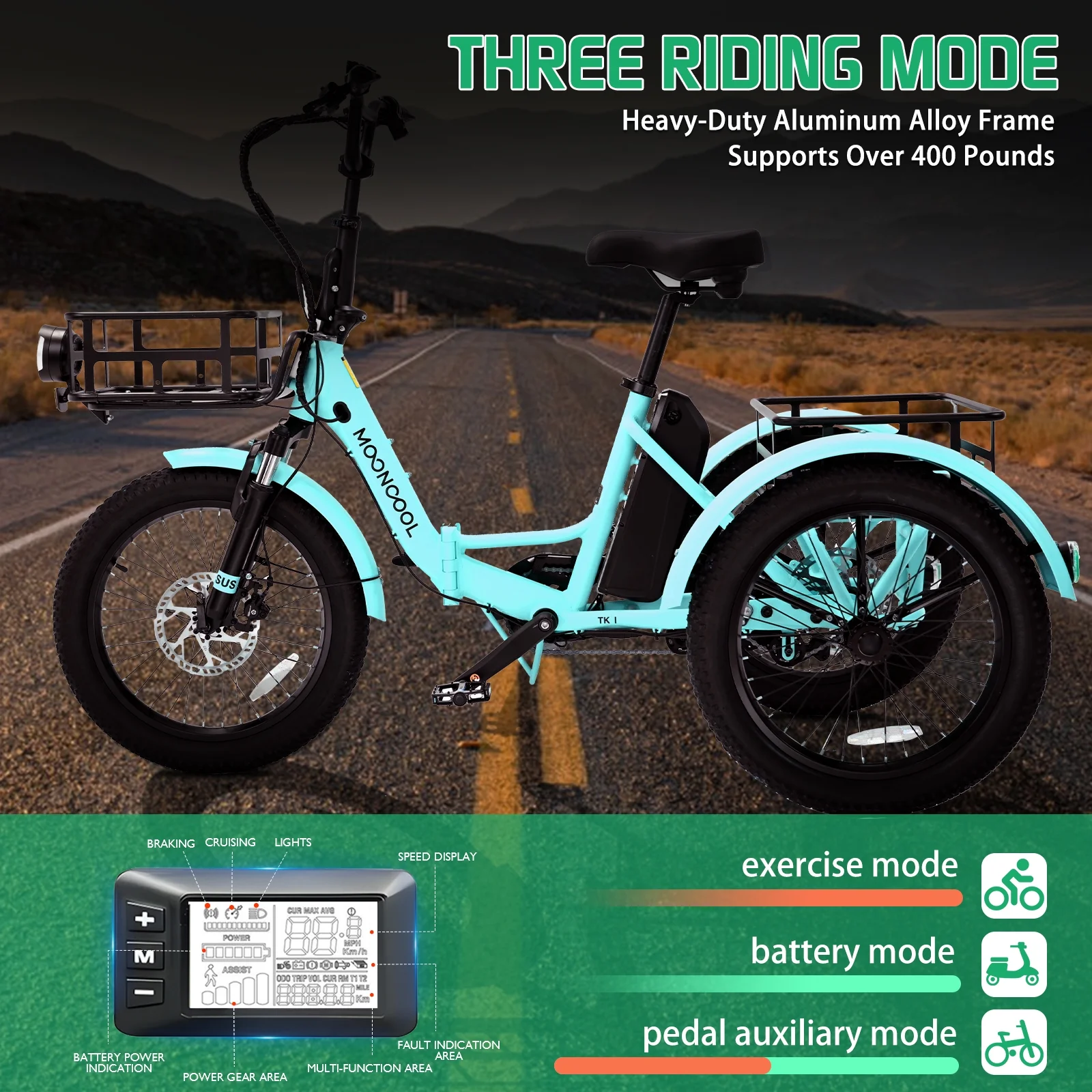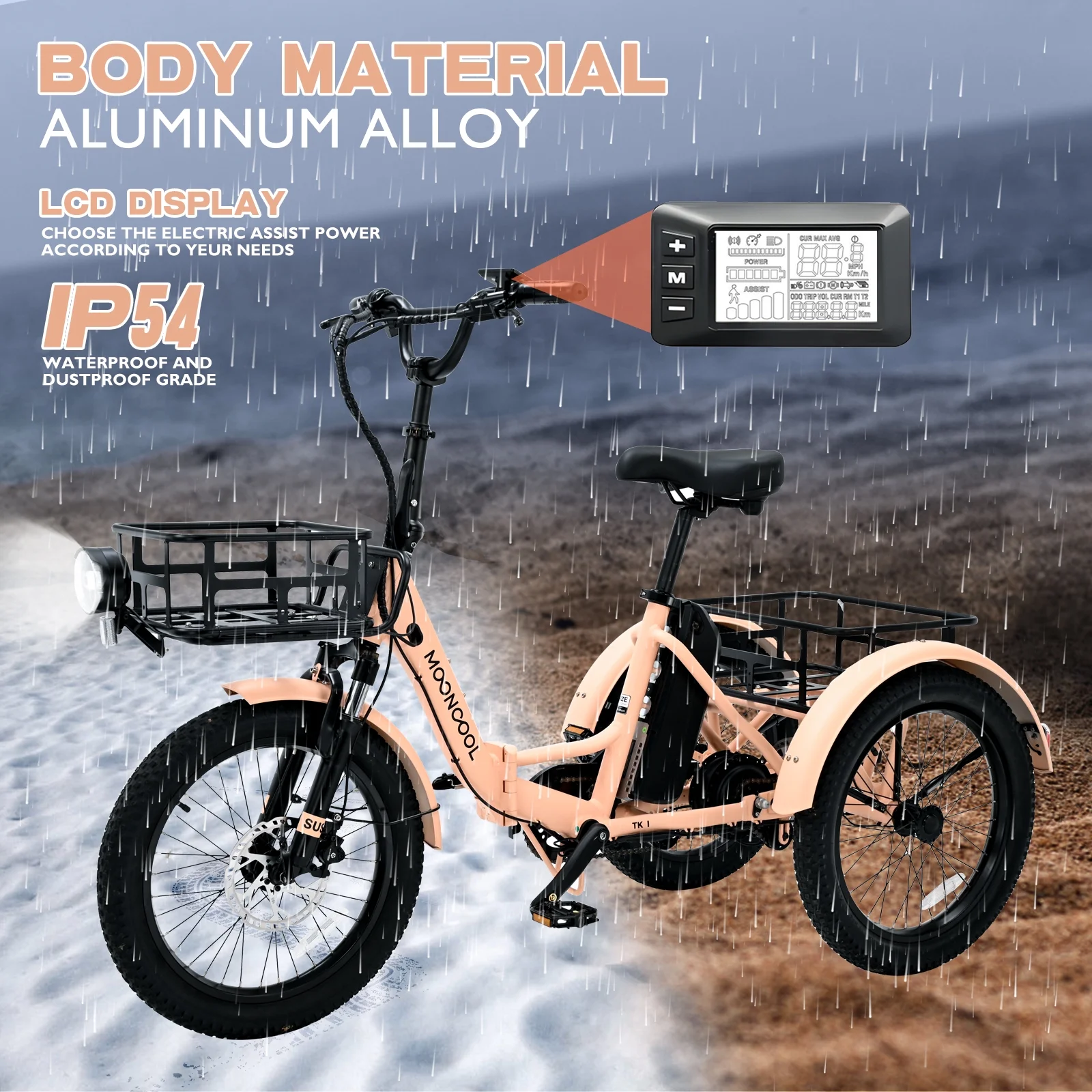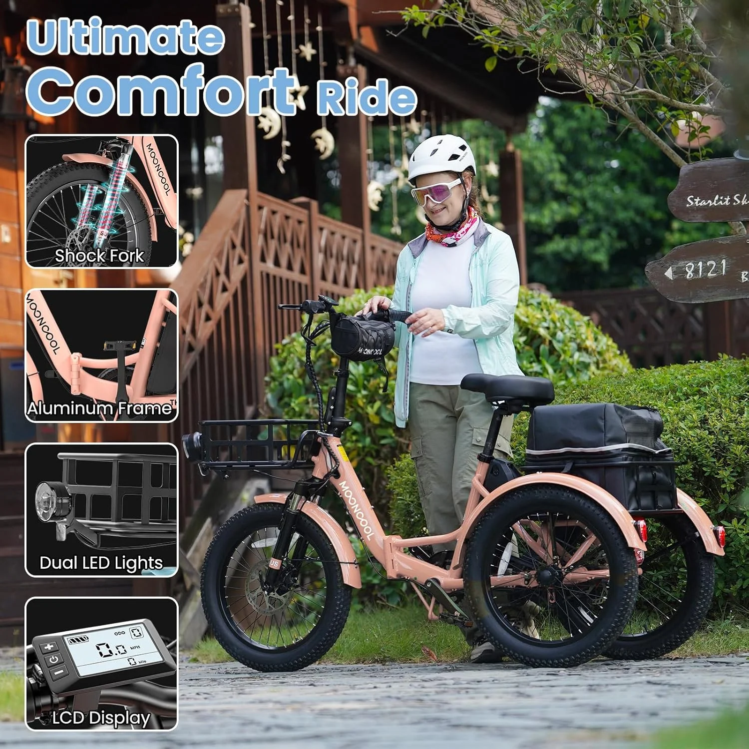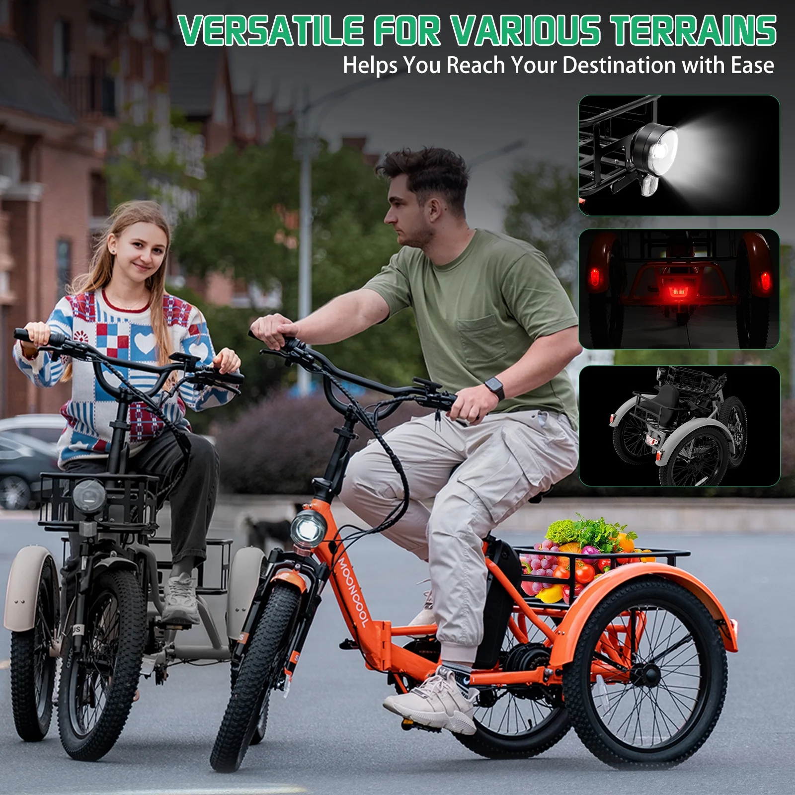 SIZE And Front & Rear basket: 20 inch Adult electric bicycles is suitable for 4.2 to 6.9 ft height; The load capacity of the 3 wheel electric bicycle is 450LBS. MOONCOOL electric tricycle for adults offers a front basket and a large rear basket, perfect for groceries, supplies. The rear basket is designed to be pet-friendly, ensuring a safe and comfortable travel experience for your furry companions.