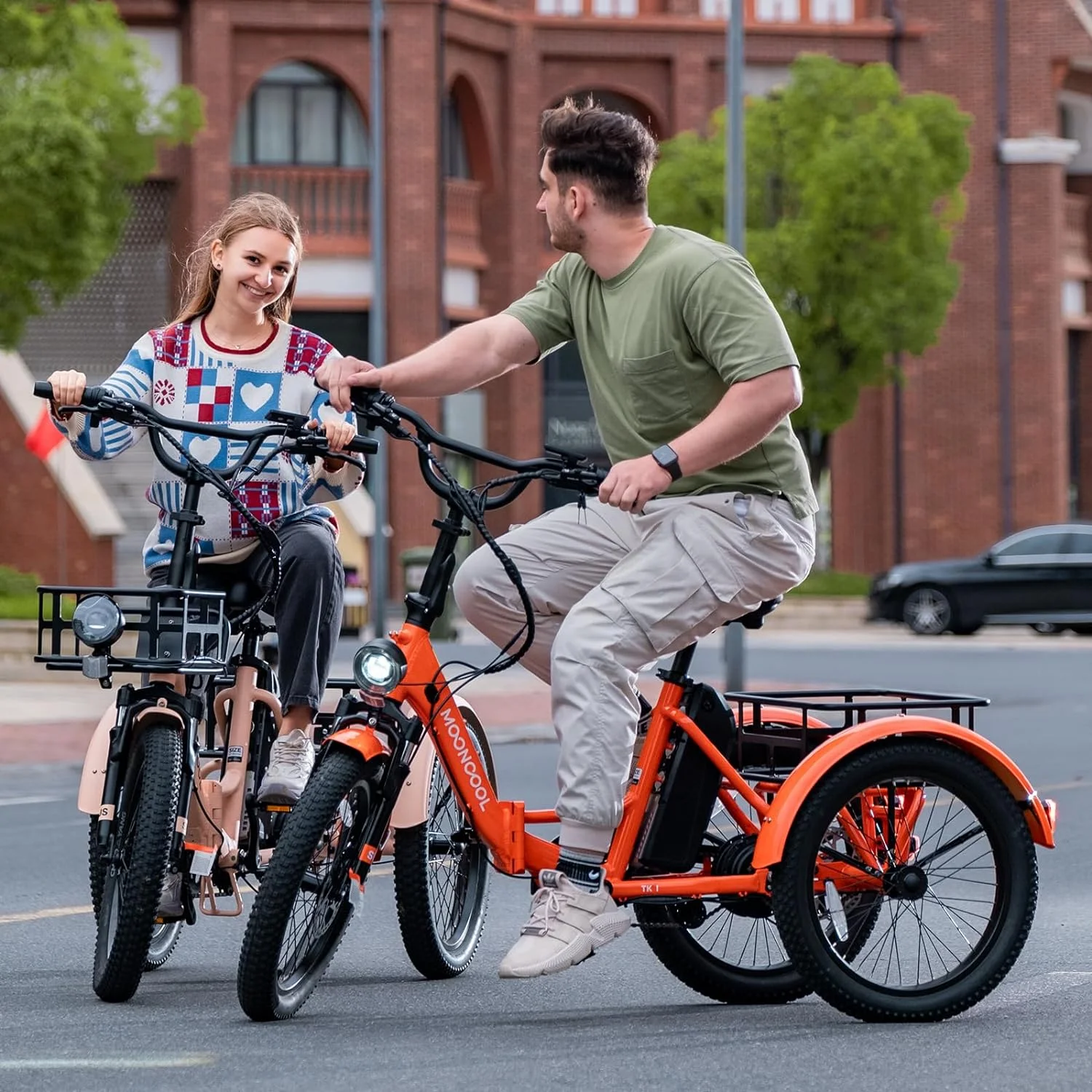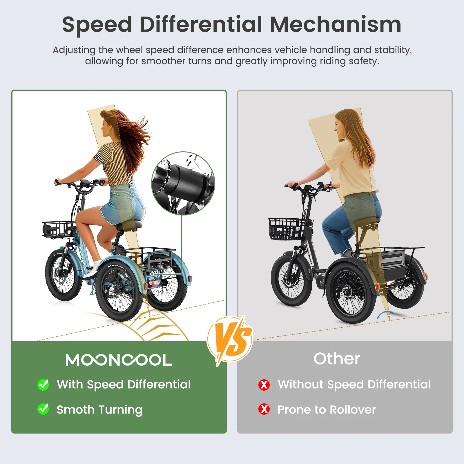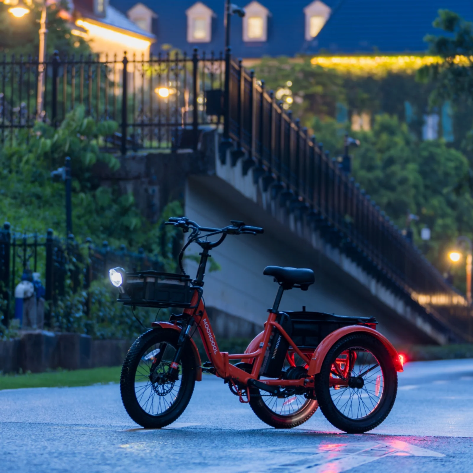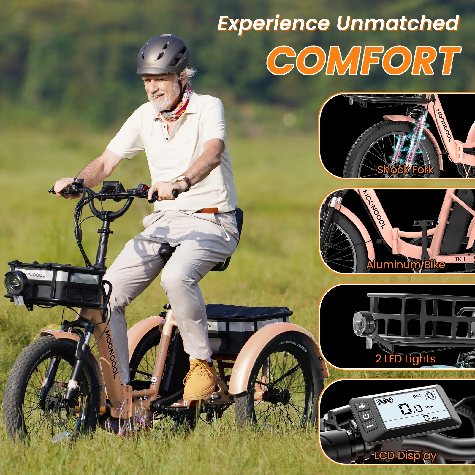 SIZE And Front & Rear basket: 20 inch Adult electric bicycles is suitable for 4.2 to 6.9 ft height; The load capacity of the 3 wheel electric bicycle is 450LBS. MOONCOOL electric tricycle for adults offers a front basket and a large rear basket, perfect for groceries, supplies. The rear basket is designed to be pet-friendly, ensuring a safe and comfortable travel experience for your furry companions.