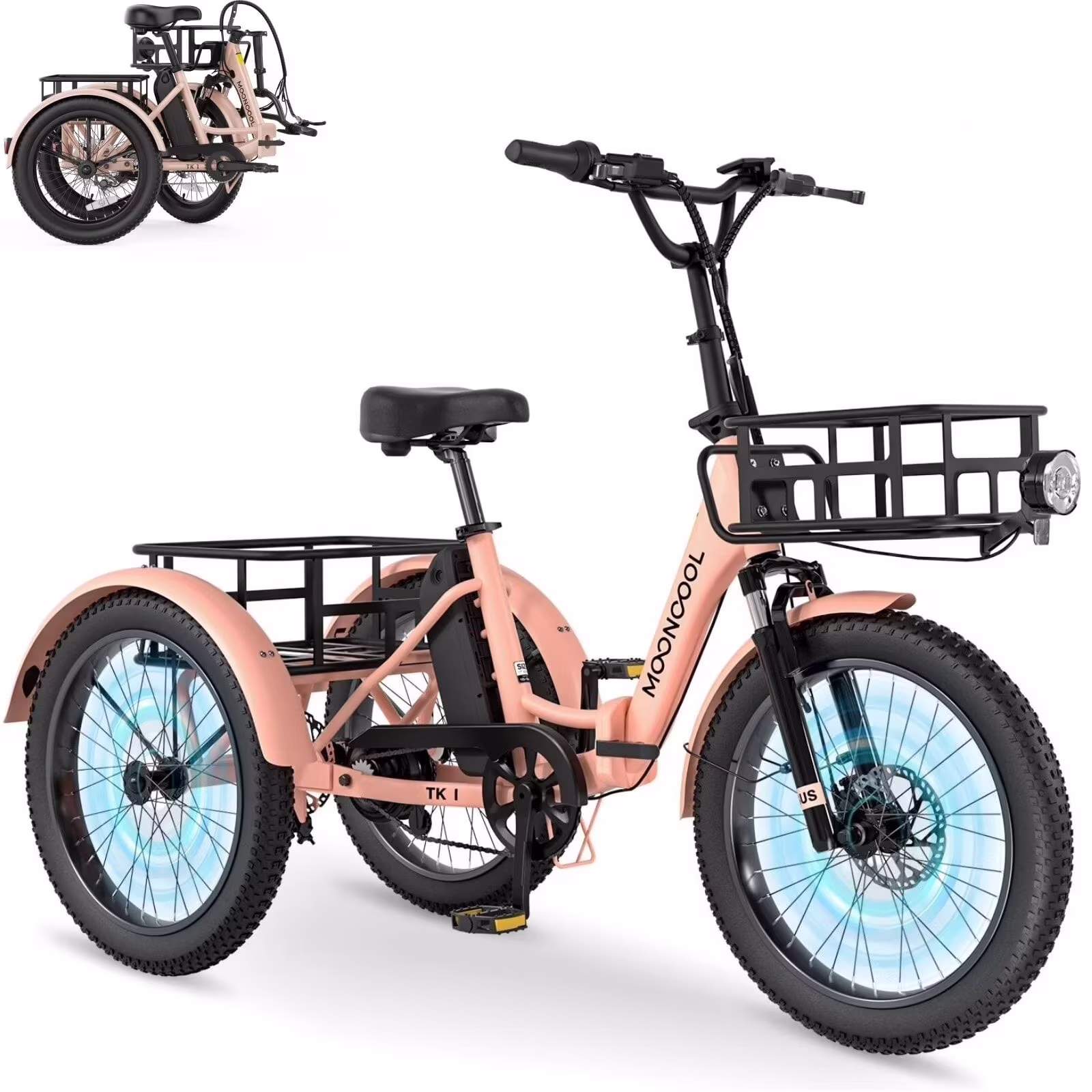 MOONCOOL TK1 Folding Electric Tricycle for Adults, 48V 14.5ah Removable Battery, 500wpeak 1000wmotor, 20" Fat Tire Step - Thru 3wheel Electric Bicycle W/Front&Rear Baskets, Certified to UL 2849 by SGS
