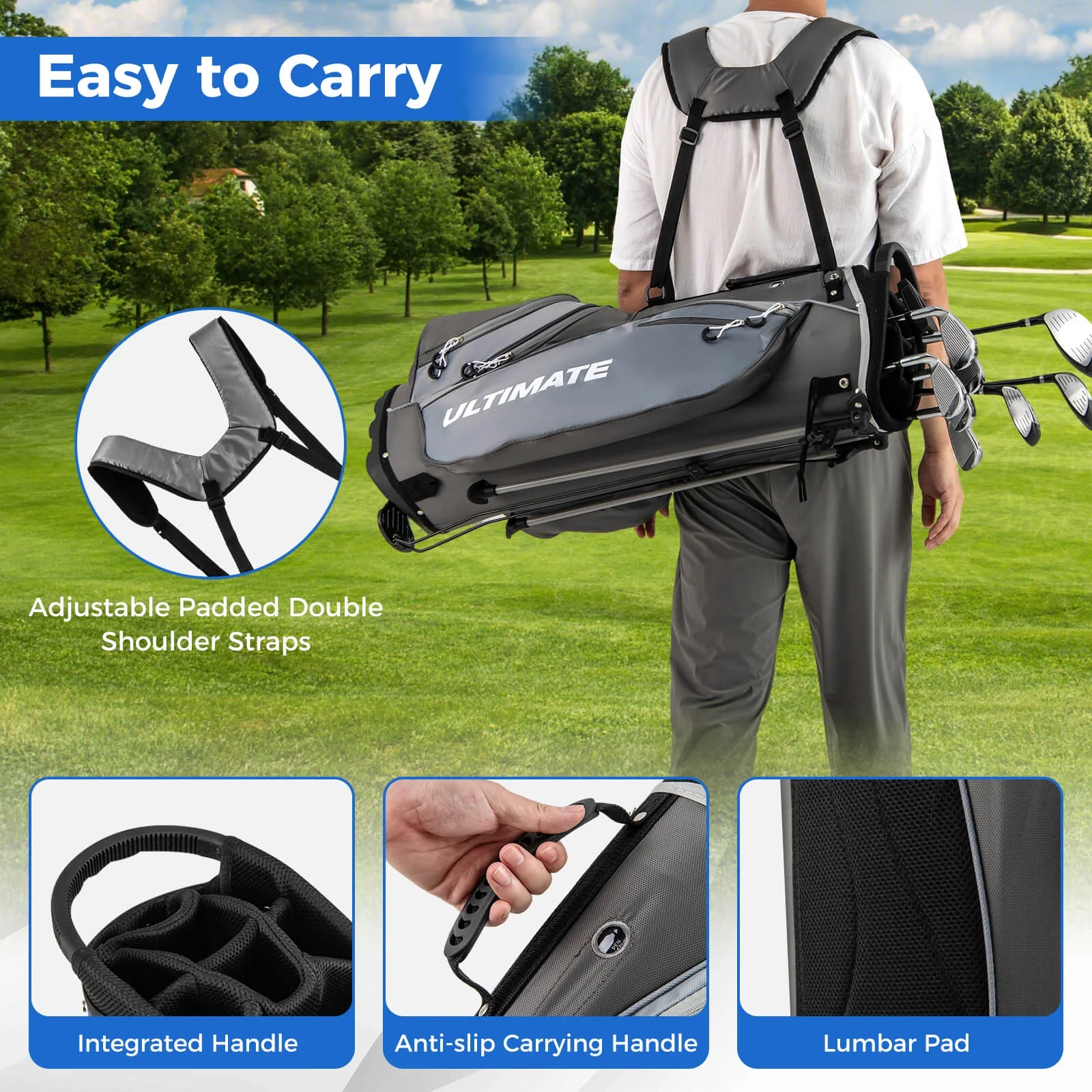 With a convenient stand golf bag to easily carry all clubs