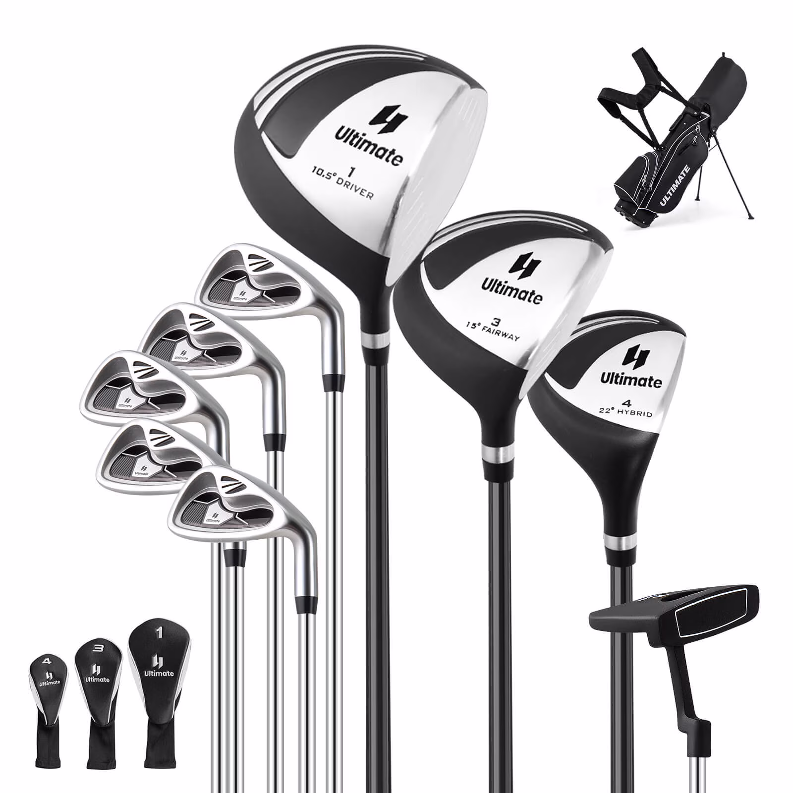 - Completed & Premium Golf Set: The completed golf clubs set with premium components and advanced materials perfectly meets all your needs. This set includes aluminium driver, 3# fairway wood, 4# hybrid, 6#-9# irons, pitching wedge, putter and the lightweight stand bag. Besides, three extra covers well protect the driver and fairway woods.