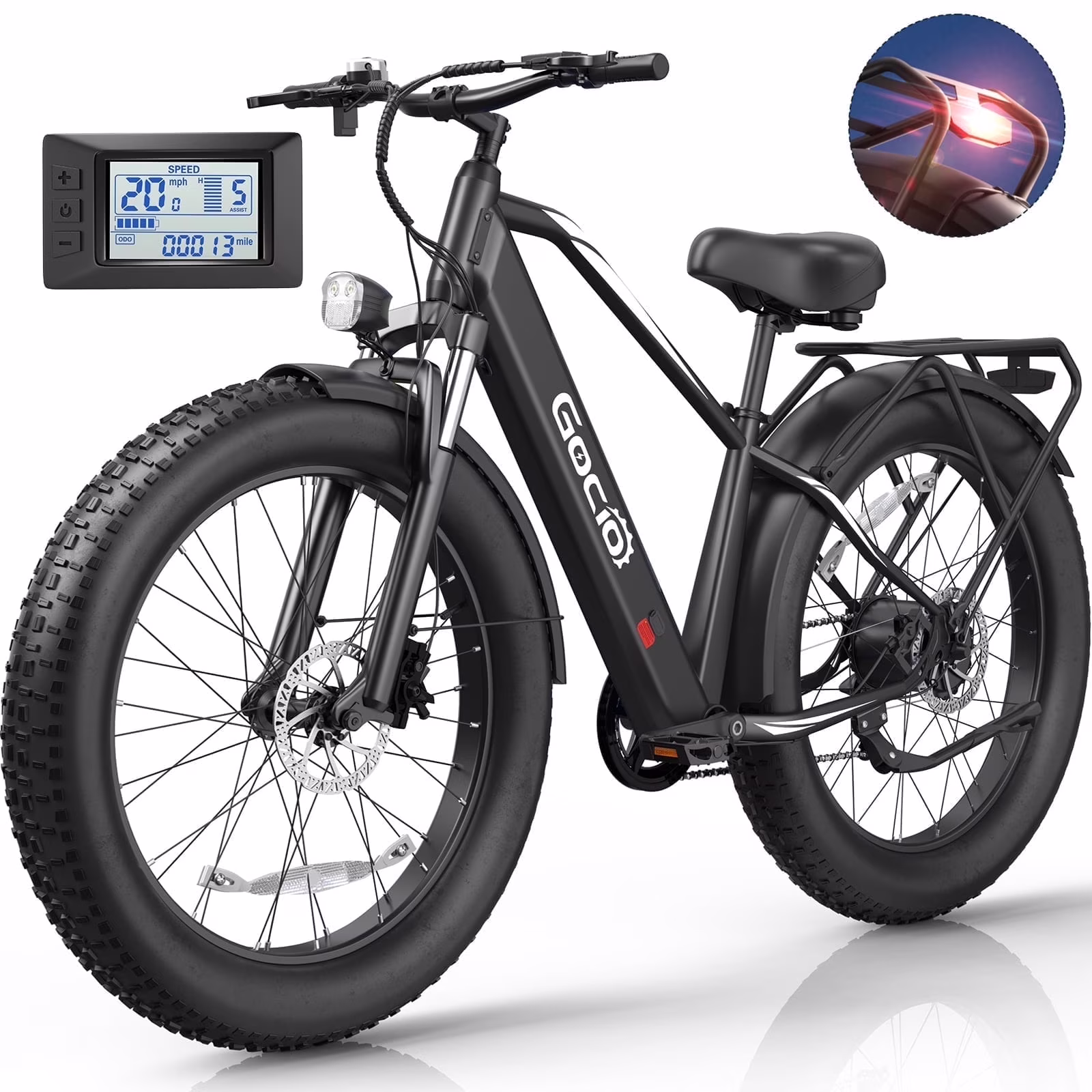 ???��?[INTELLIGENT BUTTON: LCD & HEADLIGHT & TAILLIGHT & HORN] The LCD of this fat tire electric bike 26 inch can clearly display the battery power, 5-speed gears, mileage, and speed on the screen, which is convenient for you to read the latest data during riding. There are separate headlights and horn buttons on the right handlebars. The headlight section has lights and the front reflector is brighter and wider lighting. The taillight part has brake taillight and rear reflector which can play a warning role. Headlight and taillight make you safer at night or in low visibility conditions. The electric horn is easy to operate and does not rely on manpower, and can continue to issue warning sounds, which is more convenient for your life.