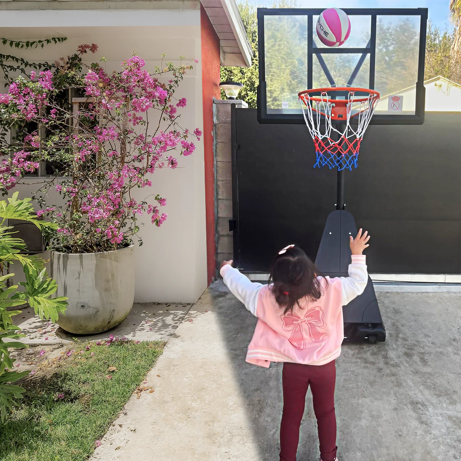 - ???��?[PORTABLE BASKETBALL HOOP]: Built-in 2 durable wheels on base, the portable basketball goal system can be moved indoors/outdoors. Tilting it, you can push it to backyard, driveway or to an indoor gym for a good game of basketball with your families, friends and enjoy exercise time.