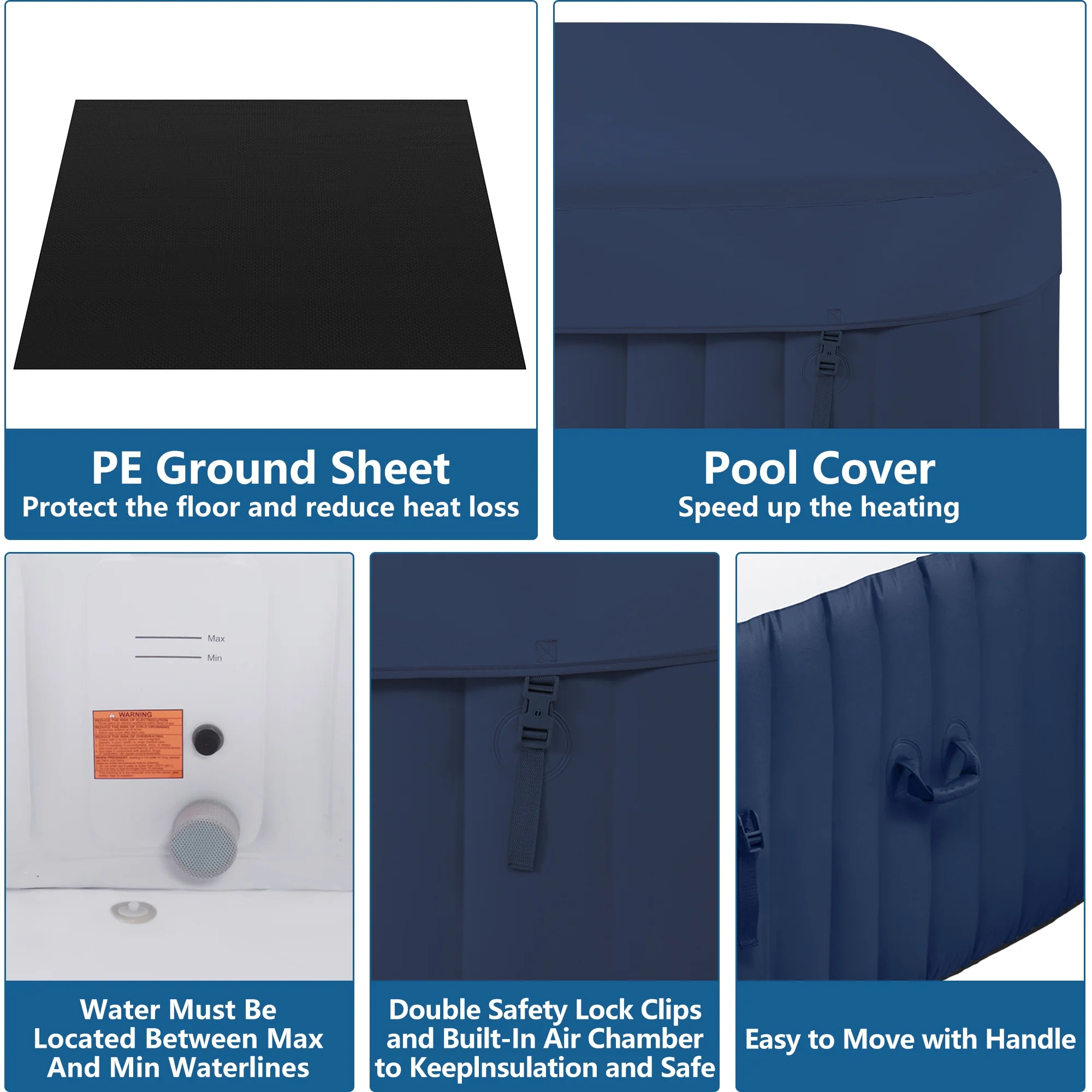 ��Insulated Tub Cover��Inflatable cover provides extra insulation and minimizes heat loss; this cover will help protect your Hot Tub from rainwater pooling. Temperature up to 104��F.