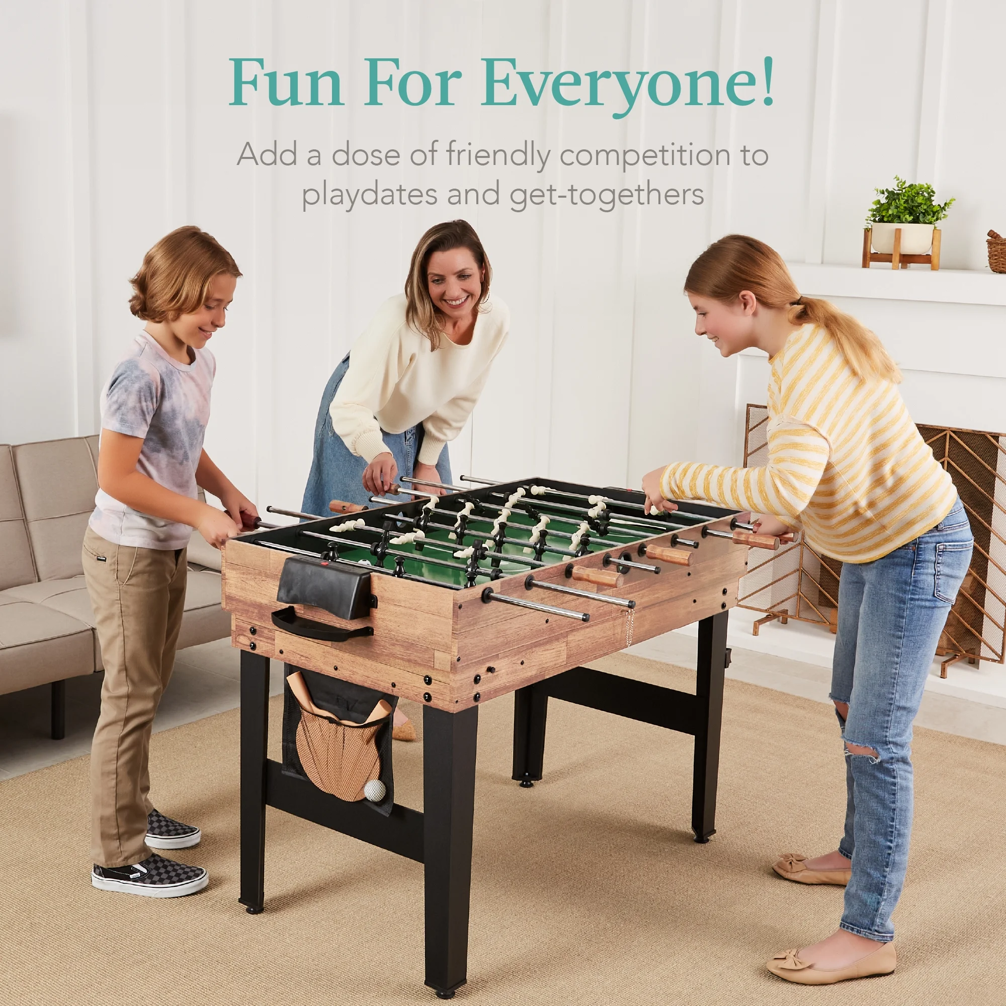 - STURDY BUILD: 4 sturdy wooden legs sit on adjustable non-slip feet for added stability; natural wood handles on the foosball table complete this set with functional charm; all materials are ASTM & CPSIA-certified