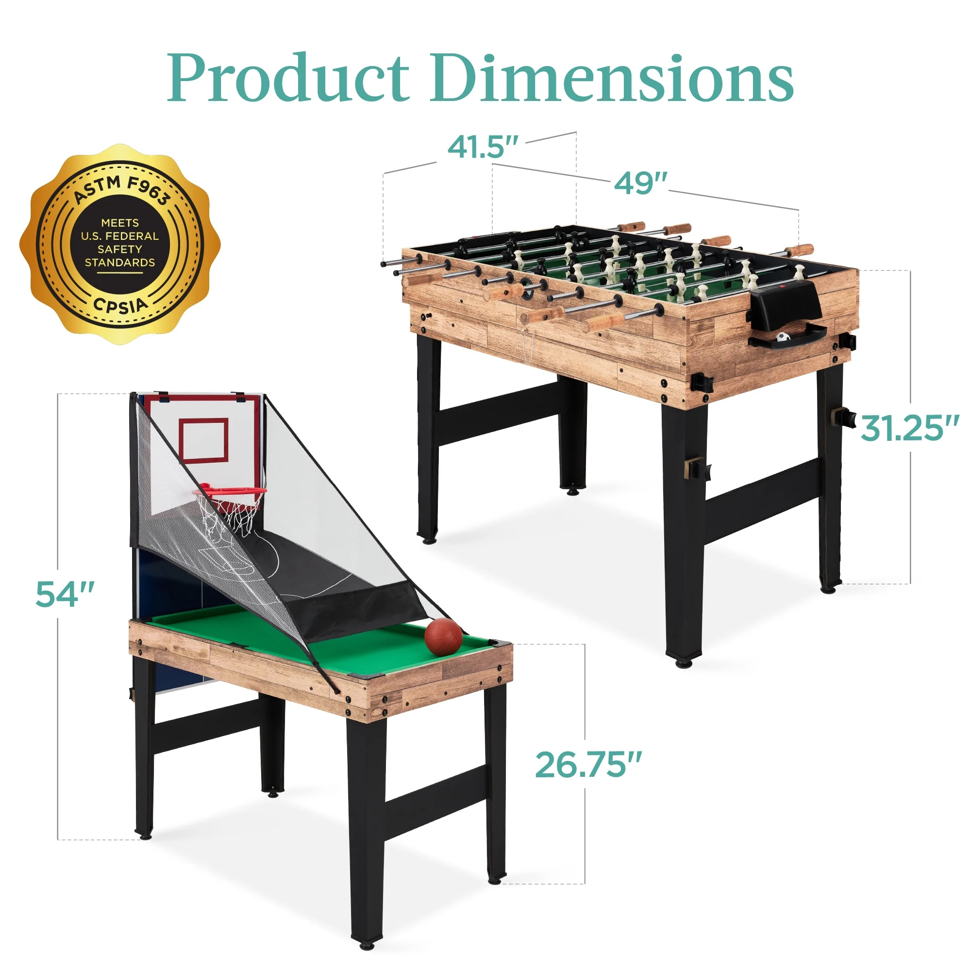 - ALL ACCESSORIES INCLUDED: Comes complete with over 50 accessories for you and your guests to enjoy every game to their fullest; chess, checkers, billiards, and even a bow and arrow set await!; OVERALL DIMENSIONS: 49"(L) x 41.5"(W) x 31.25"(H)