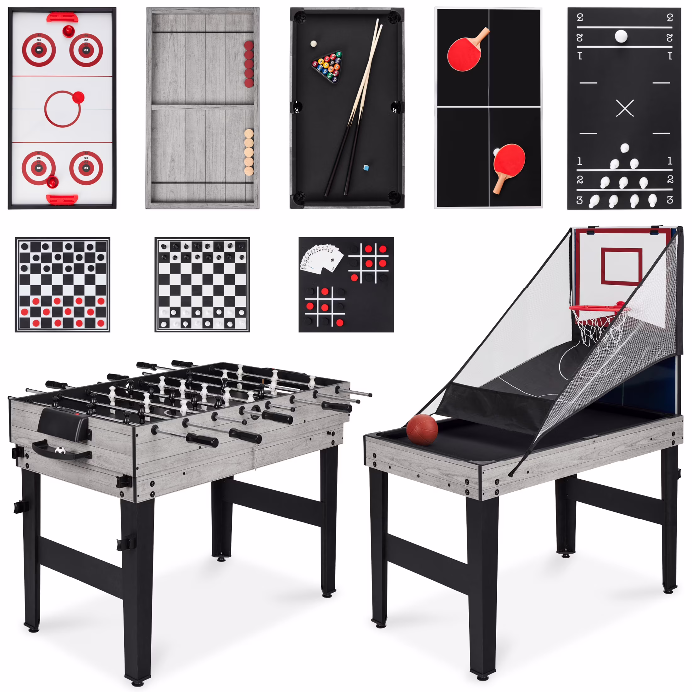 - VERSATILE 13-IN-1 TABLE: Interchangeable play fields let you play hockey, foosball, billiards, shuffleboard, ping pong, chess, cards, checkers, bowling, sling puck, basketball, tic-tac-toe, and archery; Billiards and ping pong are not regulation size