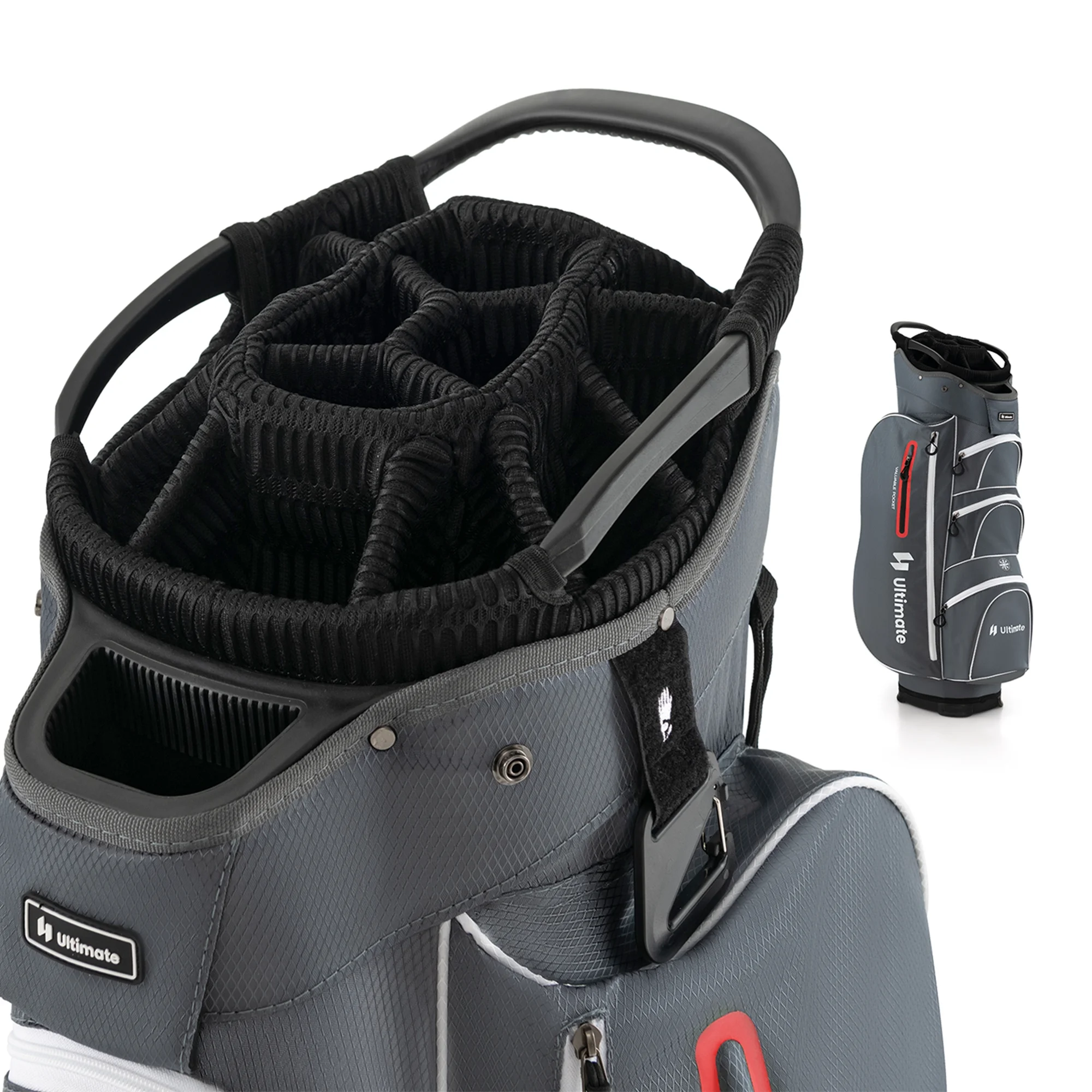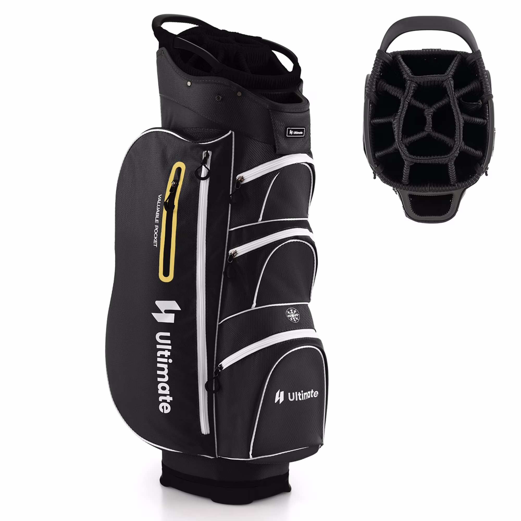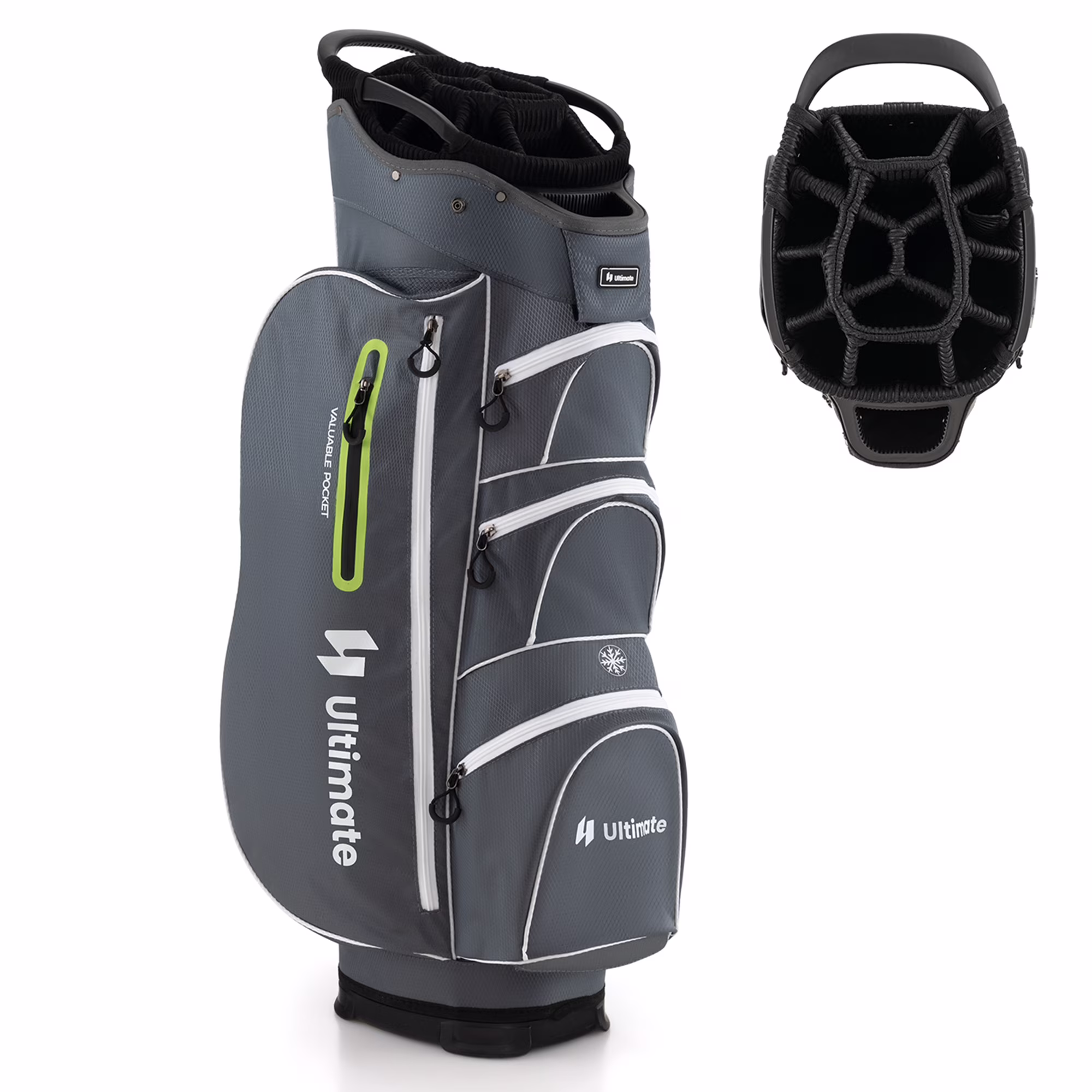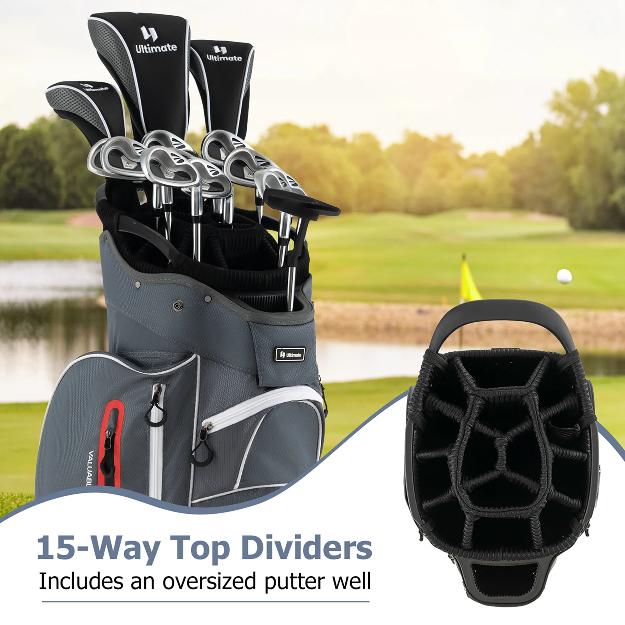 - 15-Way Top Dividers: The top organizer is divided into 15 ways, which includes an oversized putter well. So, this golf cart bag provides roomy space for all your golf clubs and protects them from colliding or scratching each other. Note: golf clubs are not included in the package.