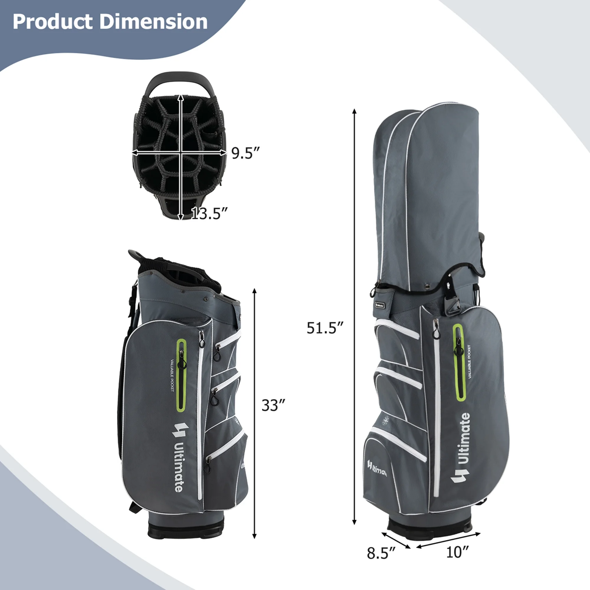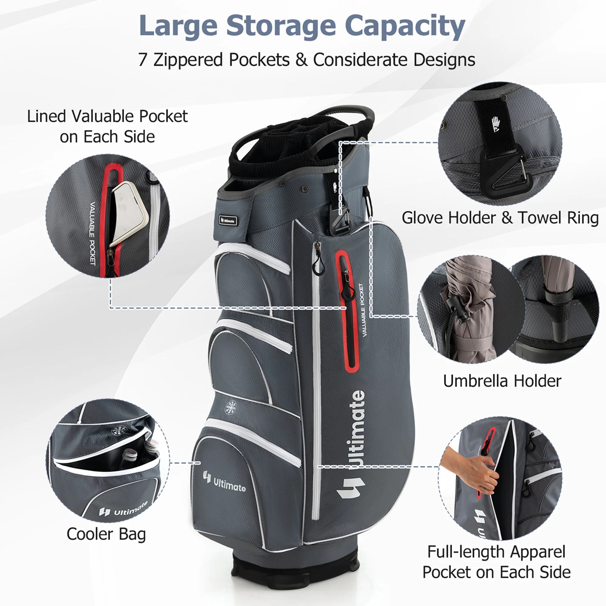 - Large Storage Capacity: This golf club bag is designed with 7 zippered pockets to store various golfing equipment and accessories, including a cooler bag, a lined valuable pocket and a full-length apparel pocket on each side.