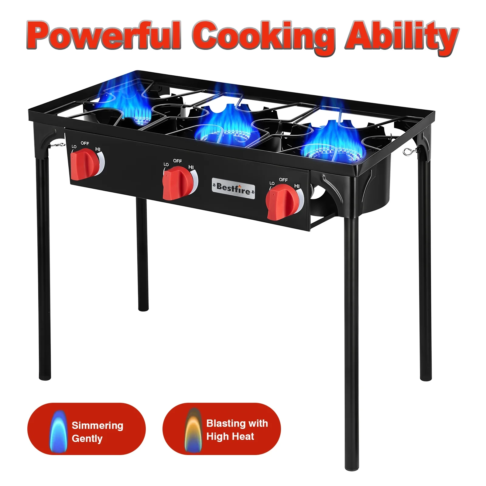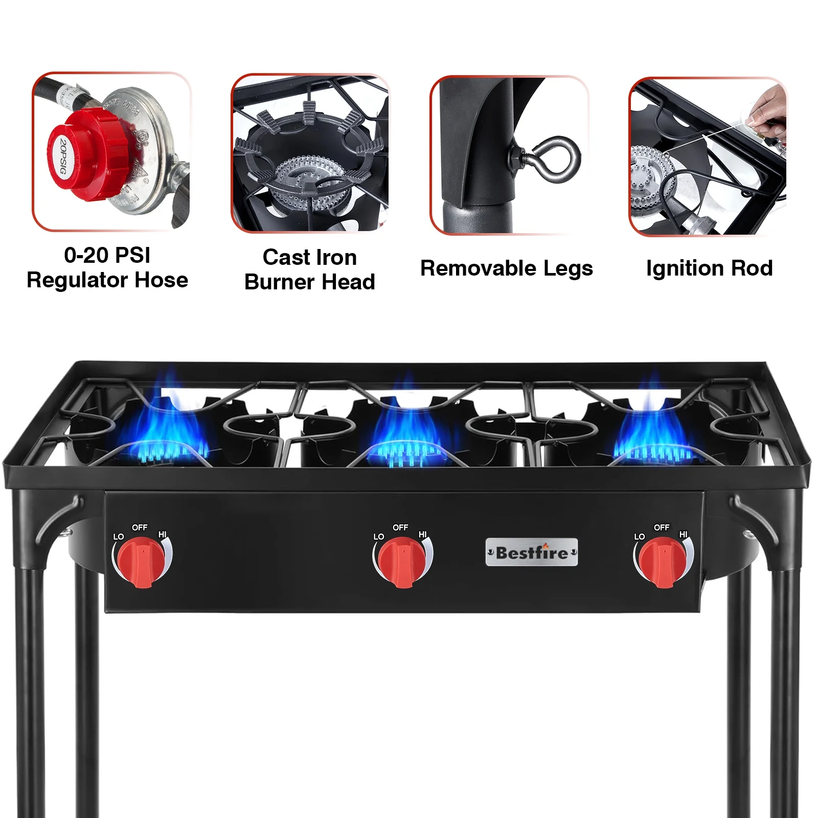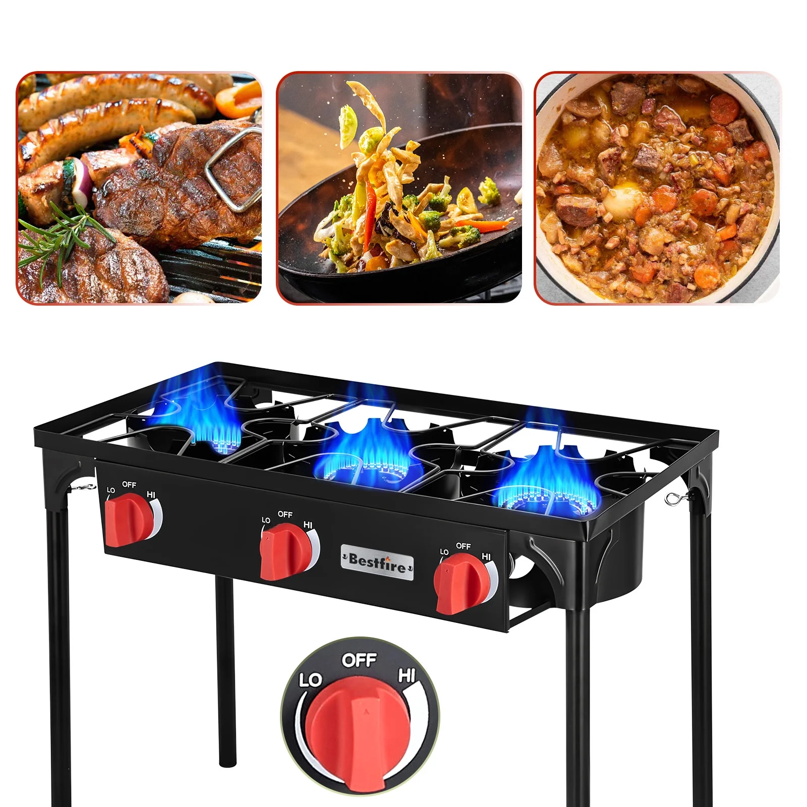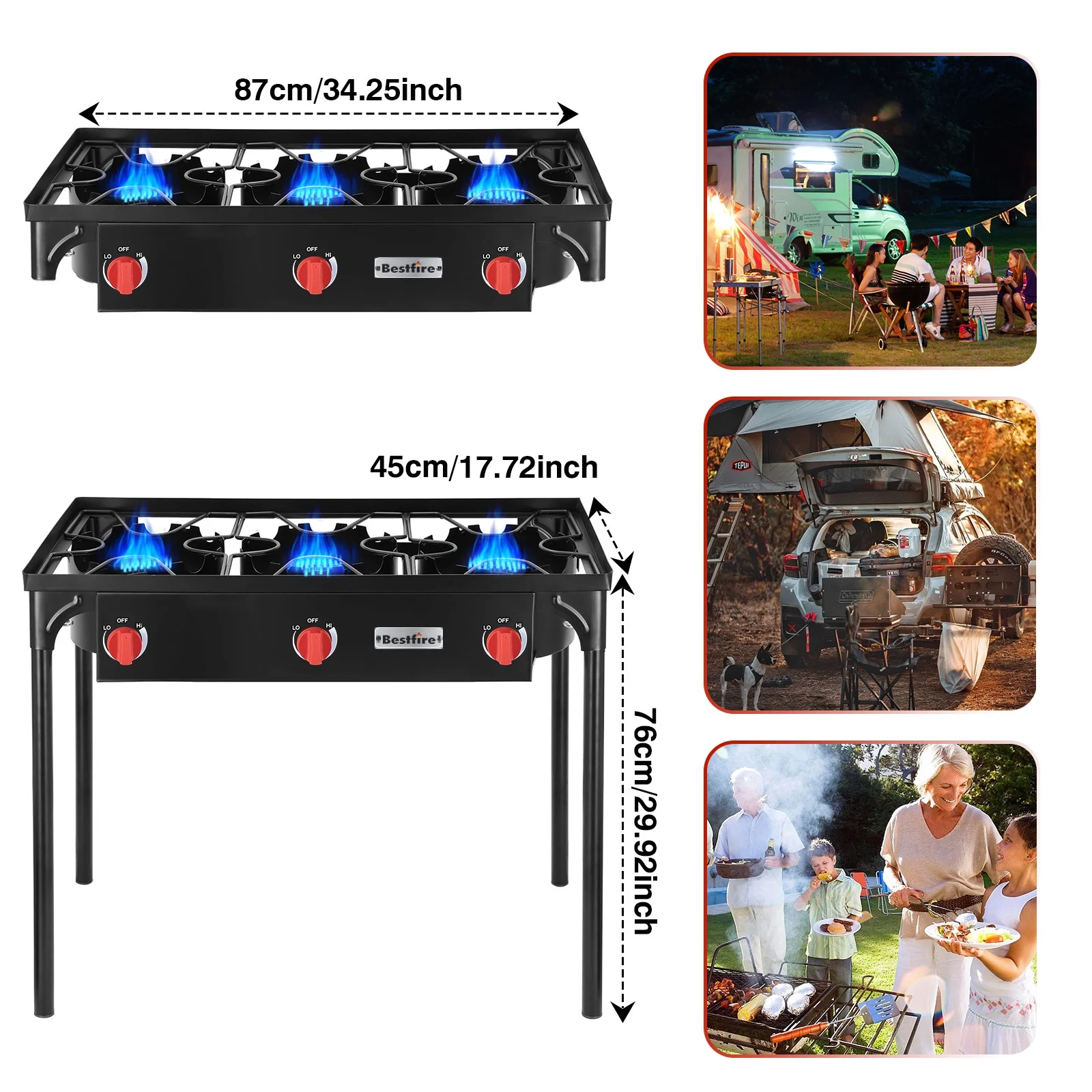 - ��Perfect Three Burners��Independent burners can control each specific flame perfectly. You can boil water and fry steak at the same time. The pressure regulator of the outdoor cooker propane gas stove can meet your precise heat needs