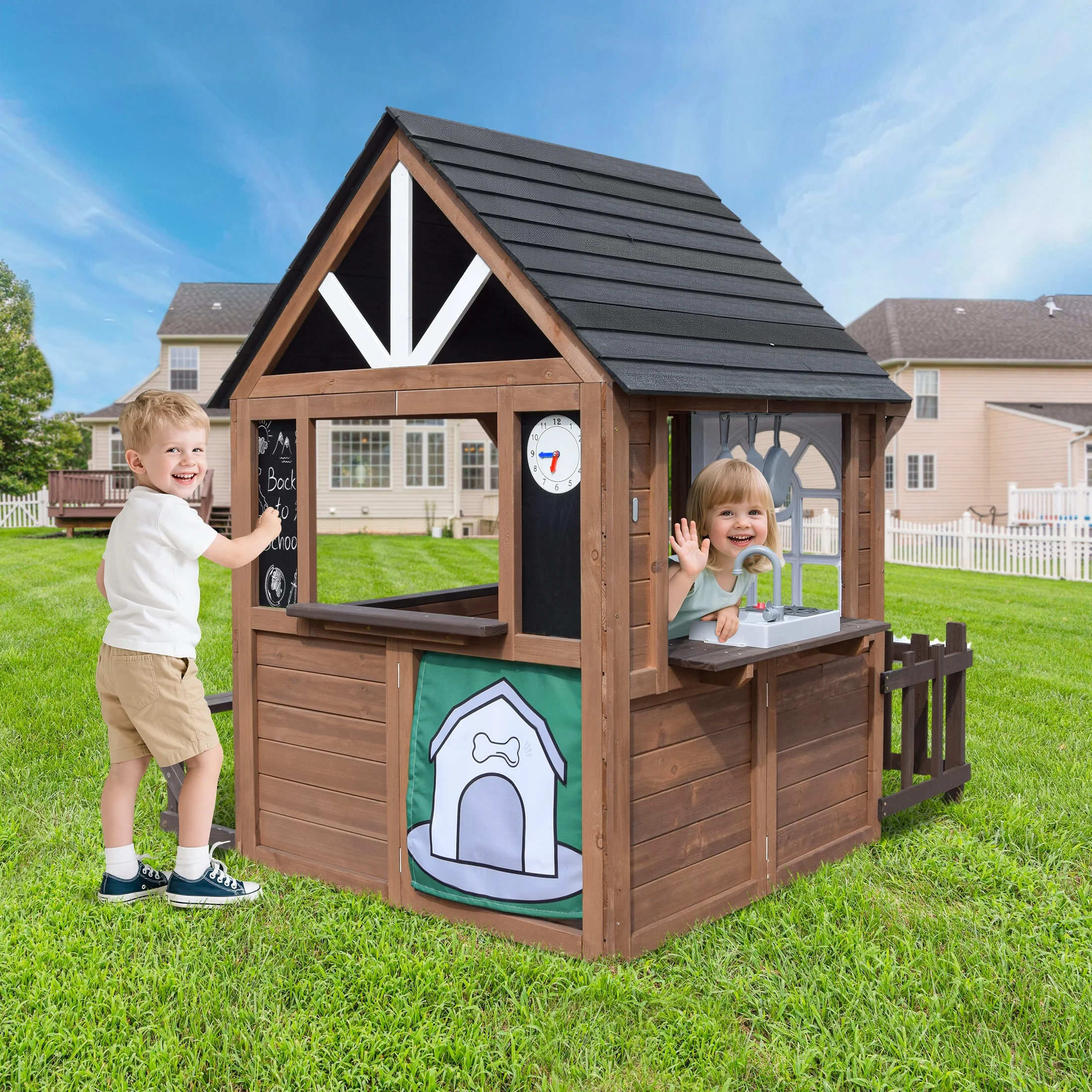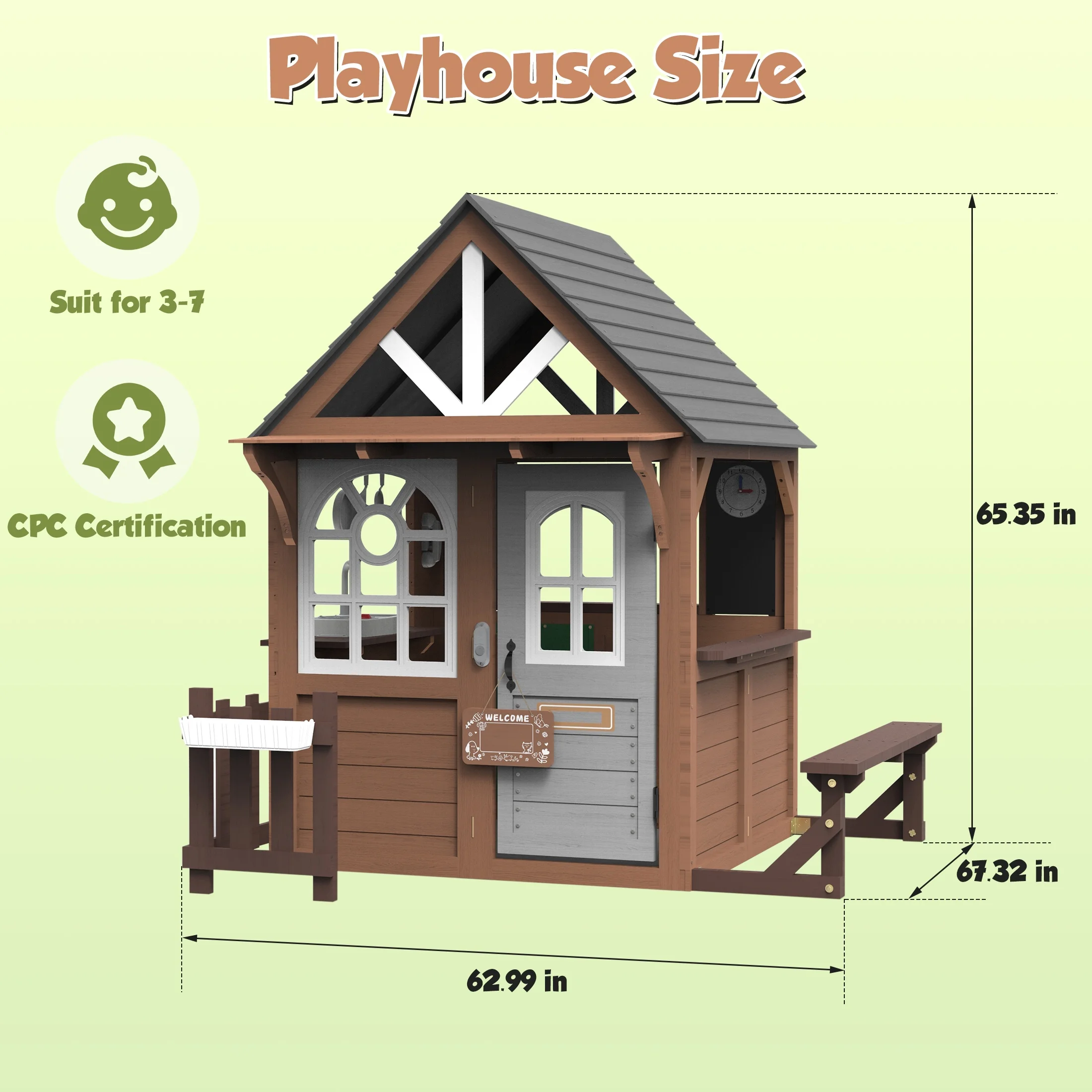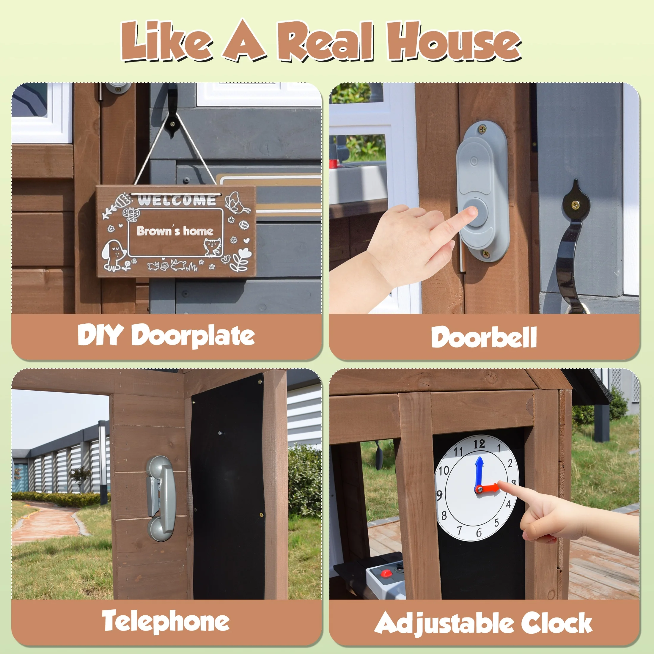 Imagine a world of endless possibilities right in your backyard with our exquisite wooden playhouse. Designed with a sophisticated blend of deep brown and gray, this kids playhouse is crafted from high-quality wood, ensuring durability and timeless appeal. Children will love the quaint charm of their own private retreat, complete with a welcoming fence and a cozy bench for outdoor relaxation. Inside, the outdoor playhouse features a delightful kitchen setup, including a pretend faucet and sink, a simulated stovetop, and a set of three plastic cooking utensils, perfect for aspiring young chefs. The realistic details continue with window sills for imaginative play, a special dog door for pet-friendly fun, and a customizable door nameplate for a personal touch. Kids can let their creativity soar on the chalkboard or learn to manage time with the two engaging plastic clock faces. The playhouse is equipped with a pretend doorbell and a pretend phone, adding layers of interaction and role-playing excitement. This outdoor kids play equipment is not just a play area but a space where children can explore, learn, and create lifelong memories with outdoor toys.