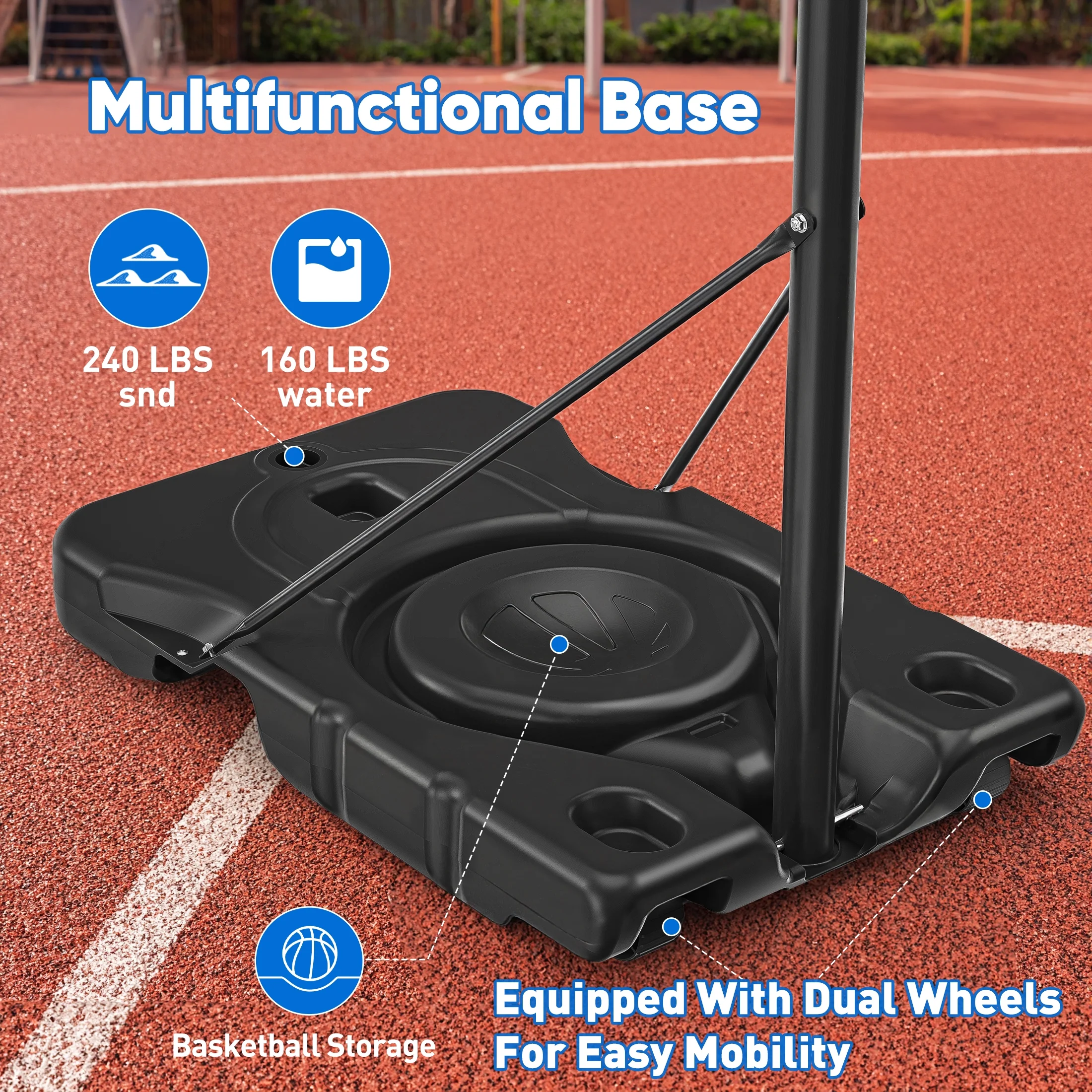 - Stable Design - Stability is crucial for any basketball system, and the Edx outdoor hoop system delivers a sturdy base and robust construction. The base can be filled with water or sand to ensure it stays firmly in place, even during intense play. Enjoy a stable and secure basketball setup for hours of uninterrupted fun