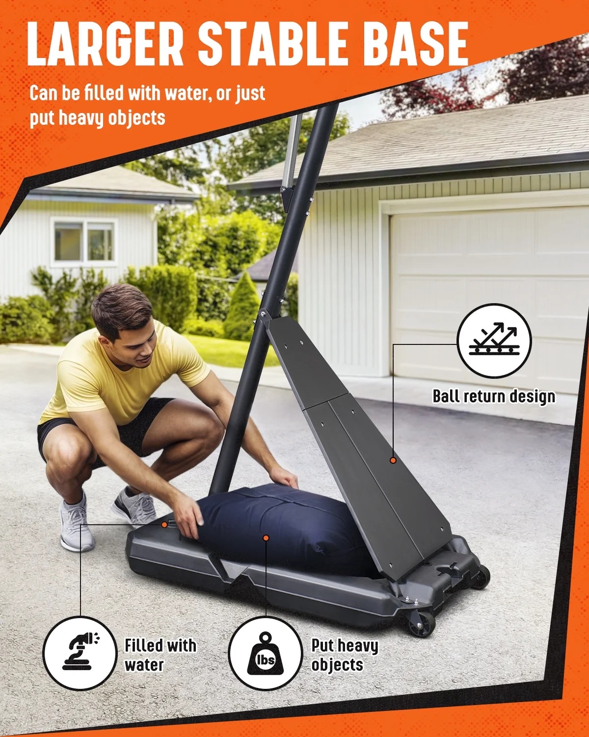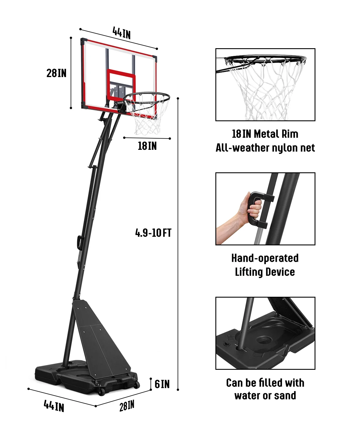 - ��Stable Base and Structure��The high-strength PE material base has a large capacity, which can be filled with 48 kg water for stability and can also withstand the pressure of heavy objects such as sand bags. The triangular structure formed by the pole and the base can greatly increase the safety and prevent the portable basketball hoop from tipping over.